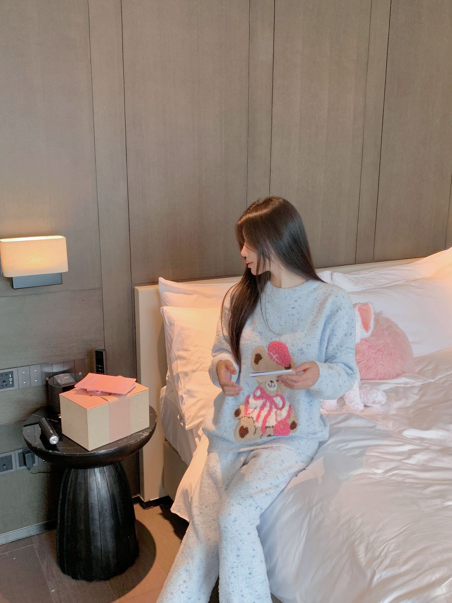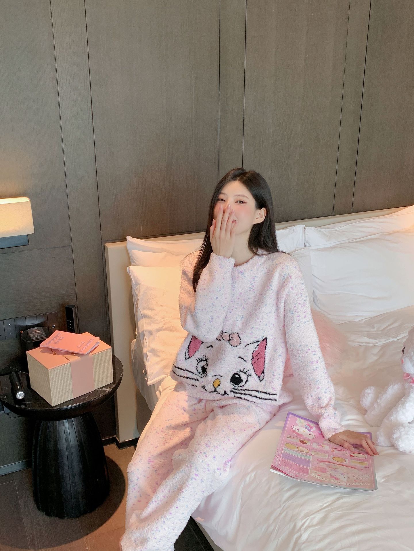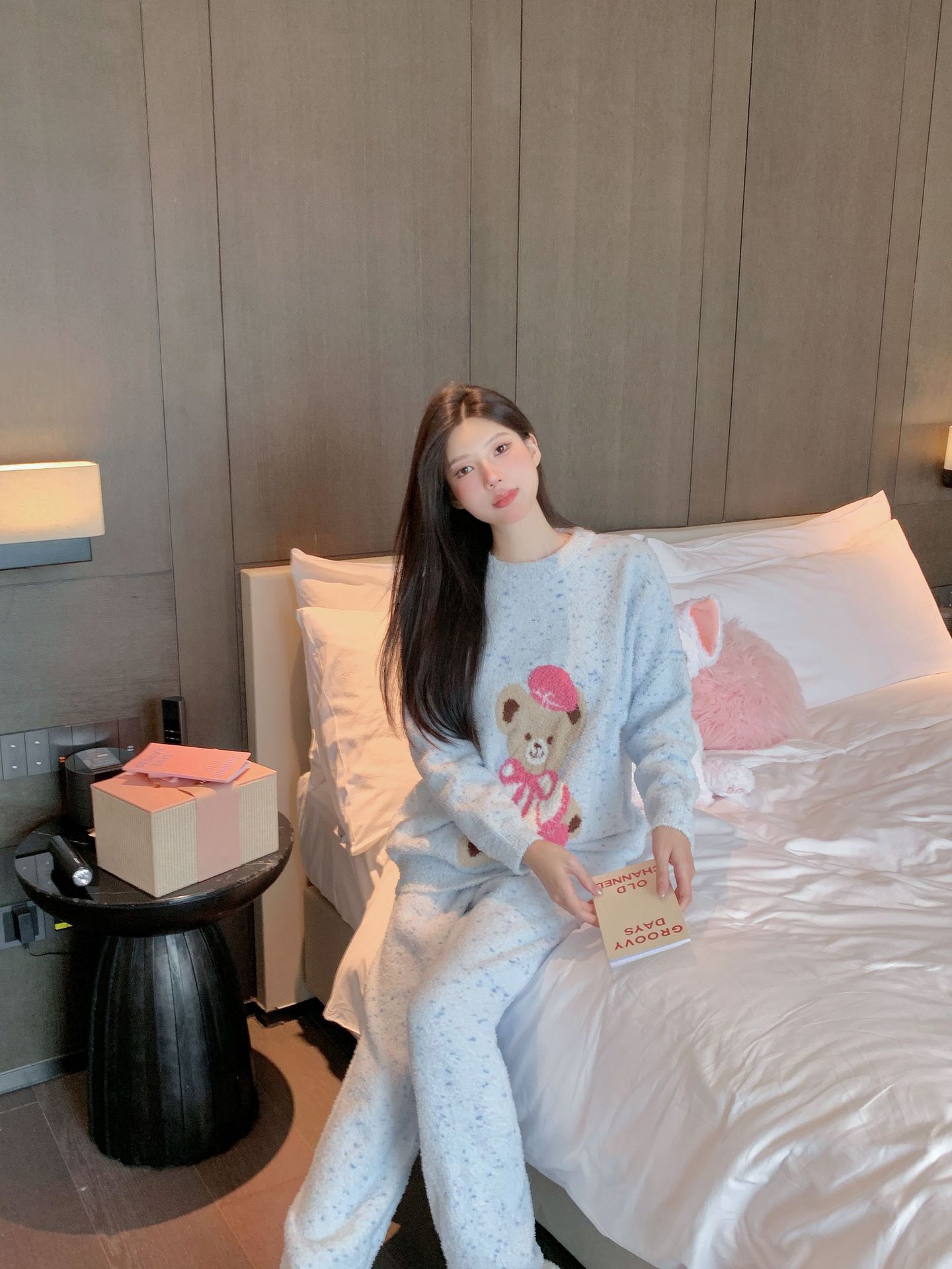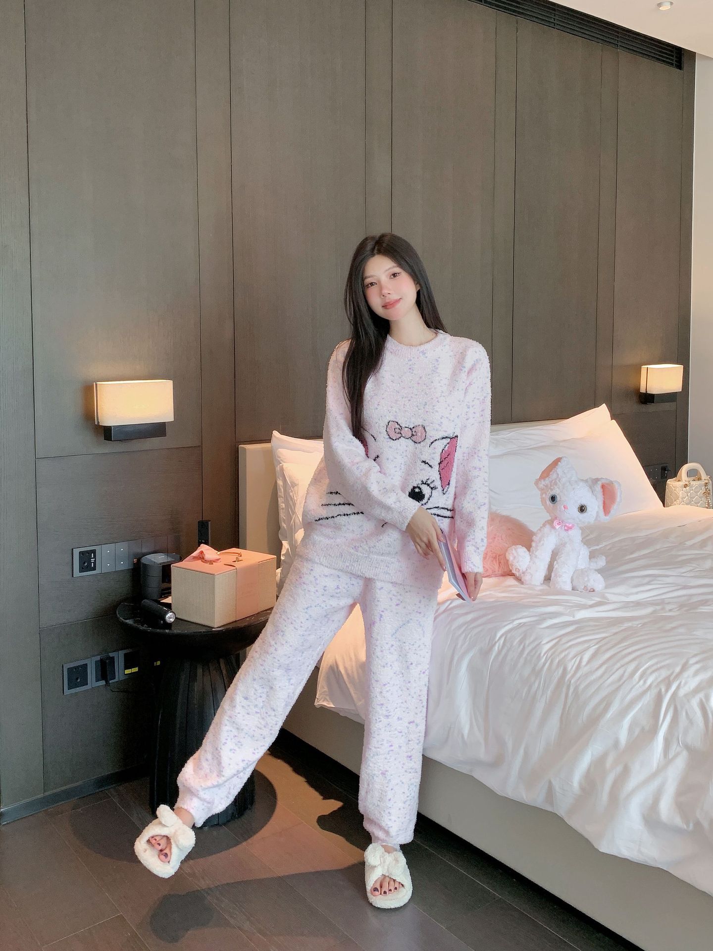 Compra Pijamas de otoño e invierno para mujer de dibujos animados dulces de cuello redondo tipo jersey de forro polar coral de dibujos animados cálido se puede usar afuera conjunto para estar en casa al por mayor en Joom.pro