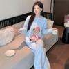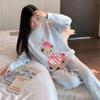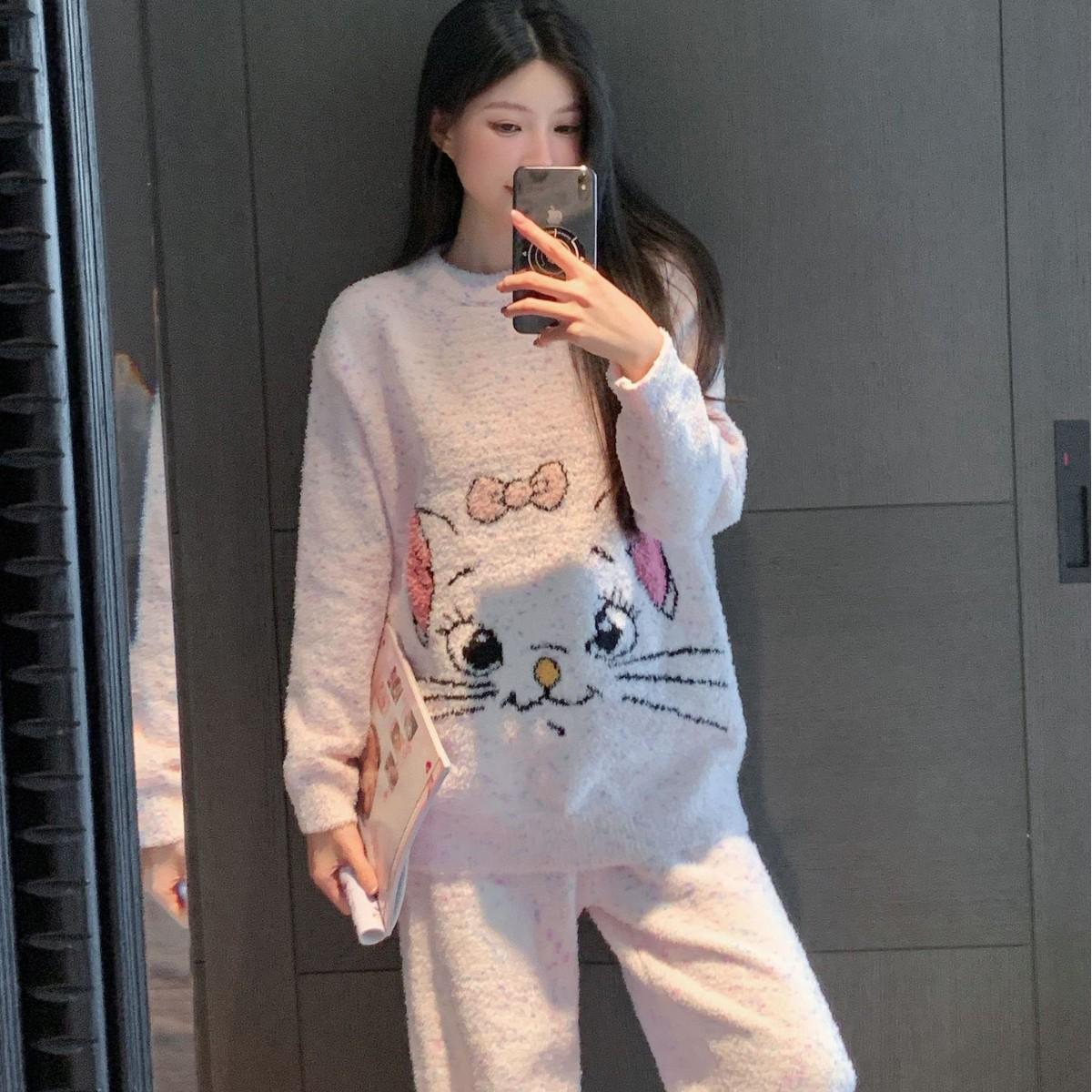Pijamas de otoño e invierno para mujer de dibujos animados dulces de cuello redondo tipo jersey de forro polar coral de dibujos animados cálido se puede usar afuera conjunto para estar en casa