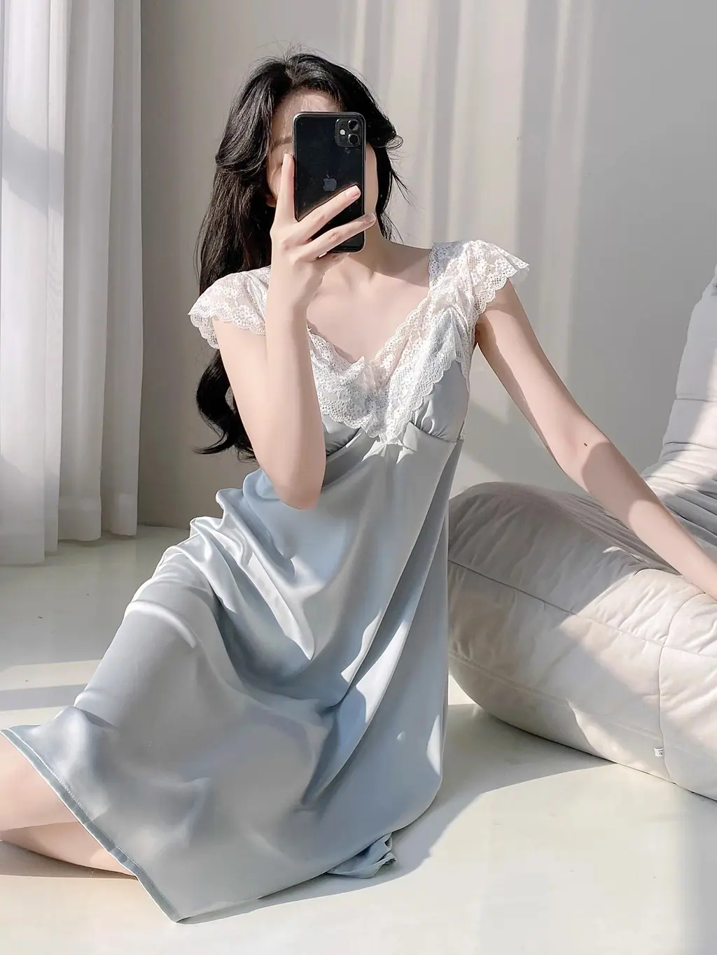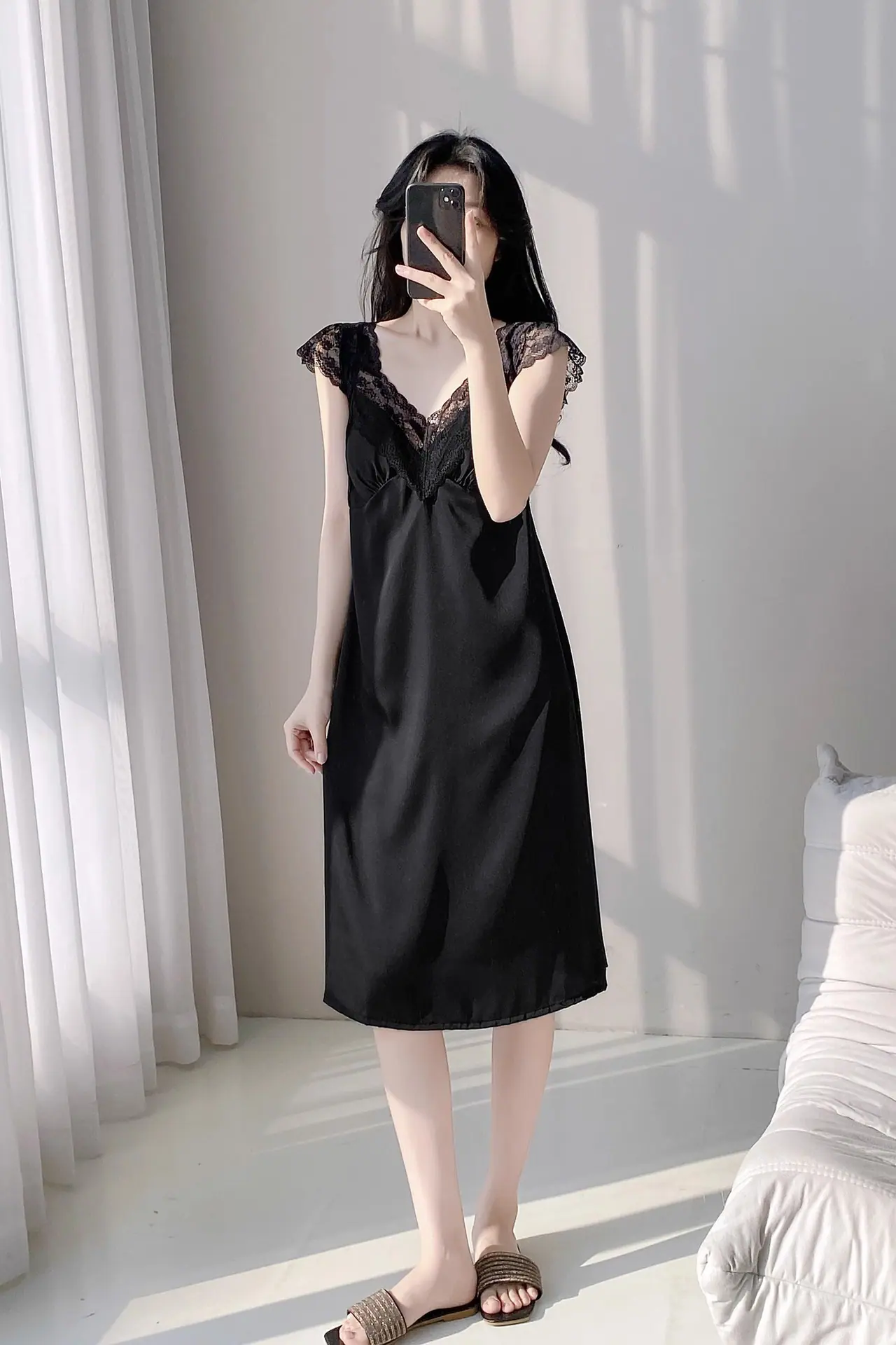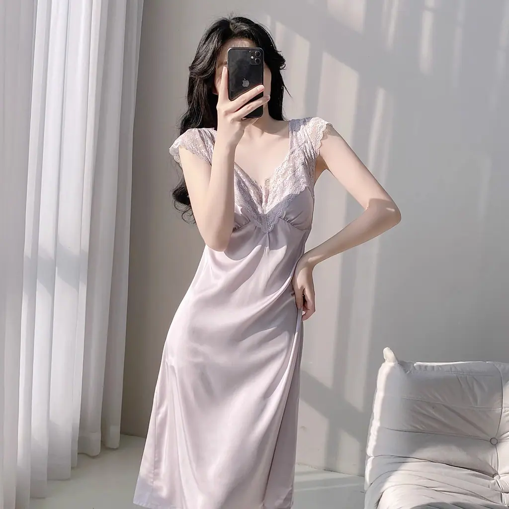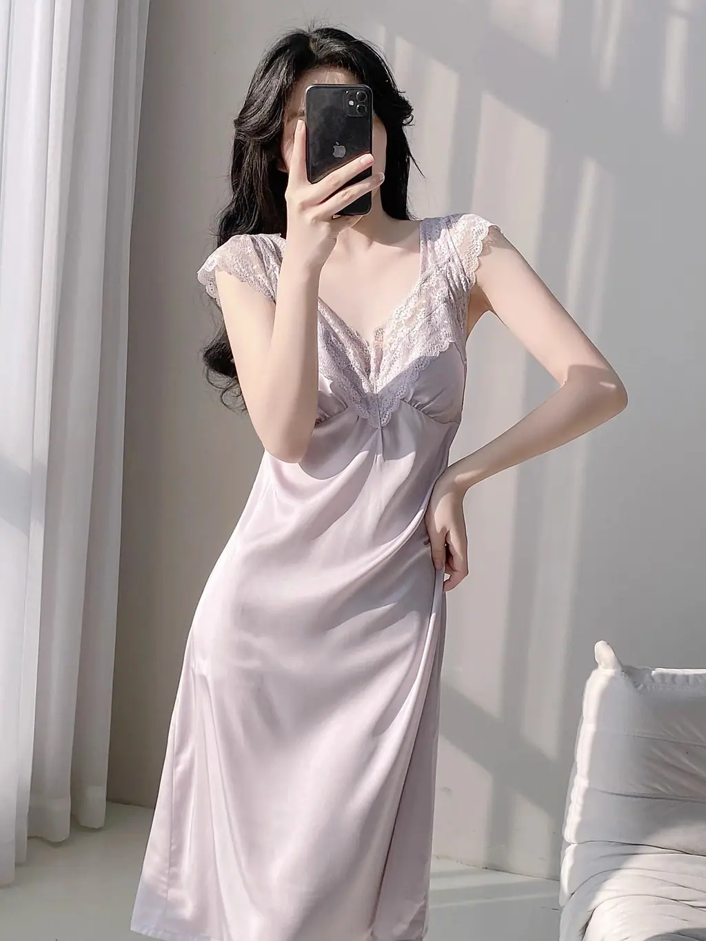 Vestido Largo de Verano de Seda de Hielo para Mujer Camisola Vestido de Noche Deseo Puro Sexy Encaje Francés con Almohadilla en el Pecho de Una Pieza Primavera y Otoño Ropa para el Hogar