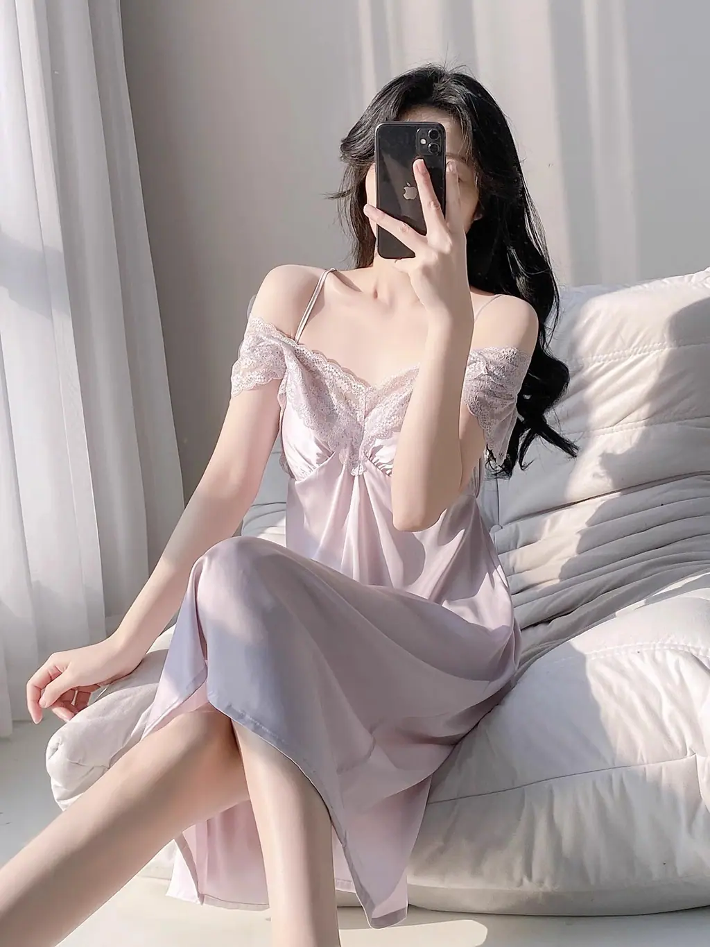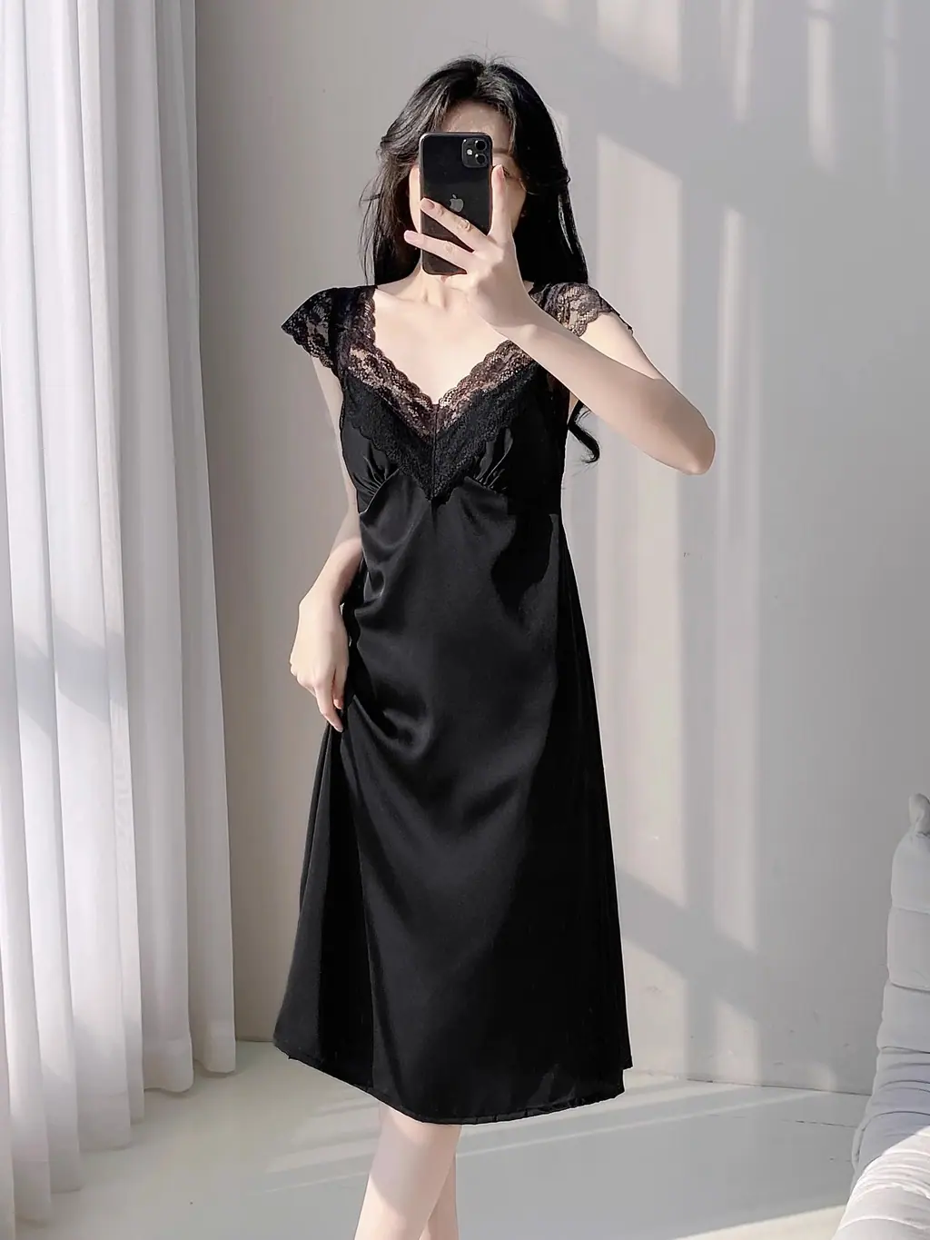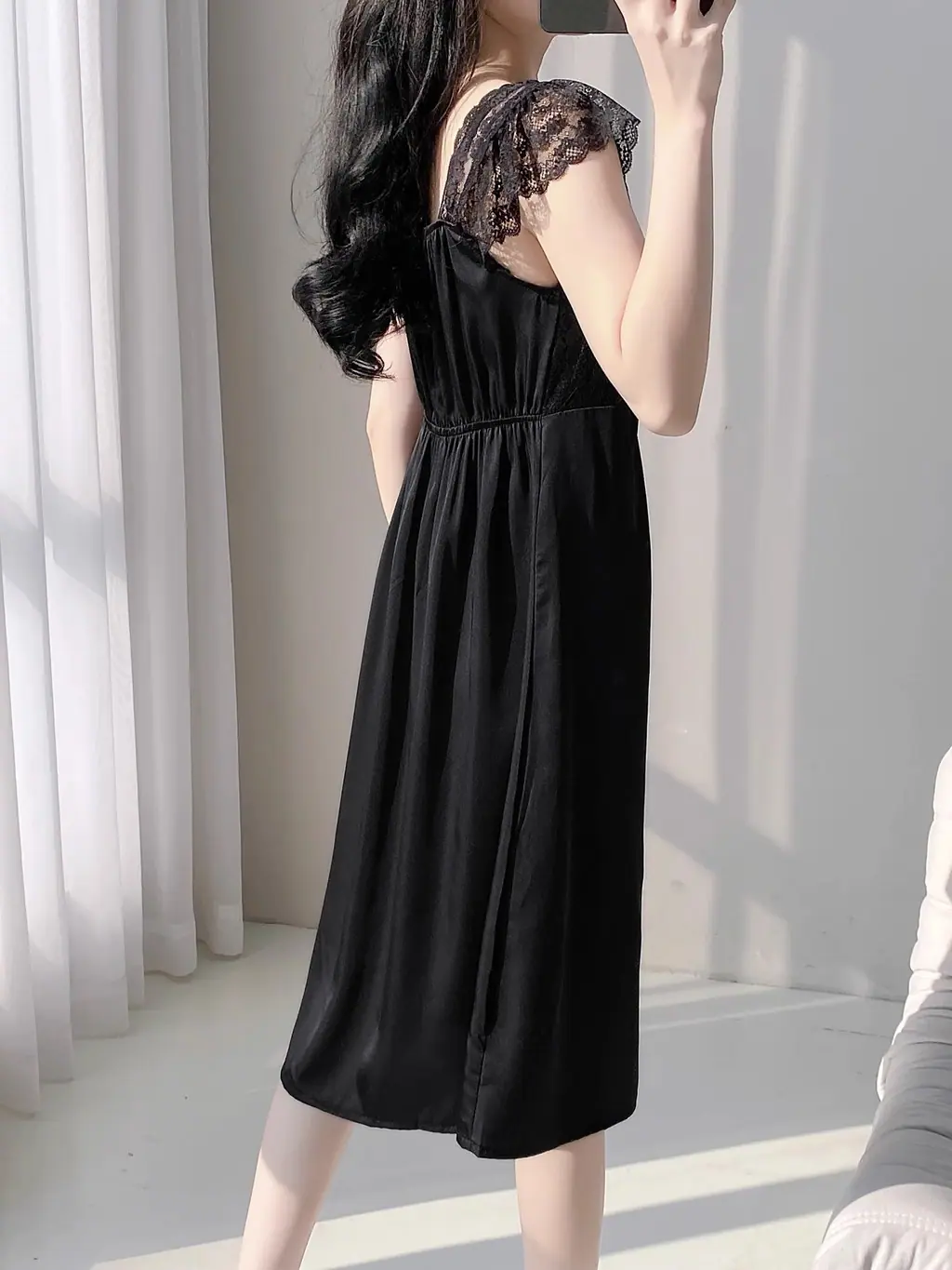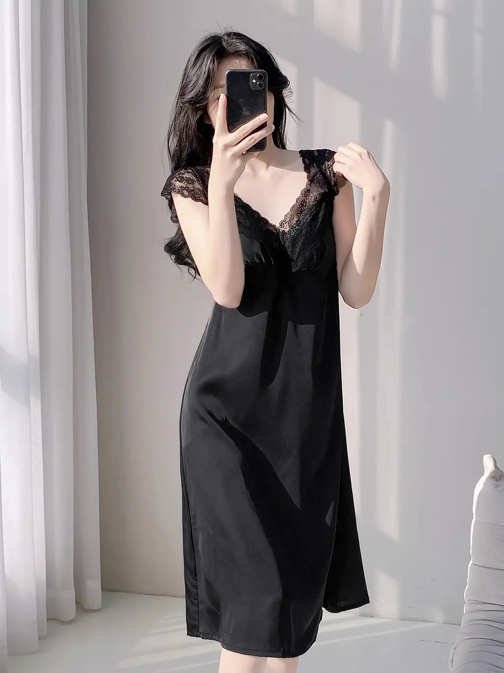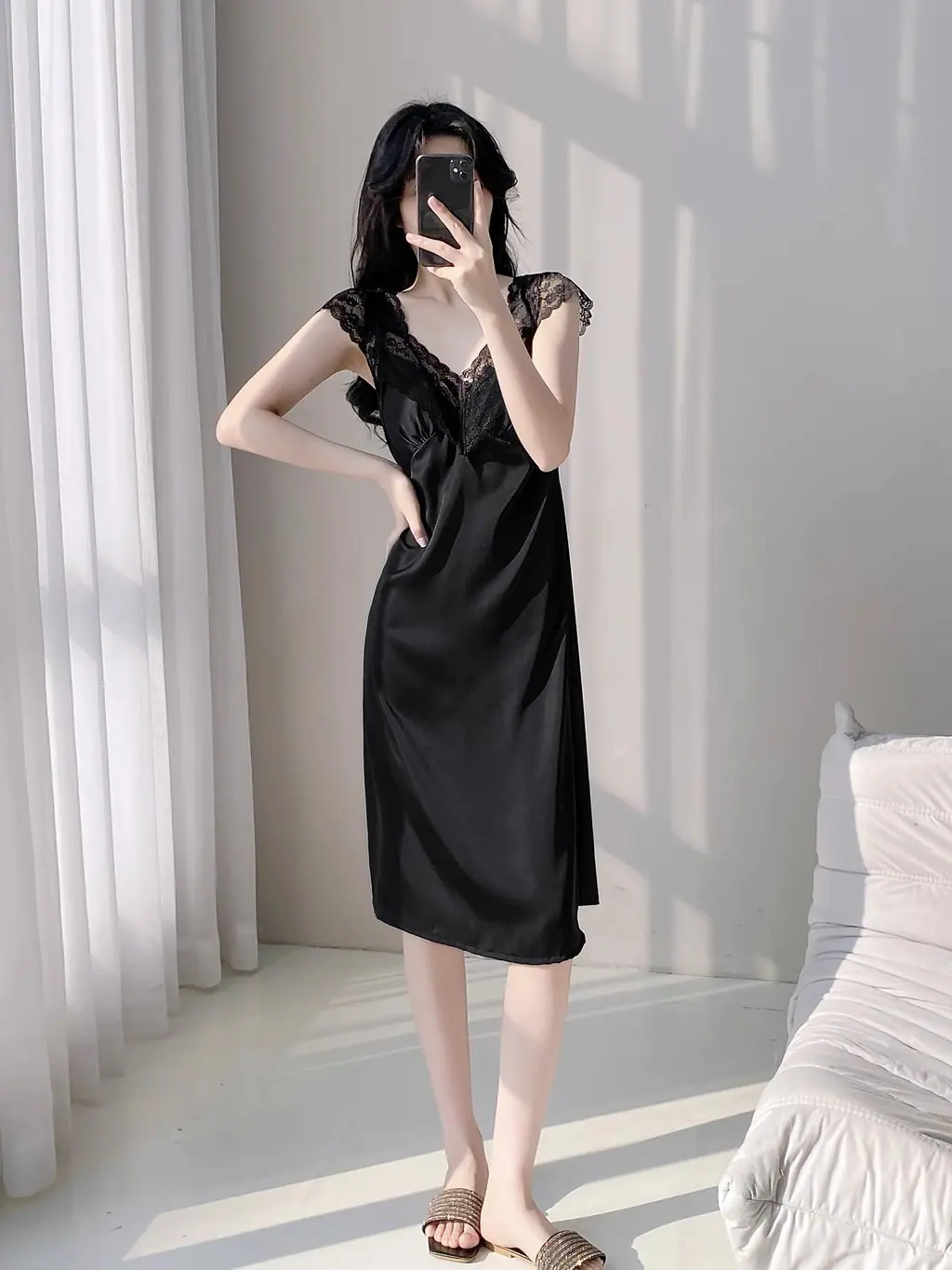 Vestido Largo de Verano de Seda de Hielo para Mujer Camisola Vestido de Noche Deseo Puro Sexy Encaje Francés con Almohadilla en el Pecho de Una Pieza Primavera y Otoño Ropa para el Hogar