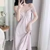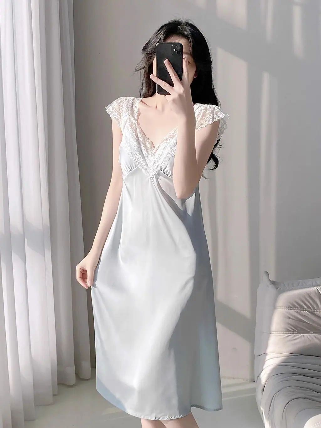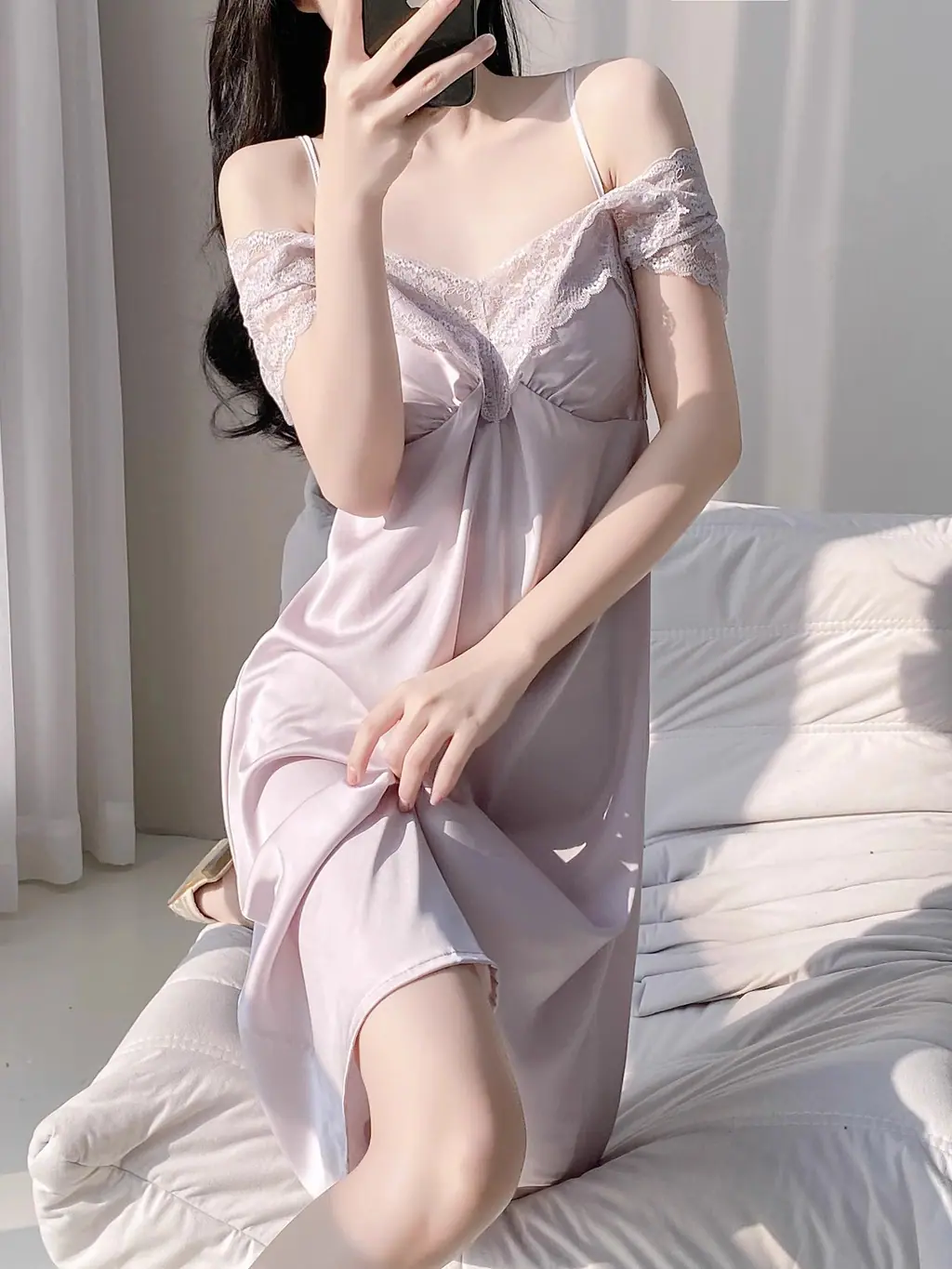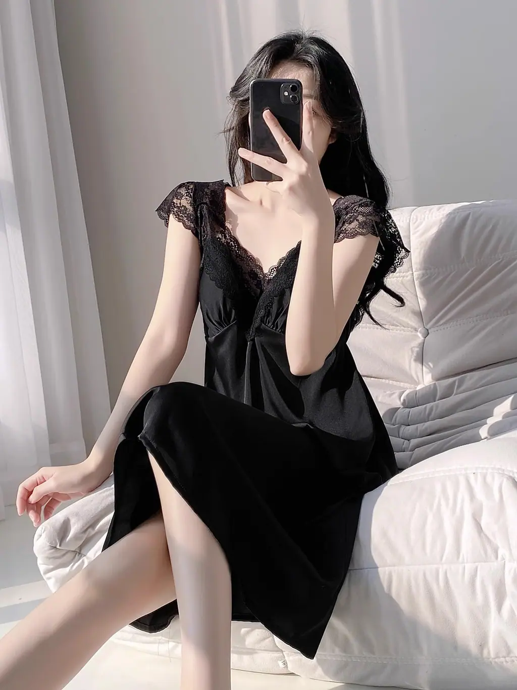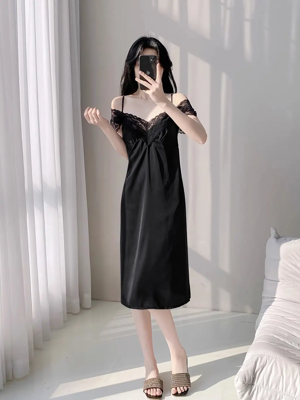 Vestido Largo de Verano de Seda de Hielo para Mujer Camisola Vestido de Noche Deseo Puro Sexy Encaje Francés con Almohadilla en el Pecho de Una Pieza Primavera y Otoño Ropa para el Hogar