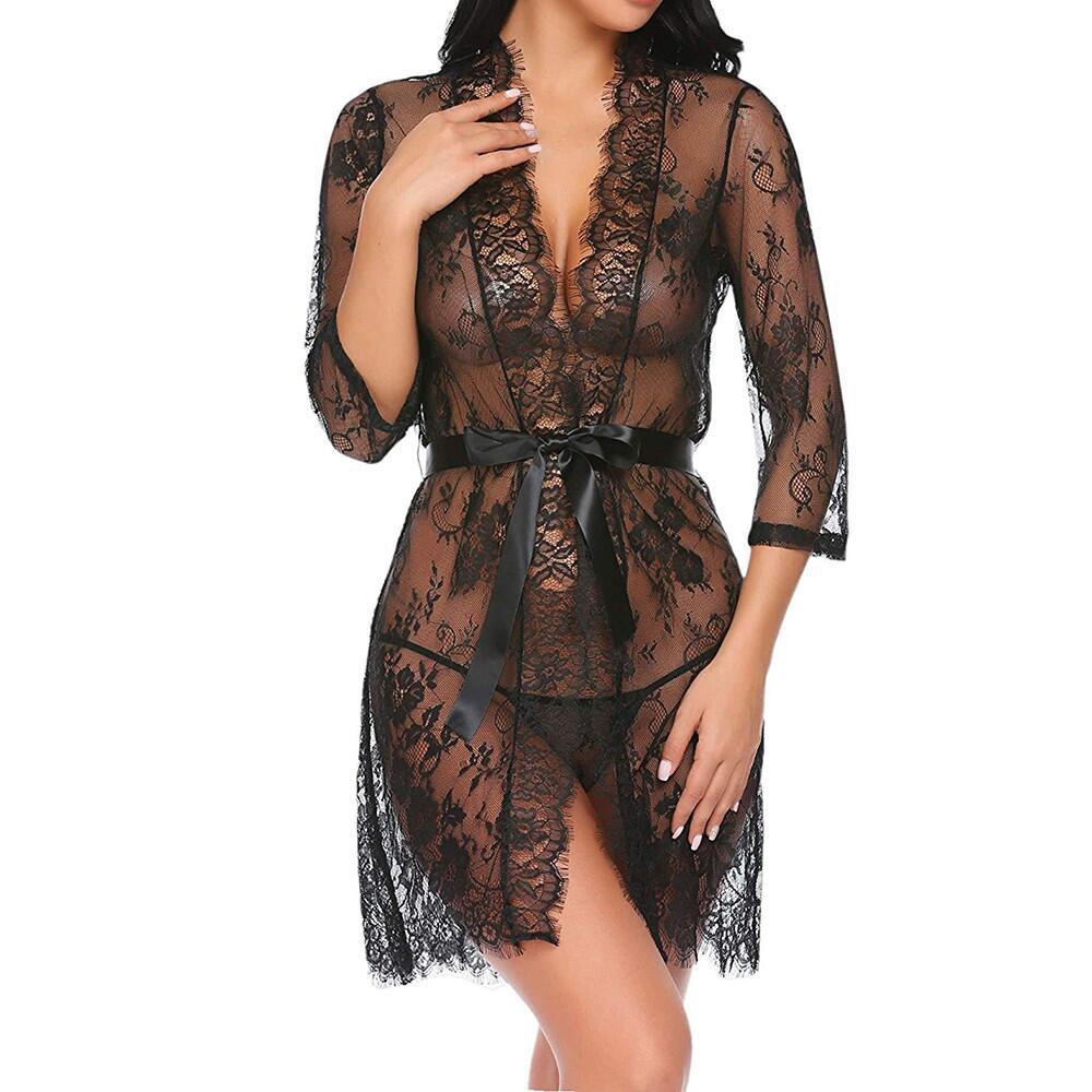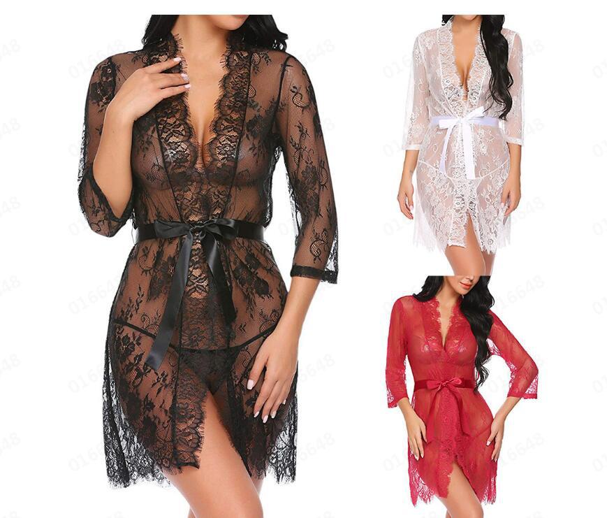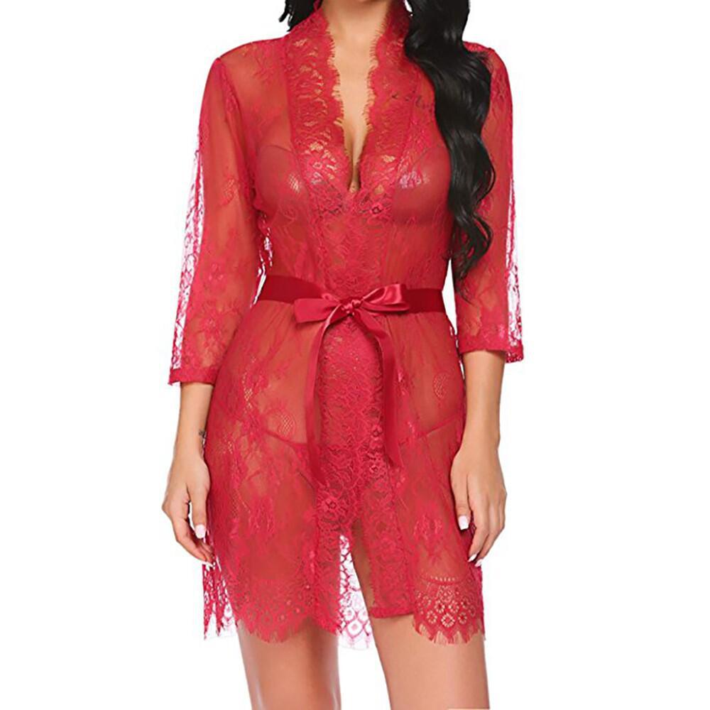 Nuevo conjunto de pijama sexy para mujer de talla grande, lencería sexy europea y americana, camisón de encaje de manga larga con cordones y escote profundo en V