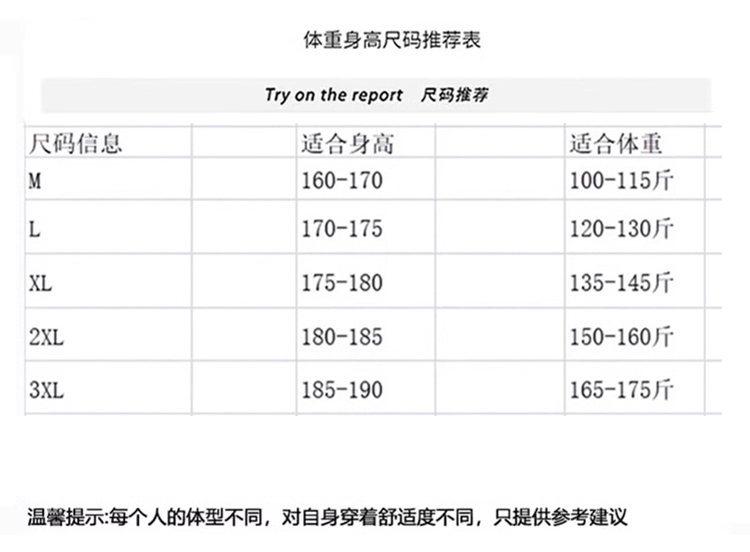 M (100-115 catties), L (120-130 pounds), XL (135-145 catties), 2XL (150-160 catties), 3XL (165-175 catties)