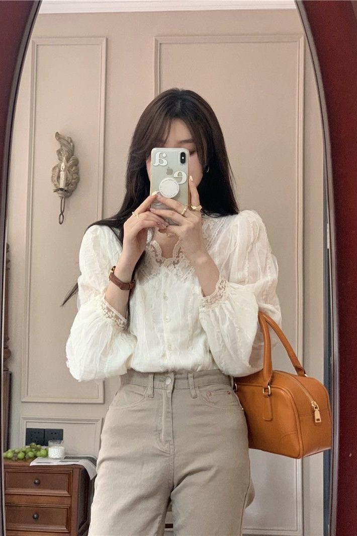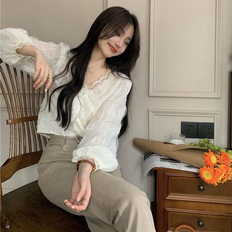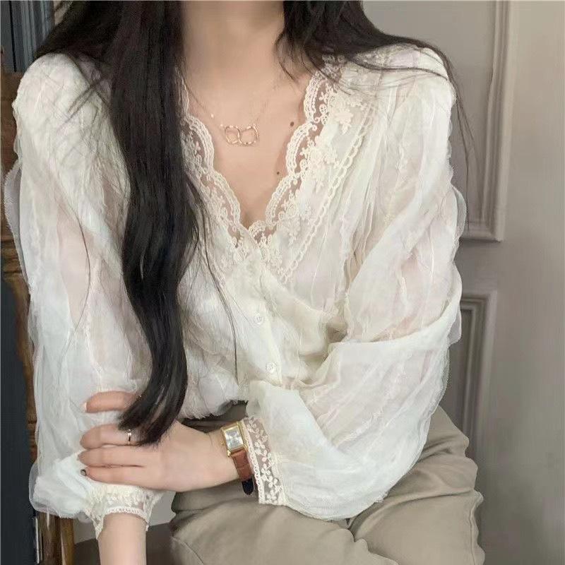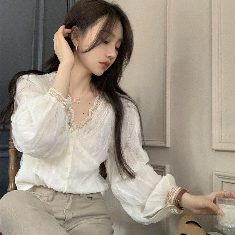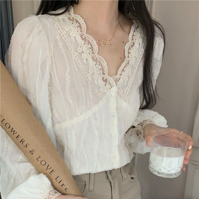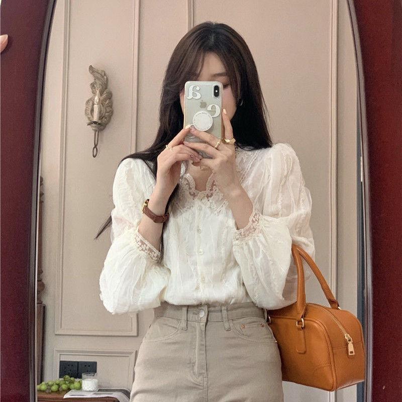 2025 Nuevo Diseño de Camisa de Encaje Francés Nicho Manga Larga Cuello en V Primavera Temprana Top Dulce Chic Camiseta Interior