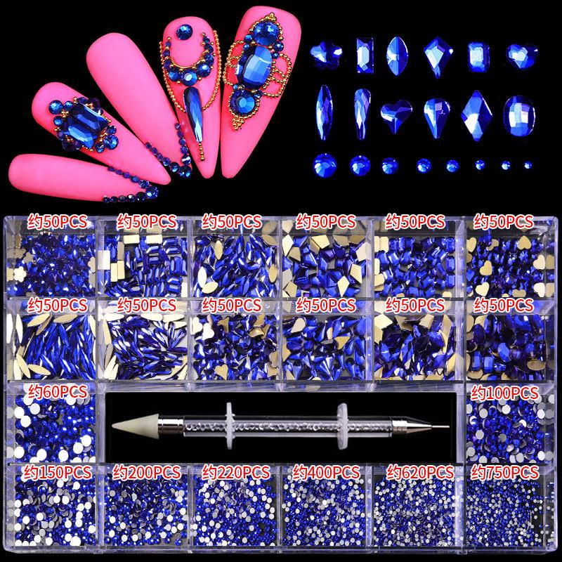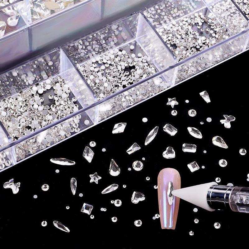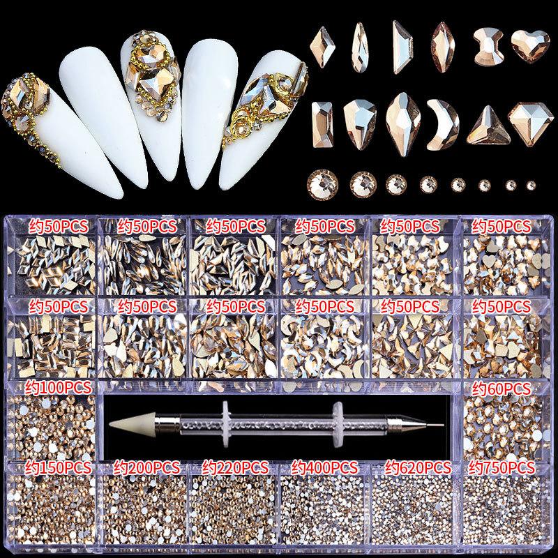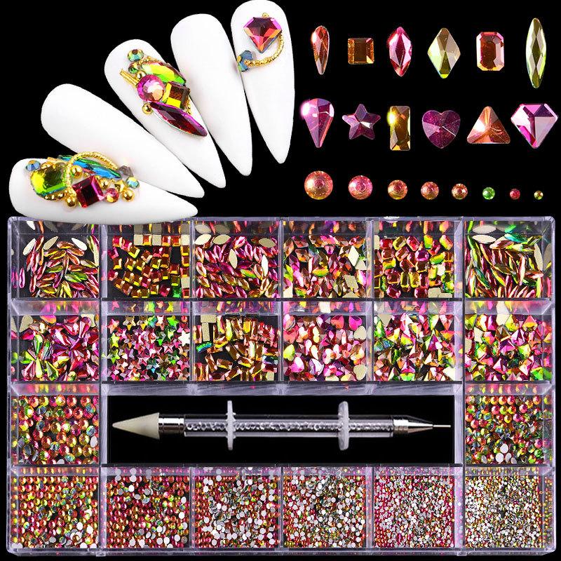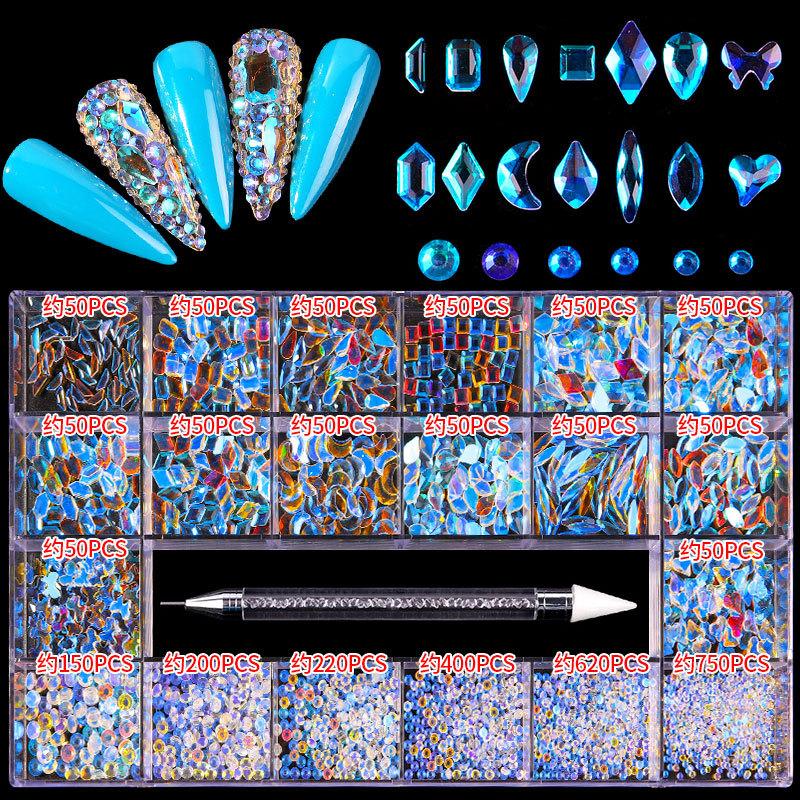 Venta Caliente Caja de 21 Compartimentos Pedrería para Uñas Fondo Plano Vidrio Irregular Pedrería DIY Pedrería para Uñas Set de Joyería para Arte de Uñas