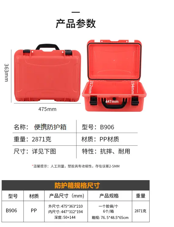 PP outer size: 475*363 * 210mm inner size: 447*312 * 194mm, ABS outer size: 495 * * 206mm inner size: 465*315 * 196mm