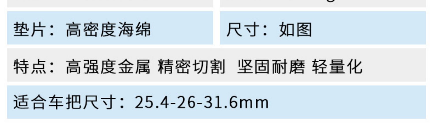 Adecuado para calibres: 31.8/26/25.4mm (26/25.4 necesita añadir una junta semicircular, el bloqueo de estrías bidireccionales de la junta produce fricción y no es fácil que se deslice) se requiere para manillares de calibre 25.4