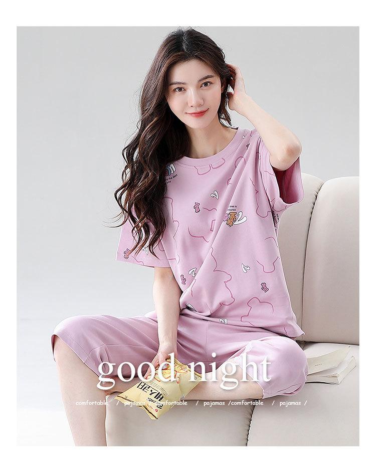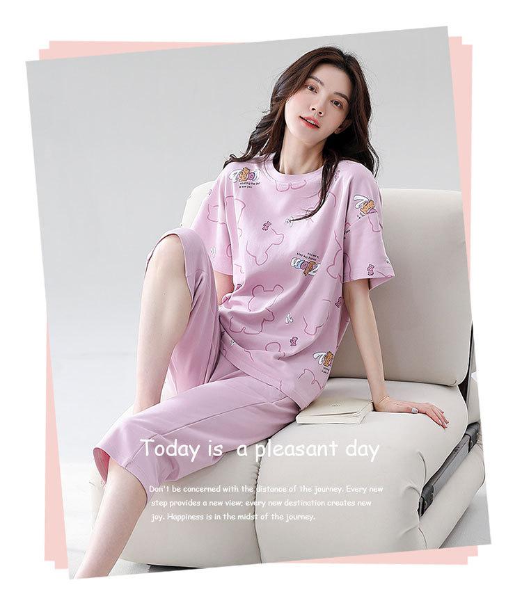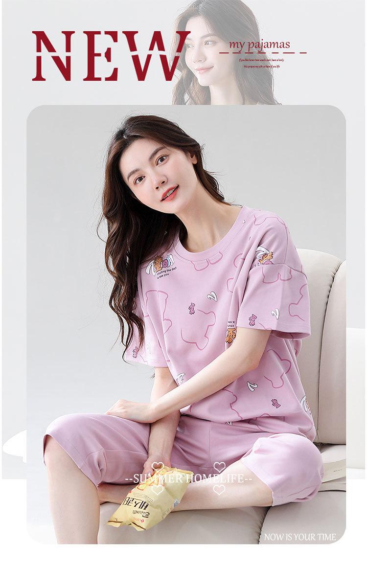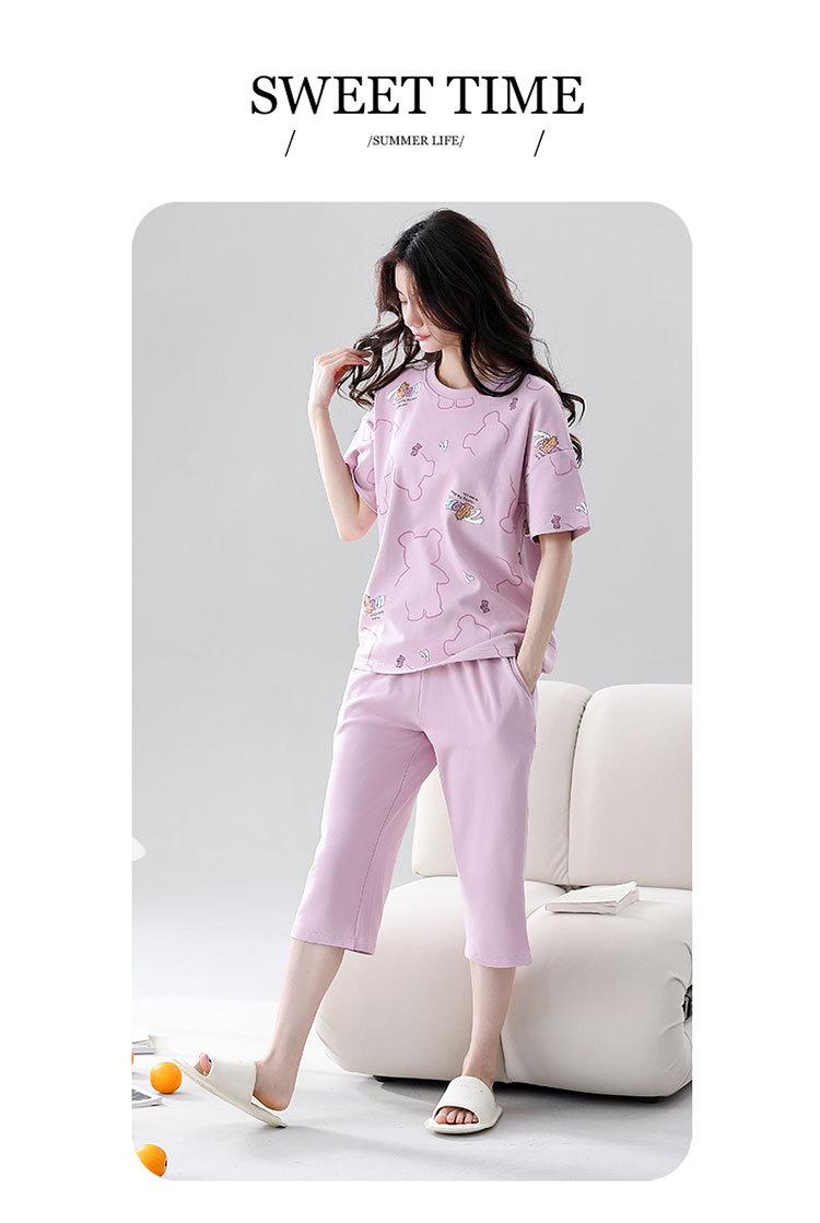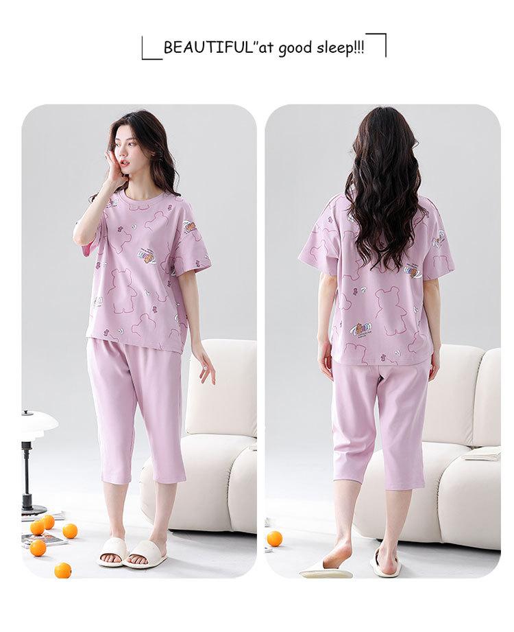 Pijamas de Verano para Mujer Algodón Manga Corta Pantalón Capri Verano Delgadas Ropa de Casa de Algodón Traje de Dos Piezas