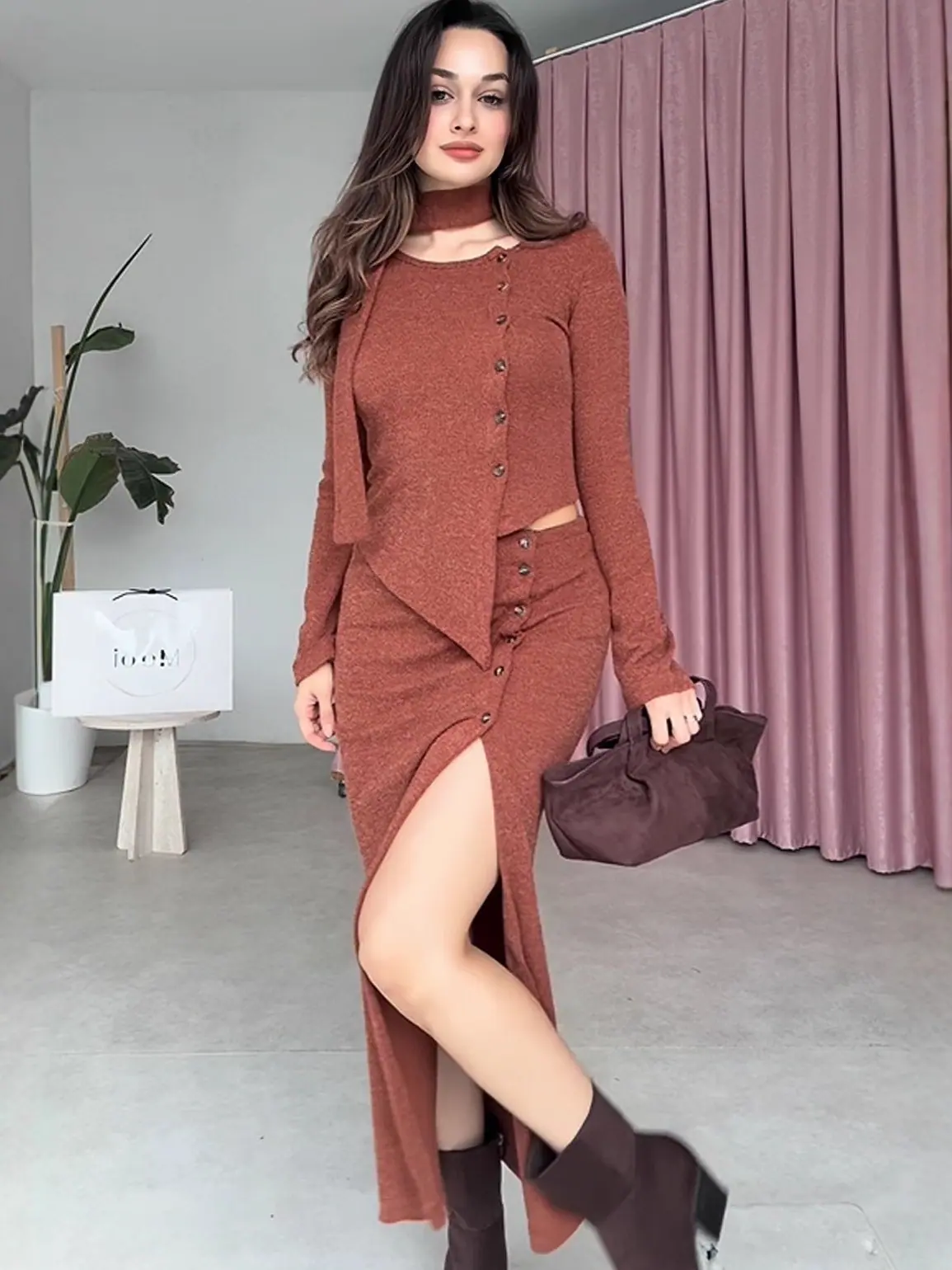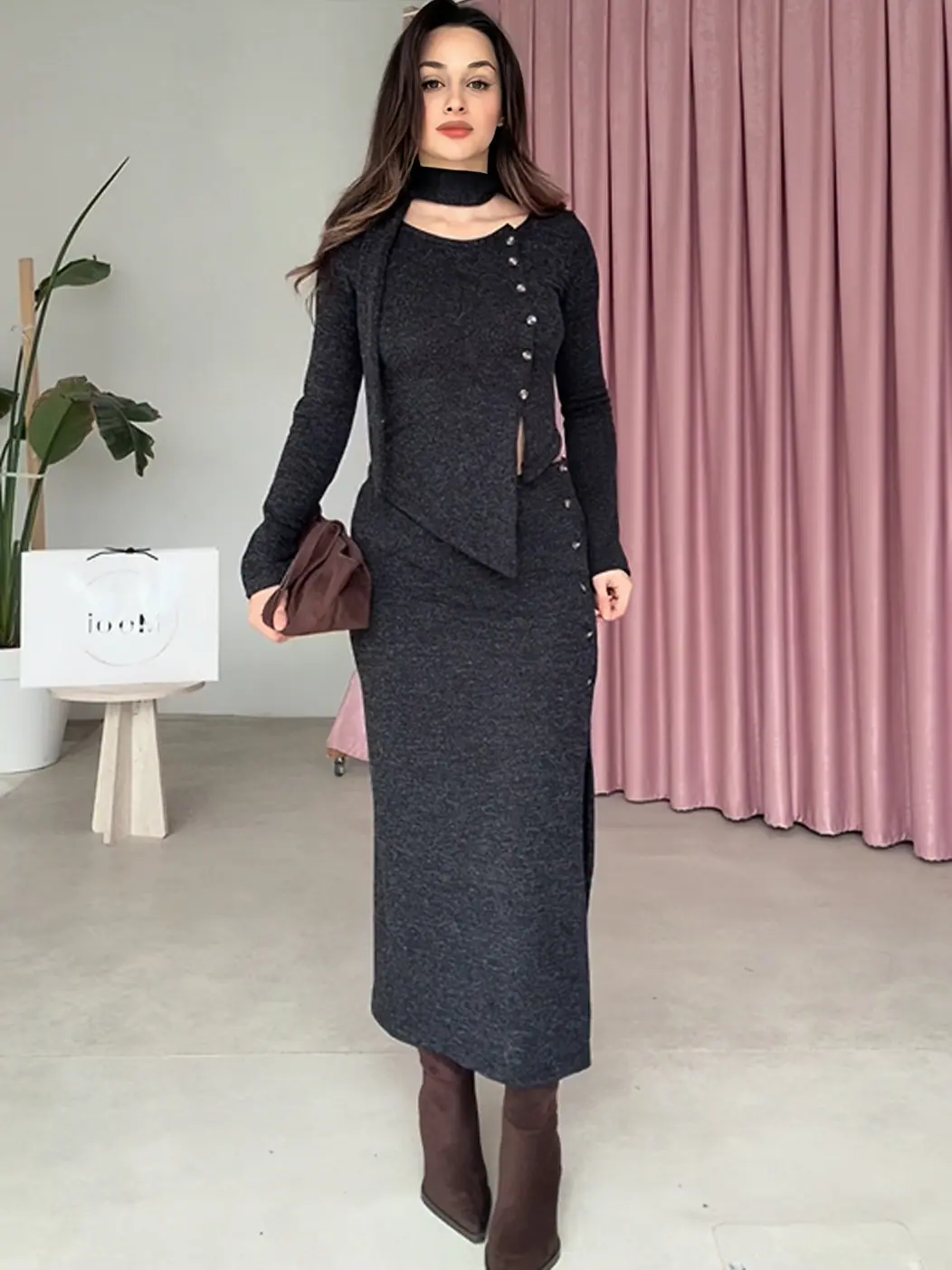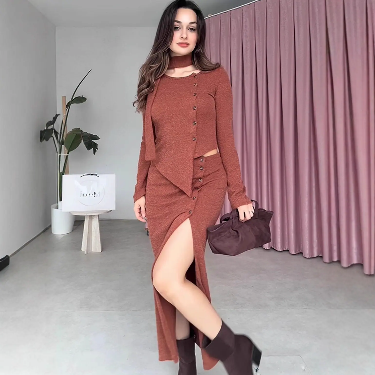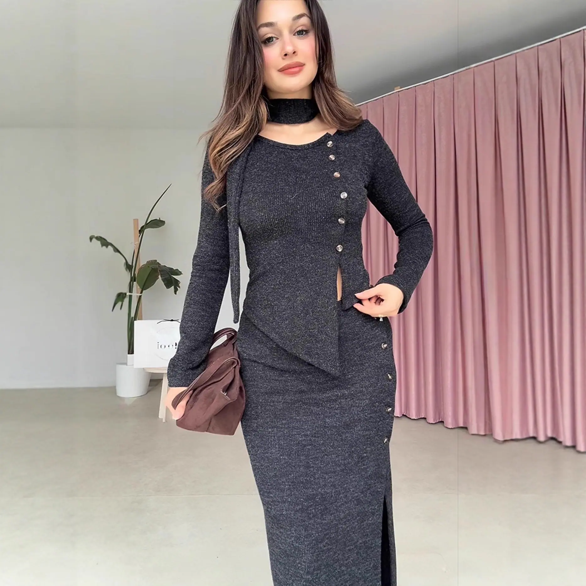 Conjunto Casual de Otoño Nuevo Transfronterizo Europeo y Americano de Corte Slim de Punto con Botones Suéter de Manga Larga Falda Midi Conjunto de Dos Piezas para Mujer