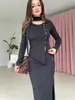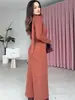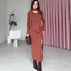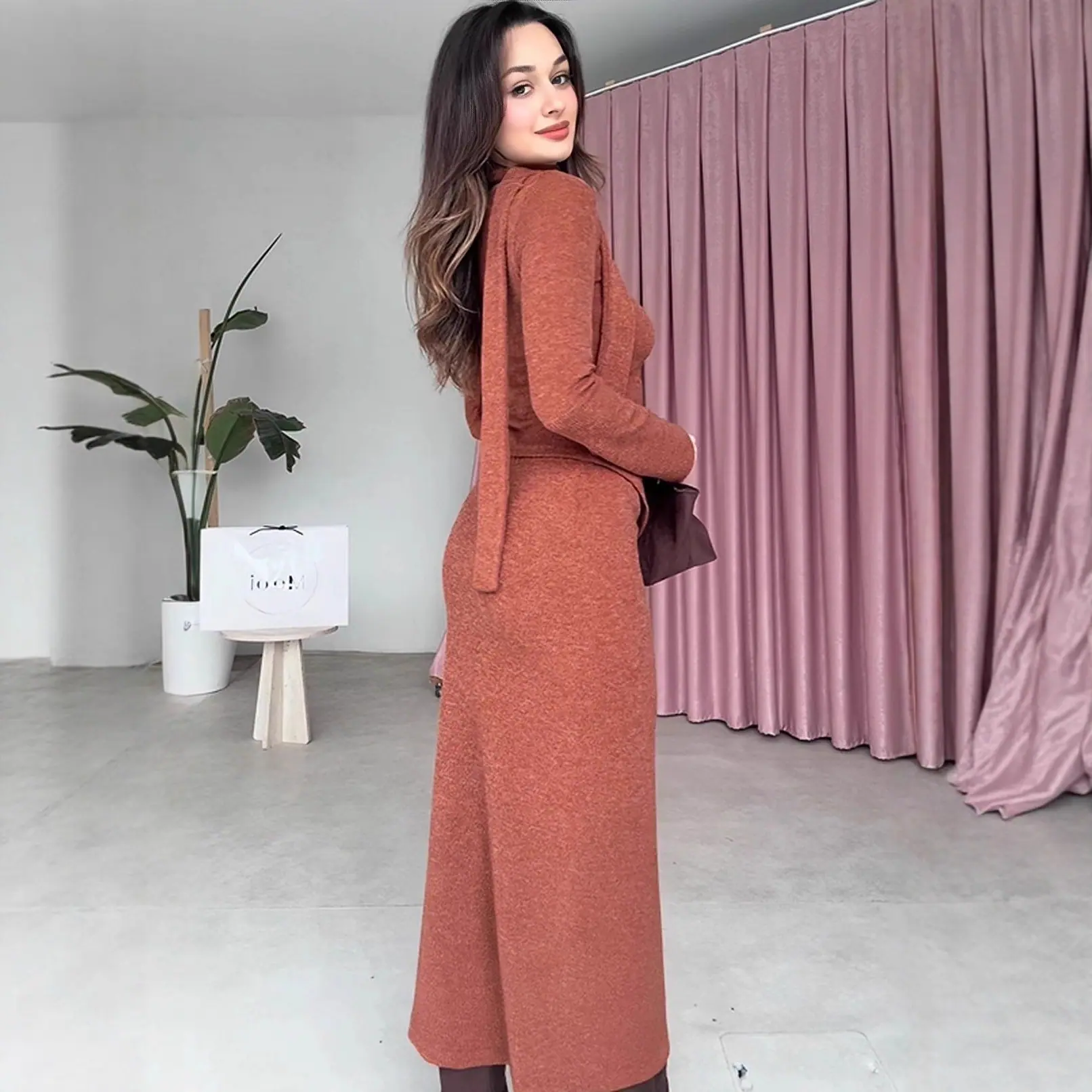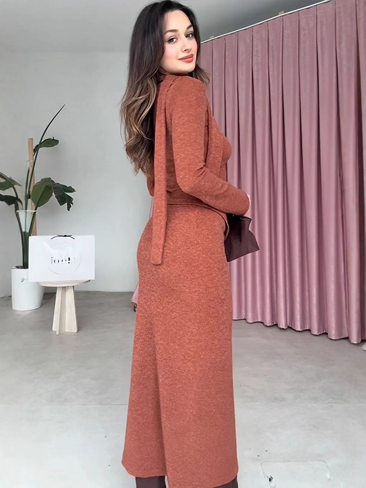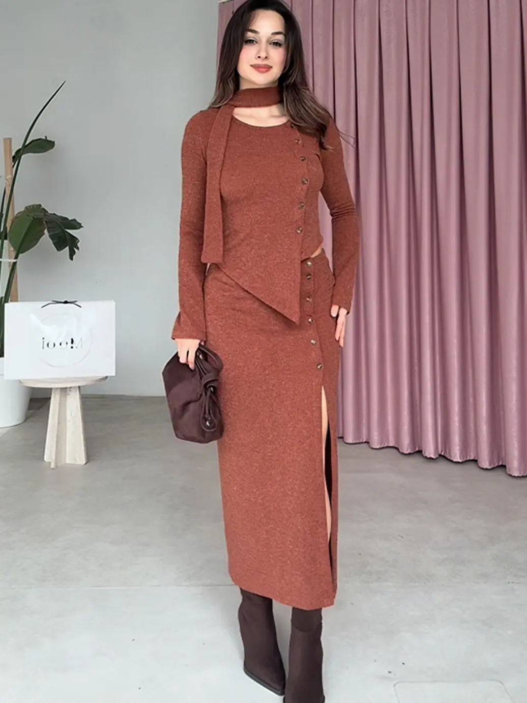 Conjunto Casual de Otoño Nuevo Transfronterizo Europeo y Americano de Corte Slim de Punto con Botones Suéter de Manga Larga Falda Midi Conjunto de Dos Piezas para Mujer