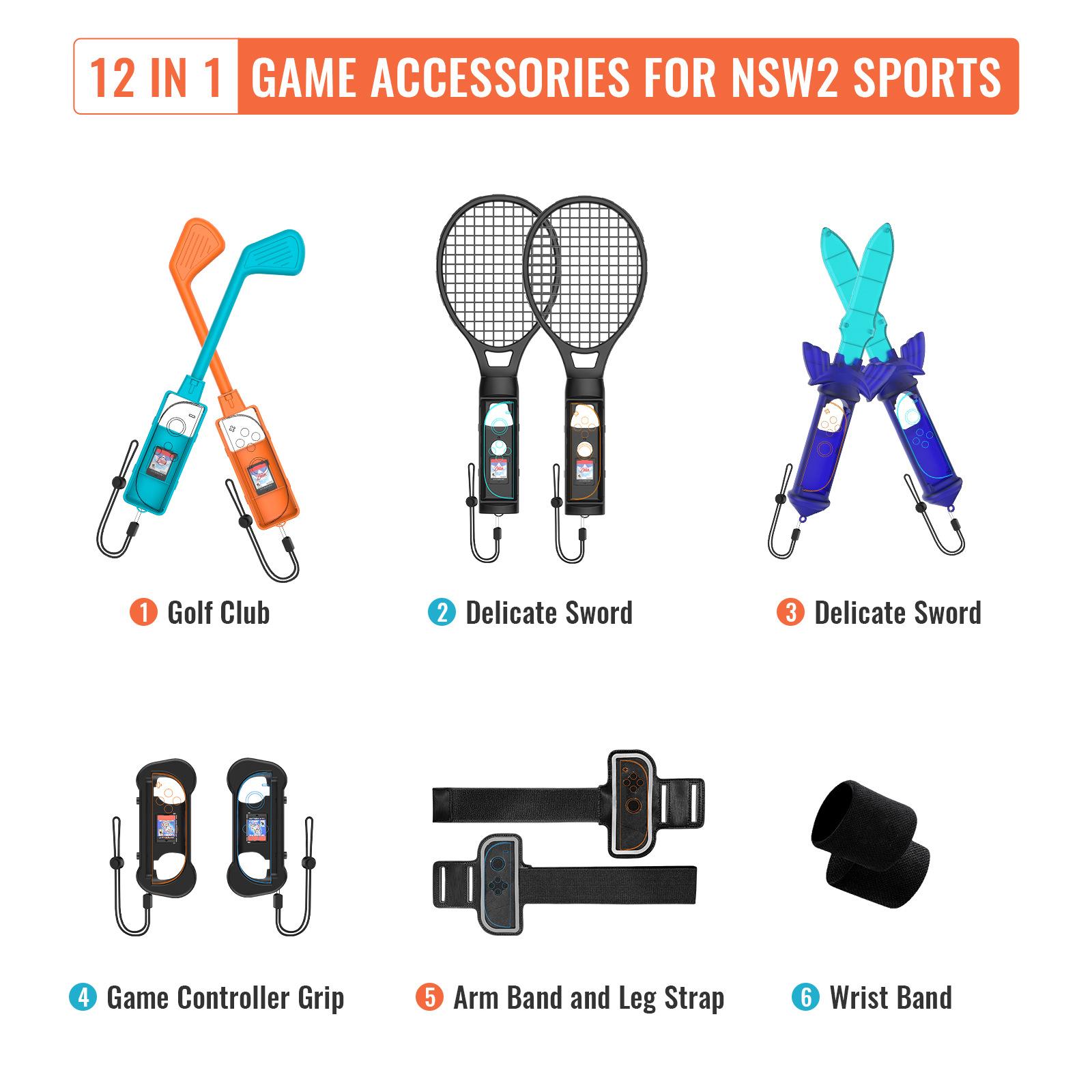 * Accesorios incluidos: 2 palos de golf, 2 empuñaduras pequeñas, 1 correa para la pierna, 1 correa para la muñeca, 2 raquetas de tenis, 2 mini espadas, 2 muñequeras