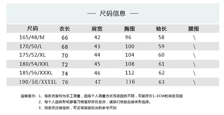 165-M, 170-L, 175-XL, 180-XXL, 185-XXXL, 190-XXXXL
