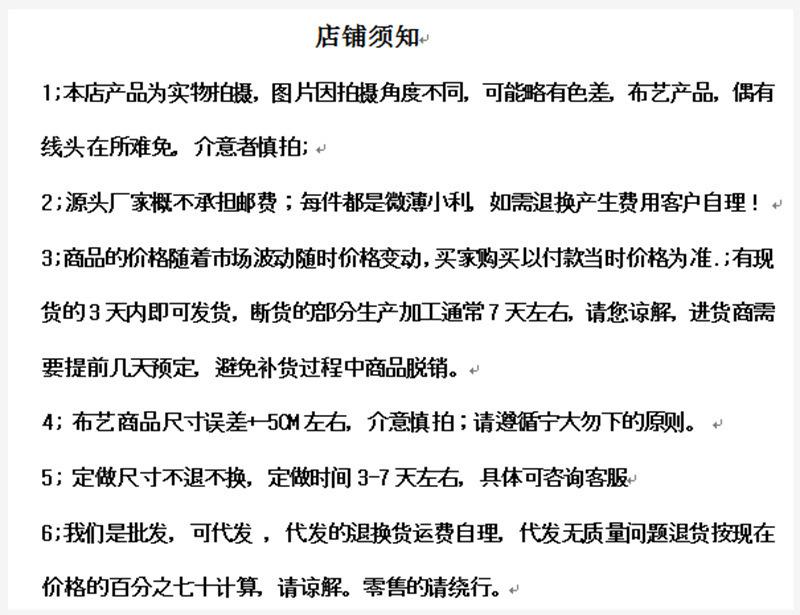 | ★ ¿Por qué la tarifa de envío es tan alta cuando el comprador realiza un pedido? Porque las tarifas de envío a veces se suman automáticamente, puede enviar el pedido primero sin pagar. Necesita contactar al servicio al cliente para modificarlo a una tarifa de envío razonable antes de pagar. ★ Soporte dropshipping Douyin Kuaishou Pinduoduo Taobao JD.com y otras plataformas principales tienen cooperación, nuestras empresas de mensajería cooperativas son Shentong Yunda ZTO Postal SF, muchas empresas de logística tienen cooperación, entrega rápida, calidad garantizada Soporte entrega Dian Guan Jia, puede consultar al servicio al cliente ★ Servicio posventa: El horario de atención al cliente es de 8:00 a. m. a 12:00 p. m. Durante los días festivos, si tiene alguna pregunta sobre el servicio posventa, deje un mensaje en Wangwang. Le responderemos una por una después del trabajo. ★Gracias por su comprensión y cooperación. Todos los empleados de Xinjia Home Furnishings le desean un negocio próspero. |