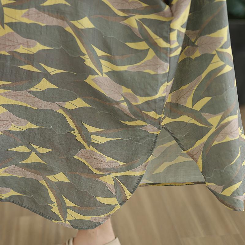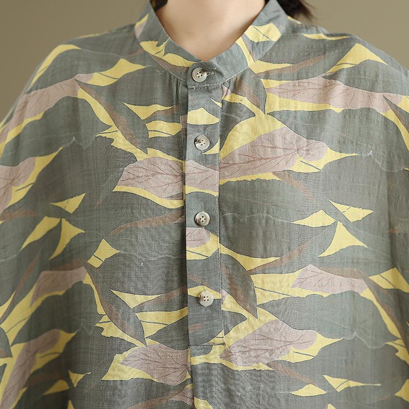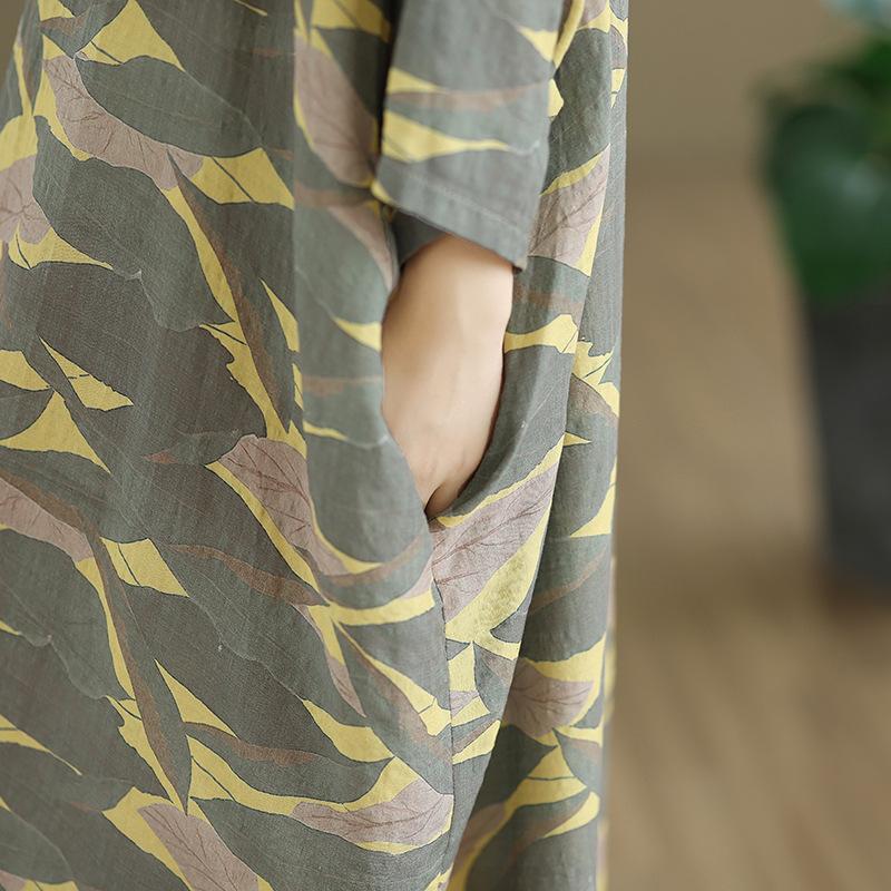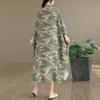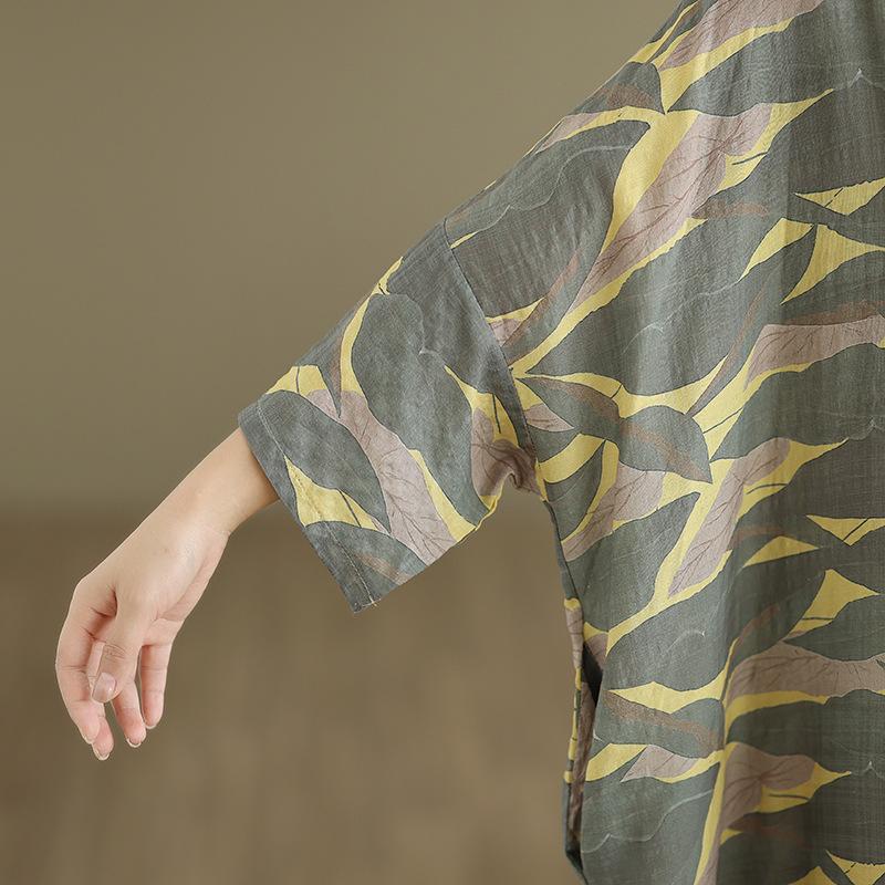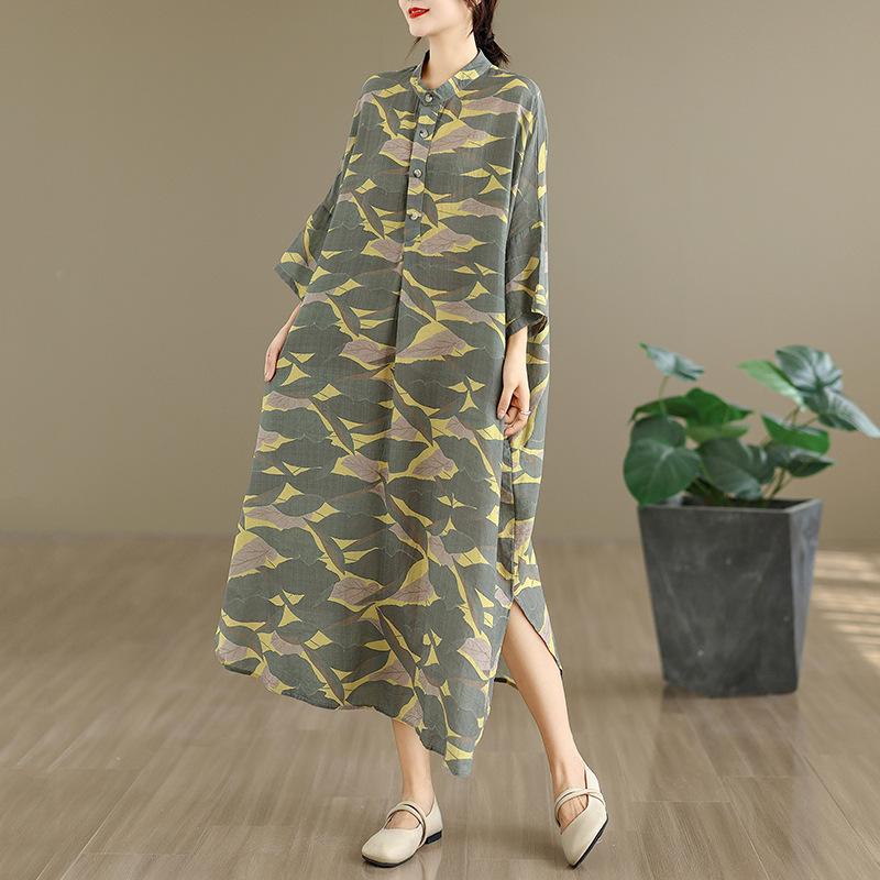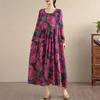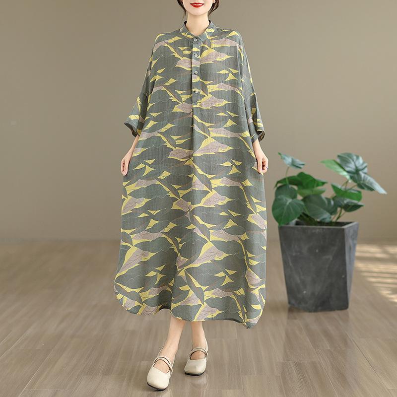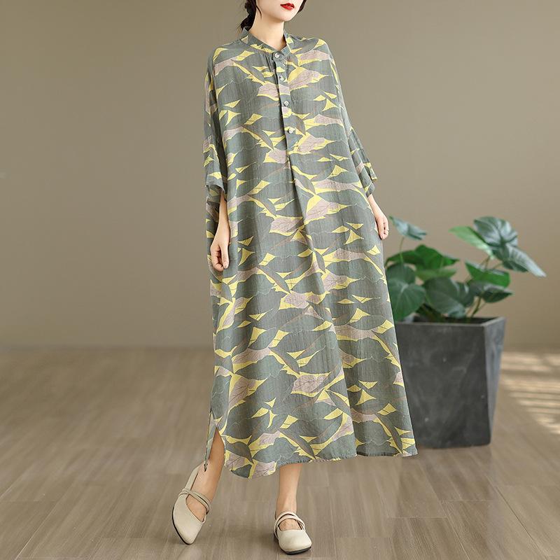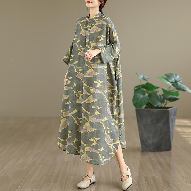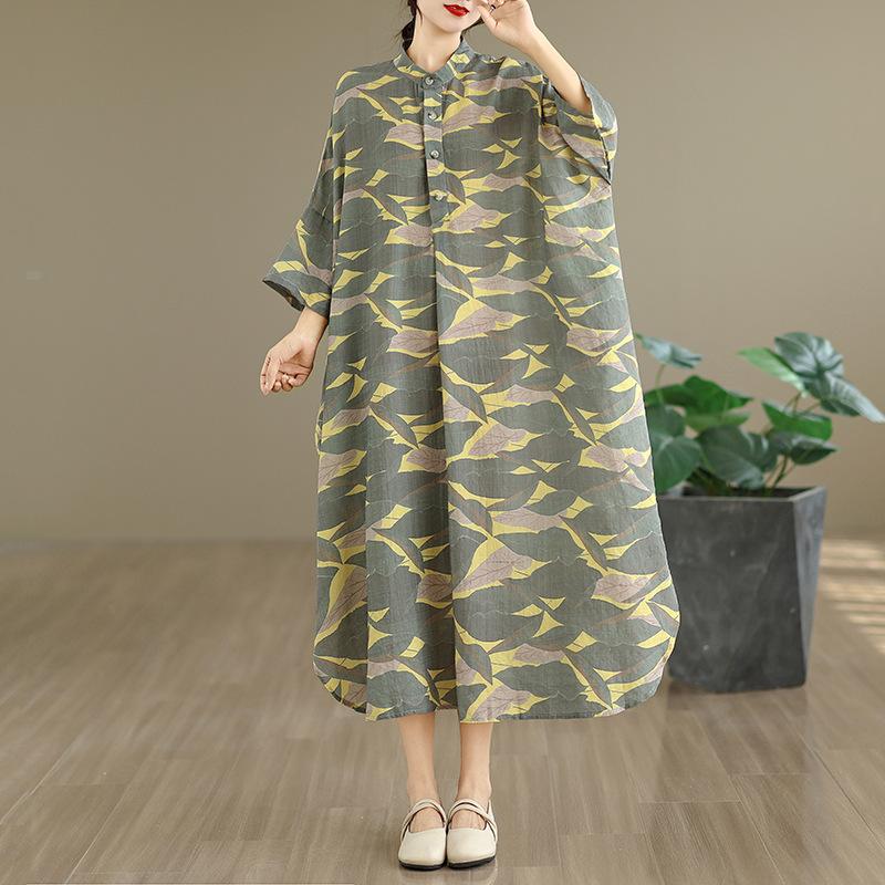2025 Otoño Nuevo Literario Retro Algodón Lino Estampado Cuello Mao Suelto Talla Grande Vacaciones Vestido Manga Larga Mujer