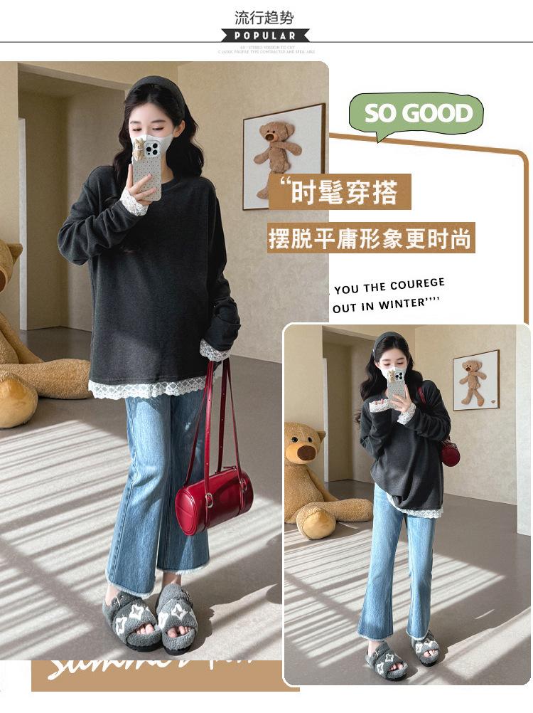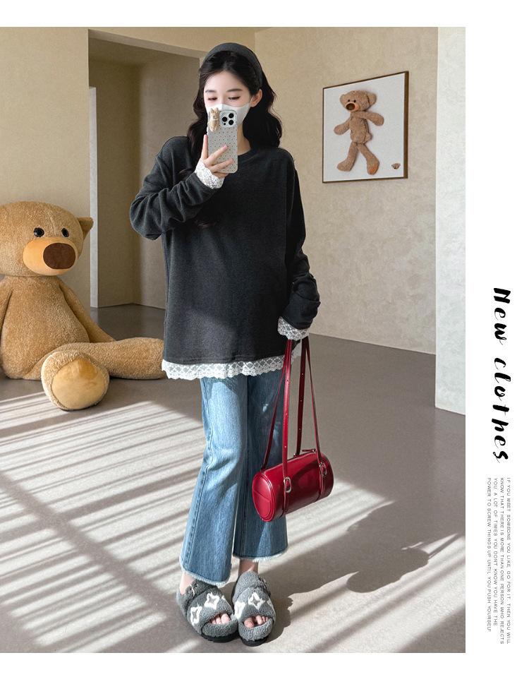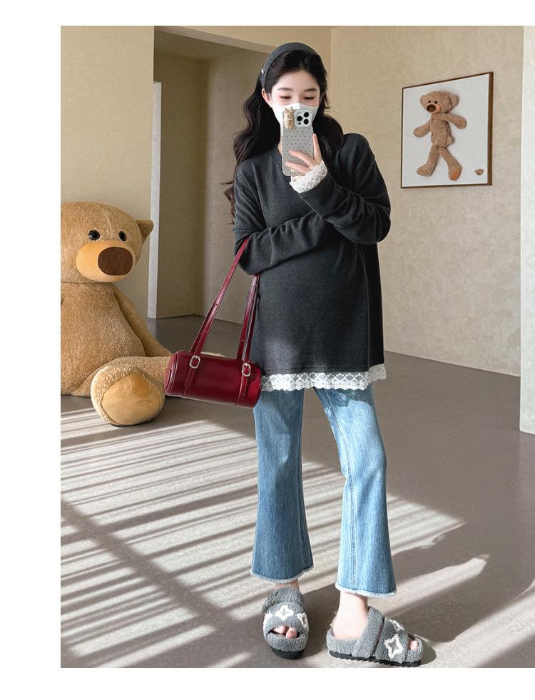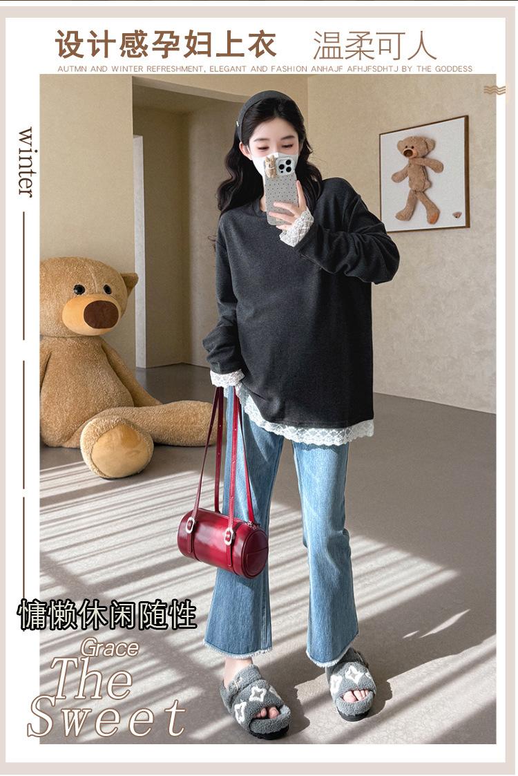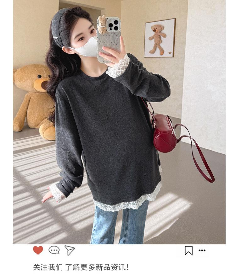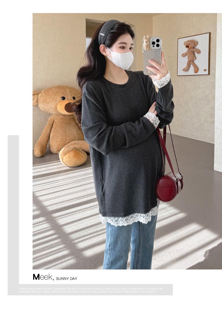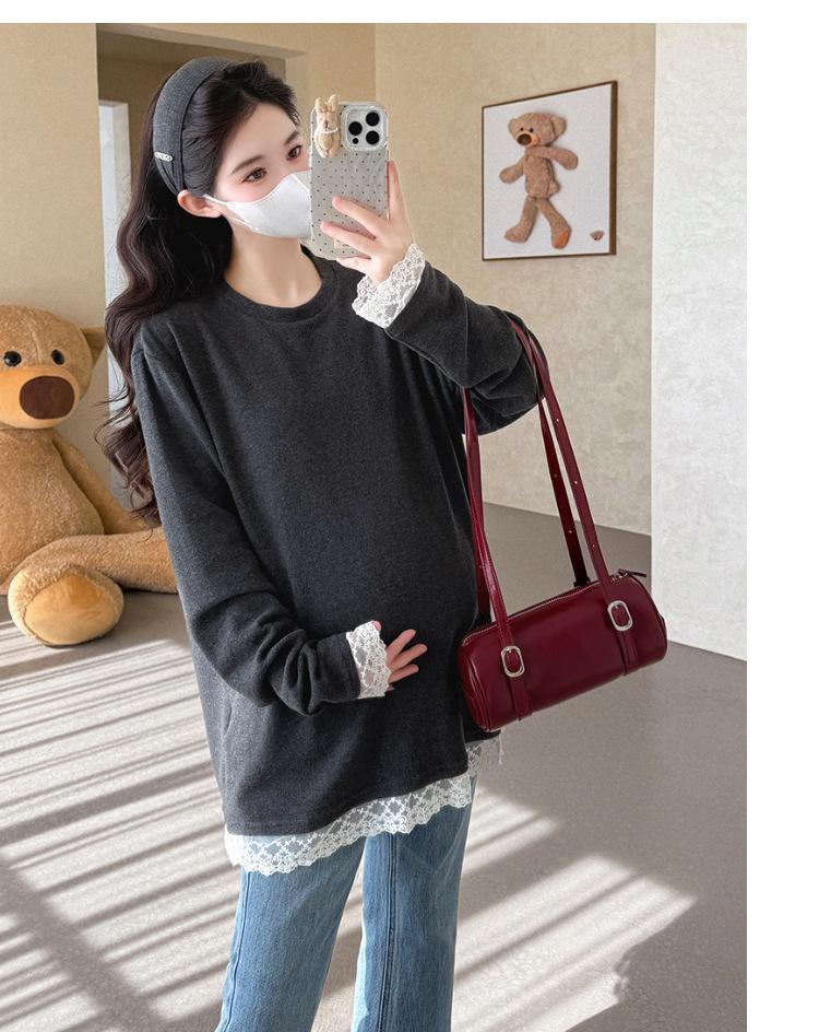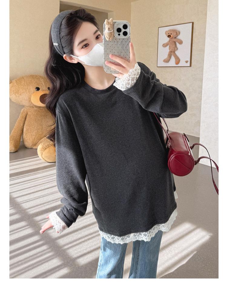 Top de Maternidad 2025 Otoño/Invierno Nueva Moda Encaje Patchwork Color Sólido Dobladillo de Encaje Capa Base Cálida Cepillada