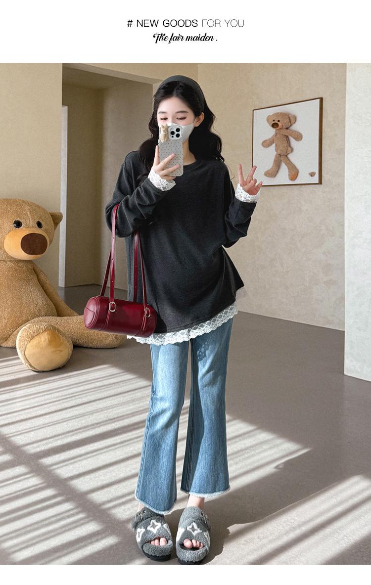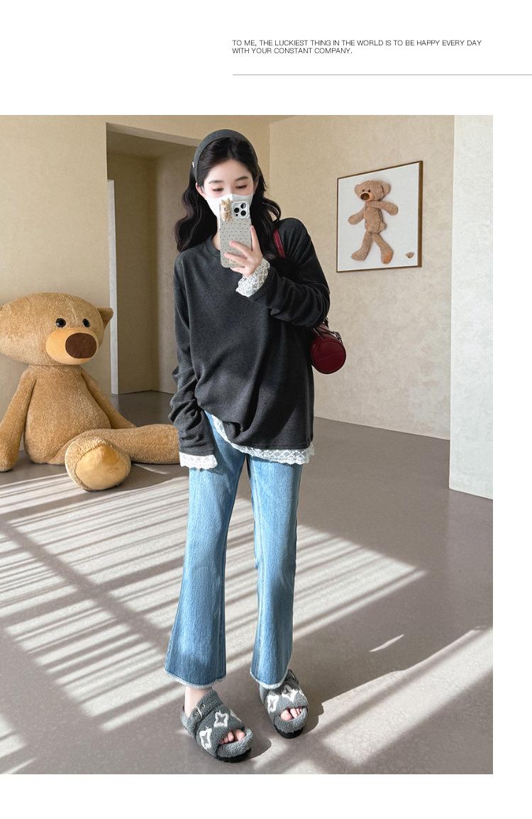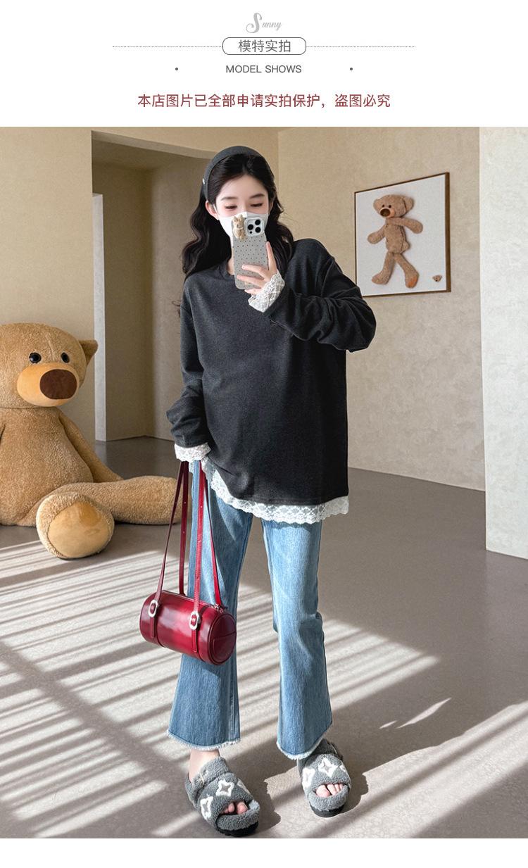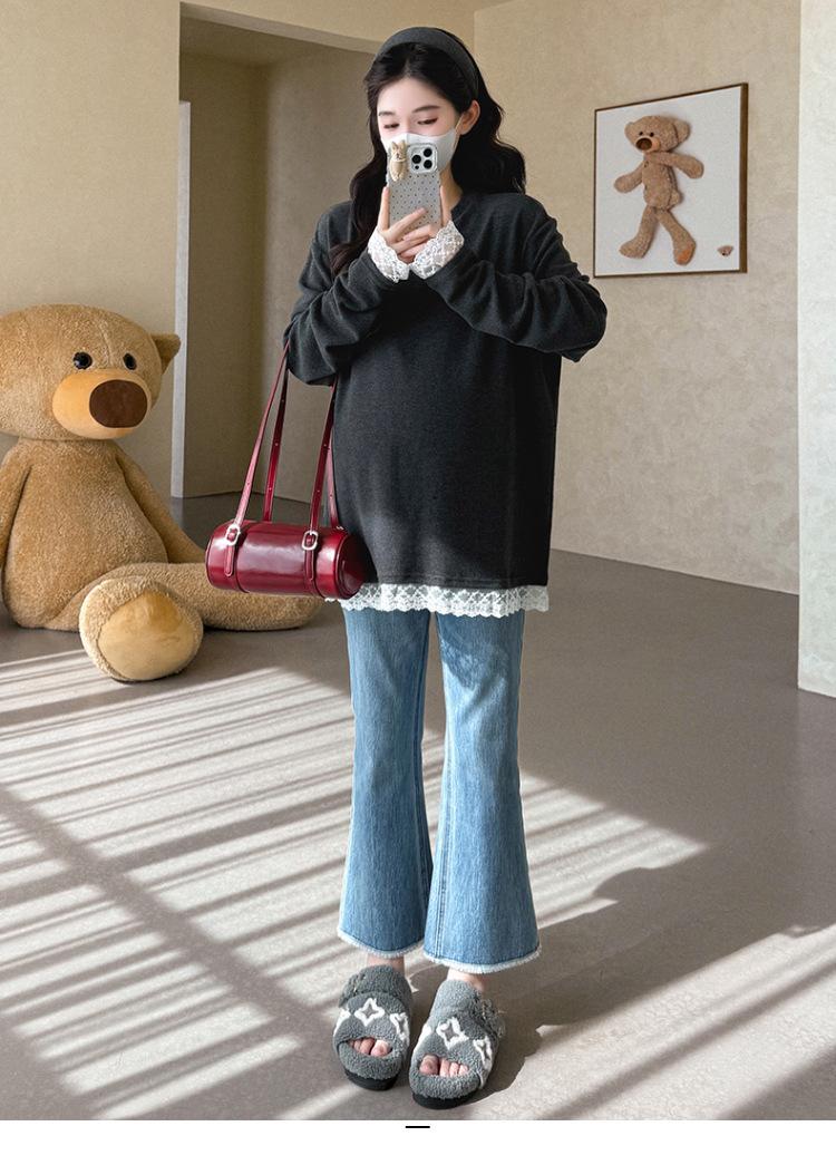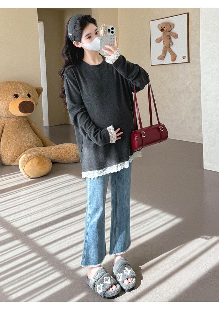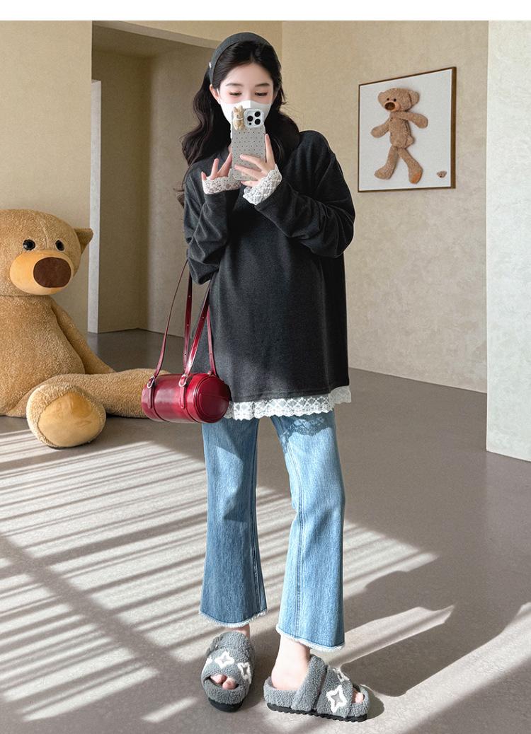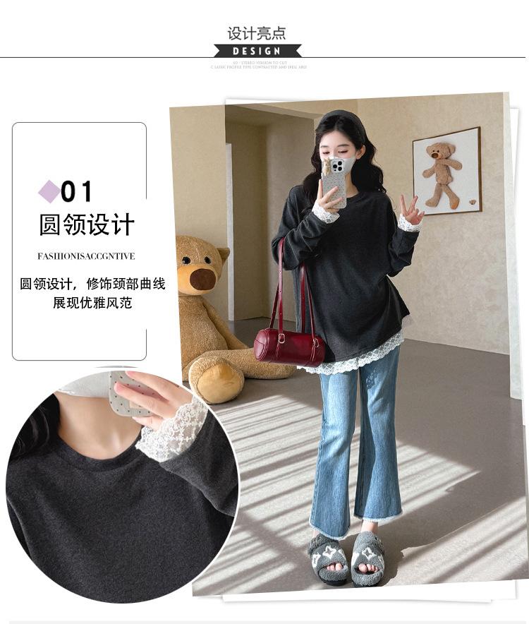 Top de Maternidad 2025 Otoño/Invierno Nueva Moda Encaje Patchwork Color Sólido Dobladillo de Encaje Capa Base Cálida Cepillada