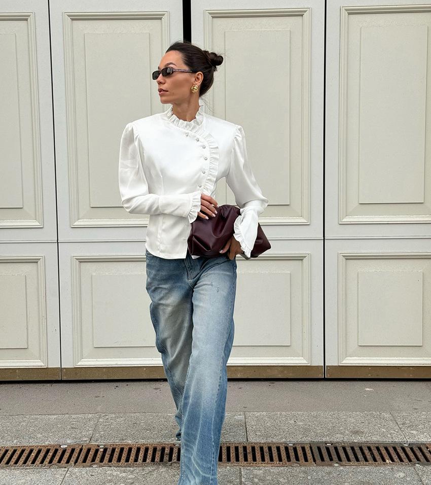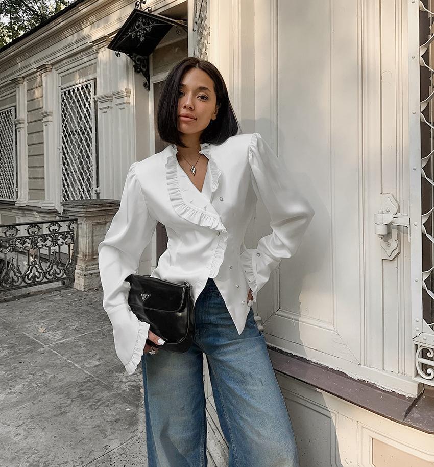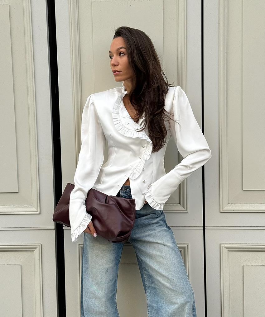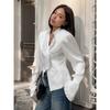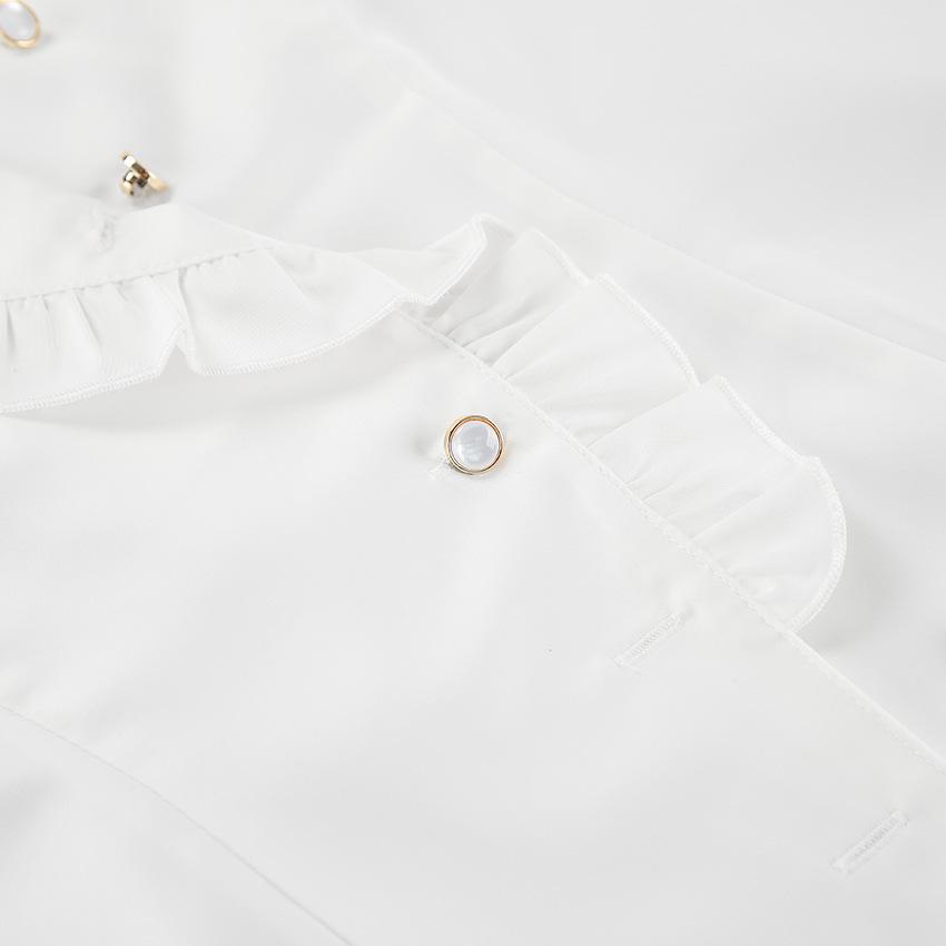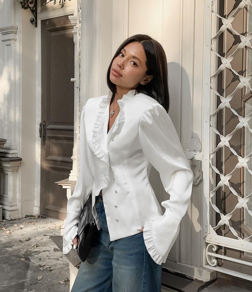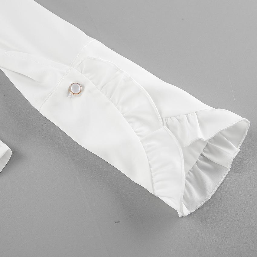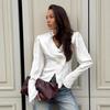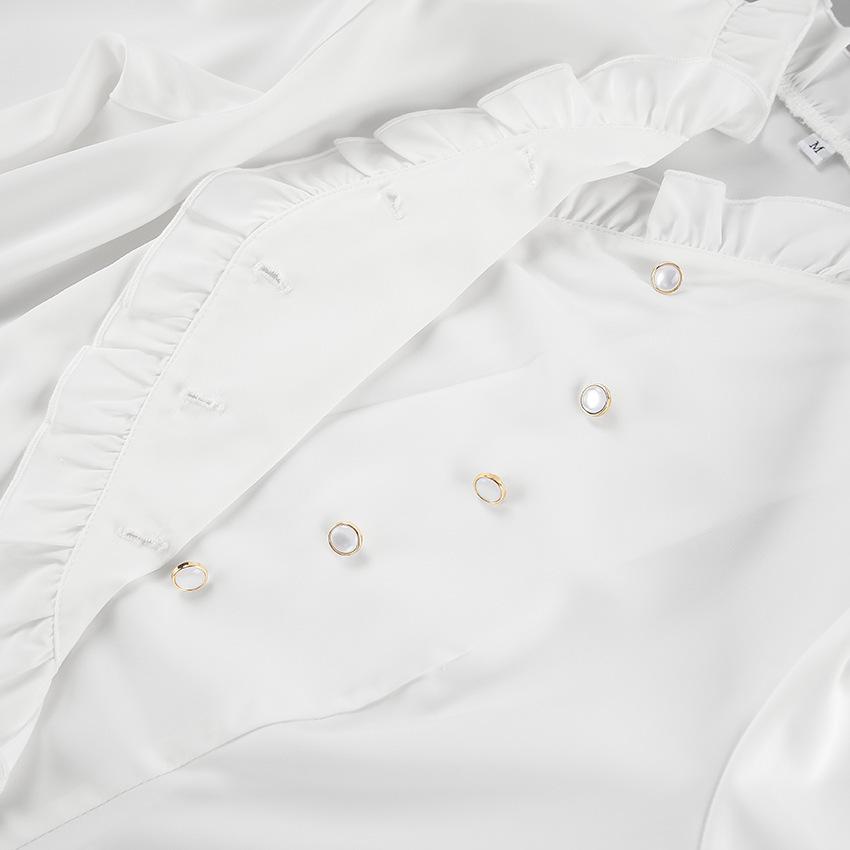 Compra Camisa de satén con volantes transfronteriza europea y americana Otoño 2025 Temperamento Ropa interior Adelgazante Top de encaje blanco Ropa de mujer al por mayor en Joom.pro