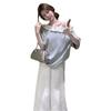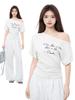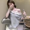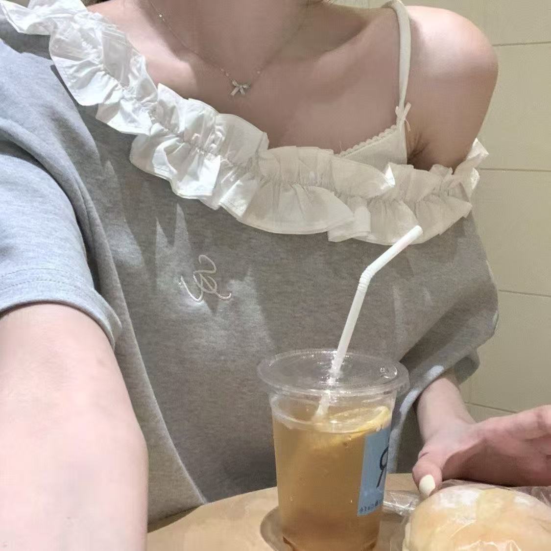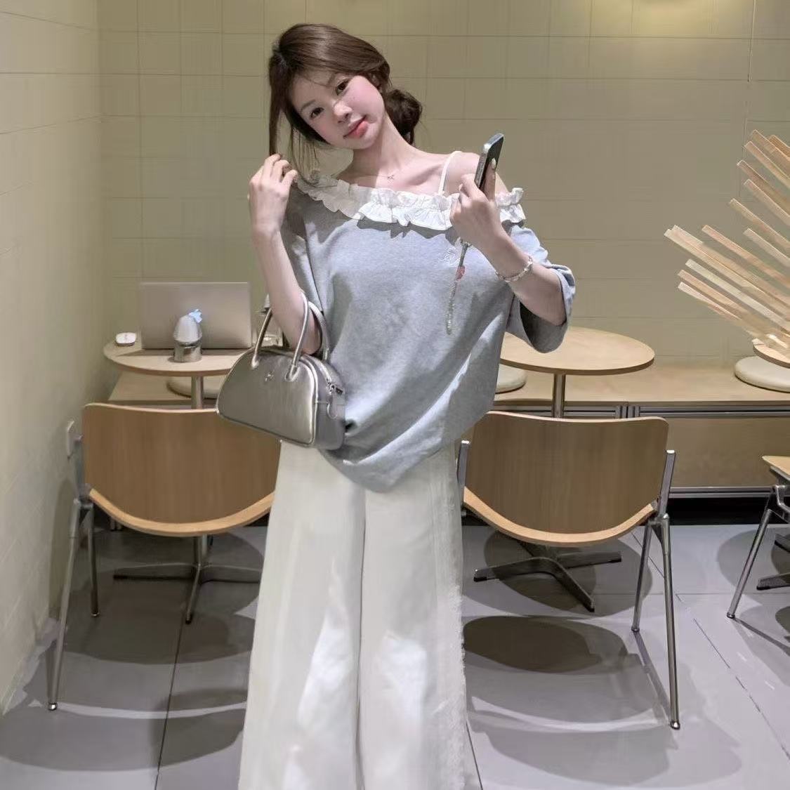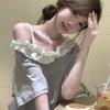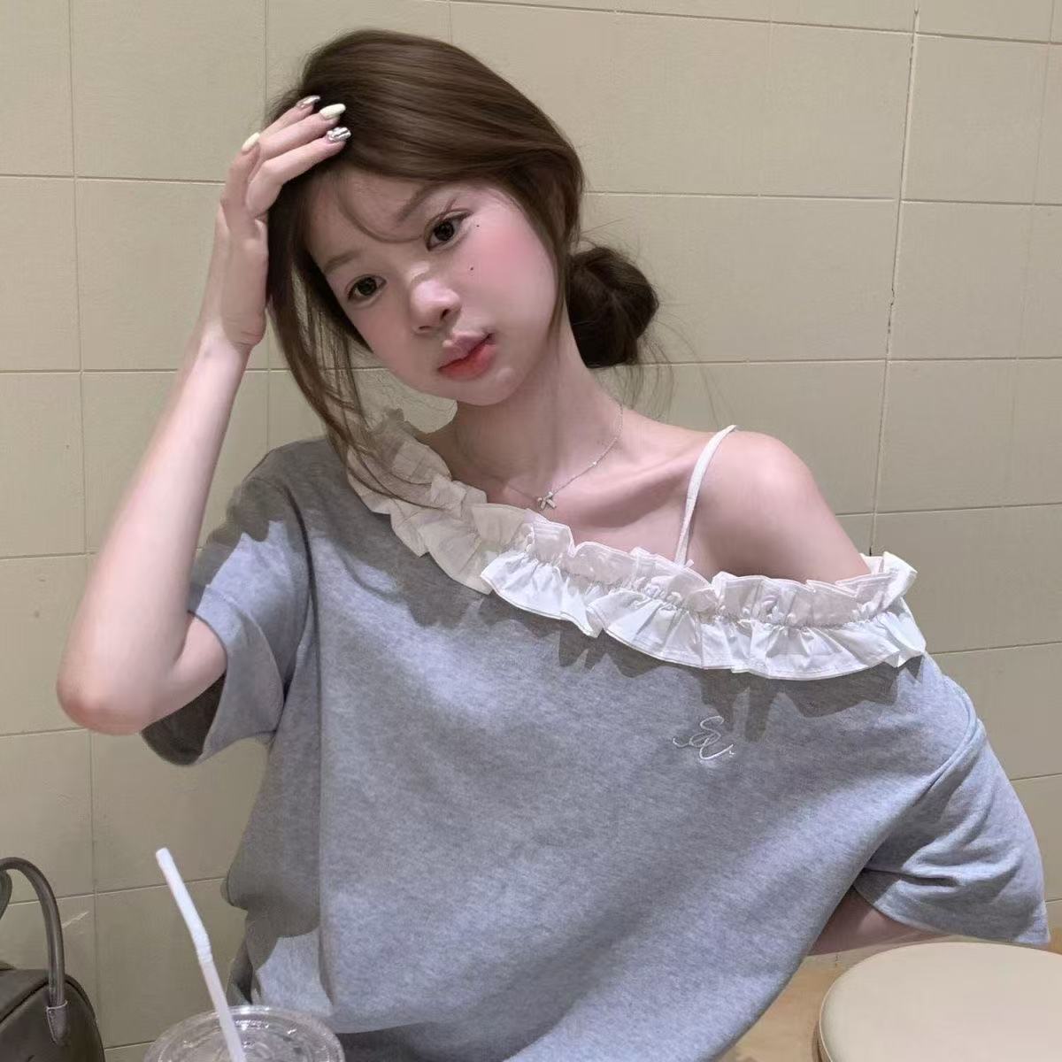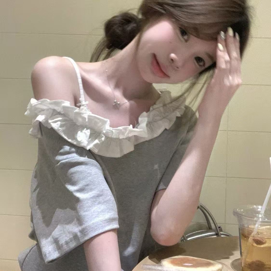 Empalmada 2025 Fuera del Hombro Gris Nueva Camiseta de Encaje de Manga Corta INS Suelta Verano Top de Chica Caliente Dopamina Outfit