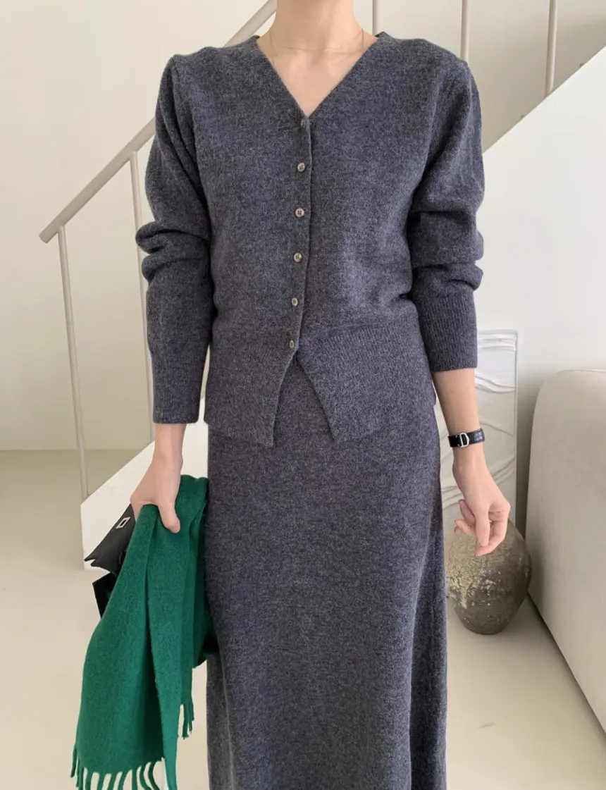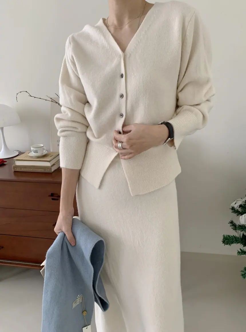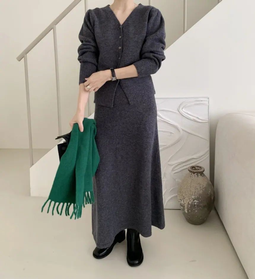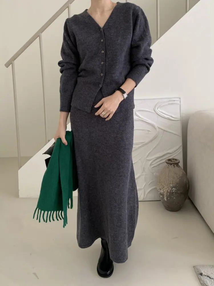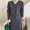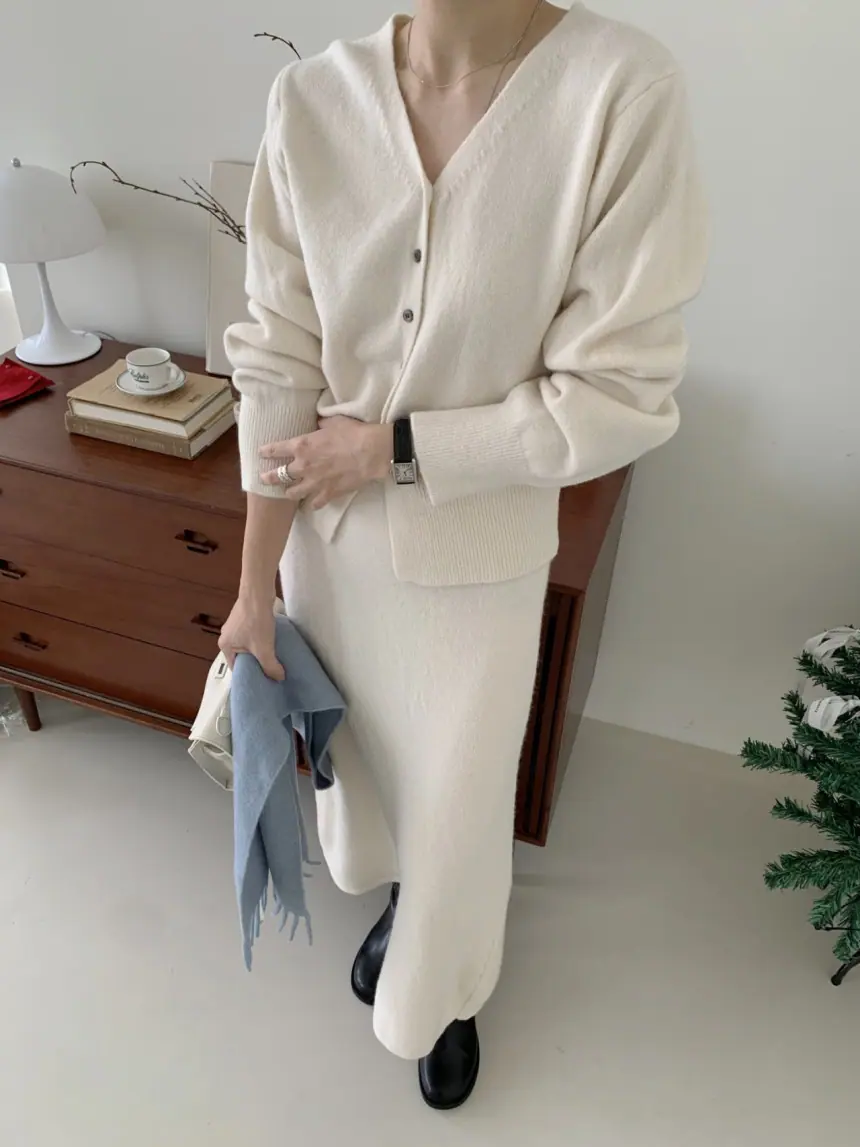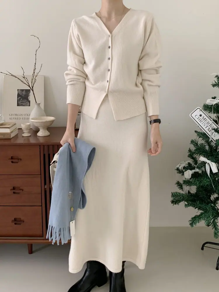 Cárdigan de Punto con Cuello en V de Moda Coreana + Conjunto de Suéter para Mujer con Falda Midi en A