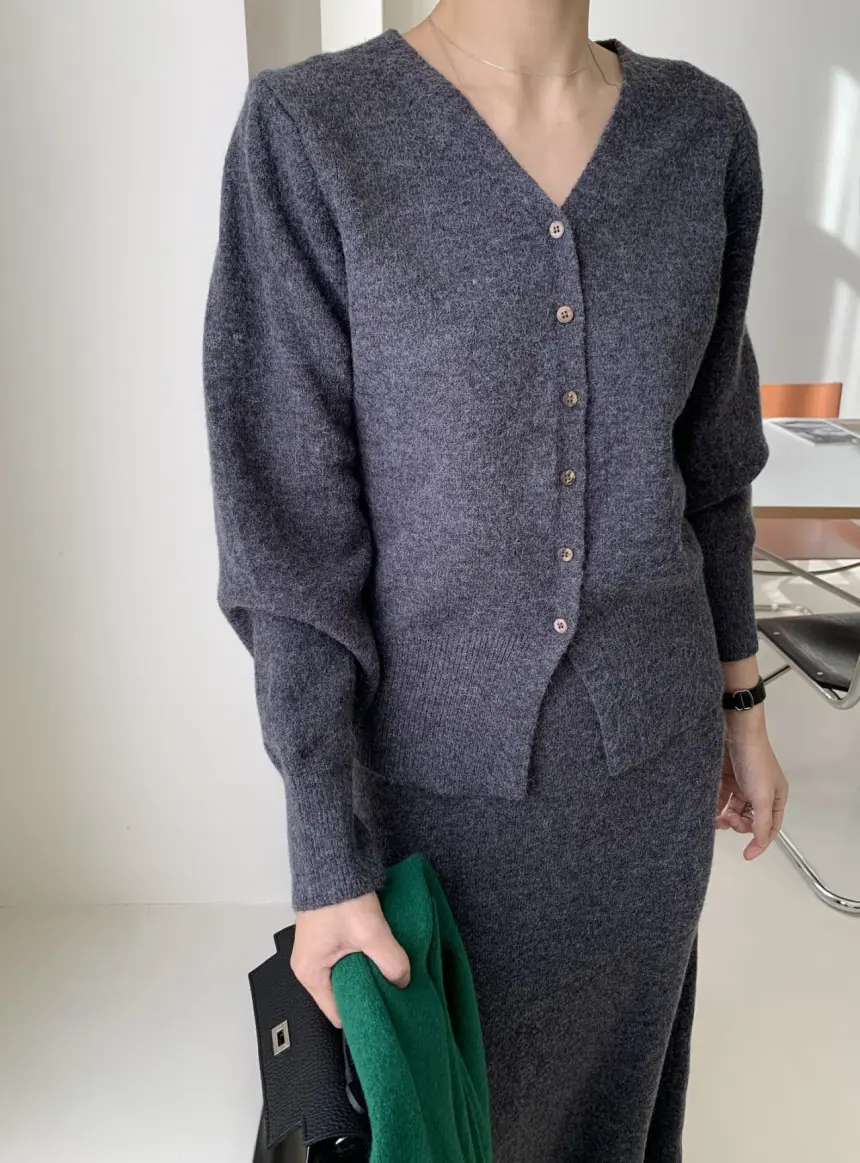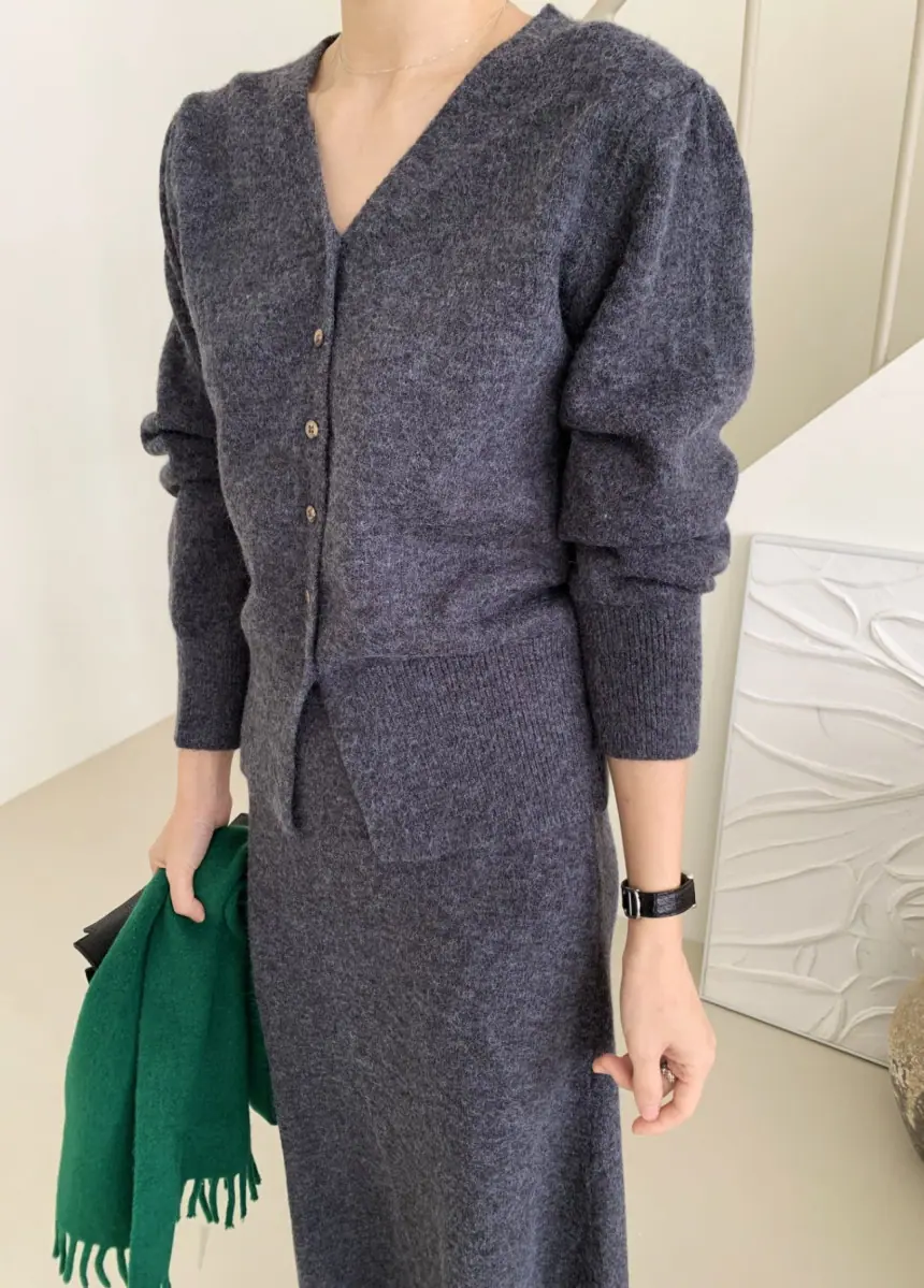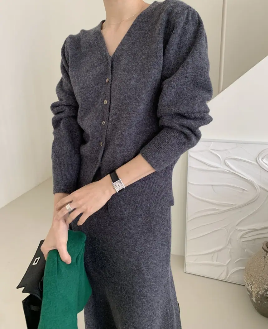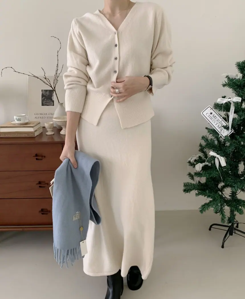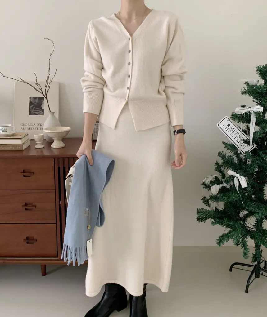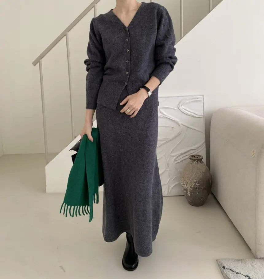 Cárdigan de Punto con Cuello en V de Moda Coreana + Conjunto de Suéter para Mujer con Falda Midi en A