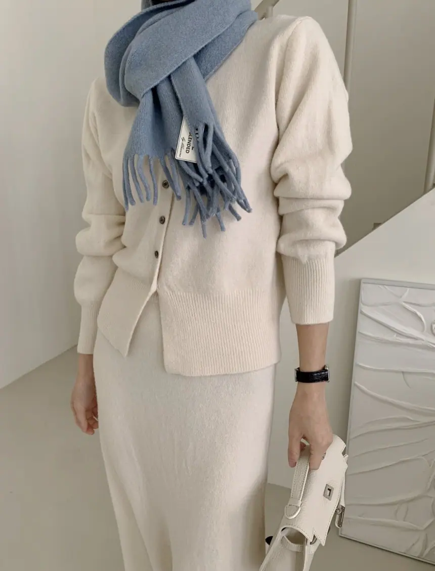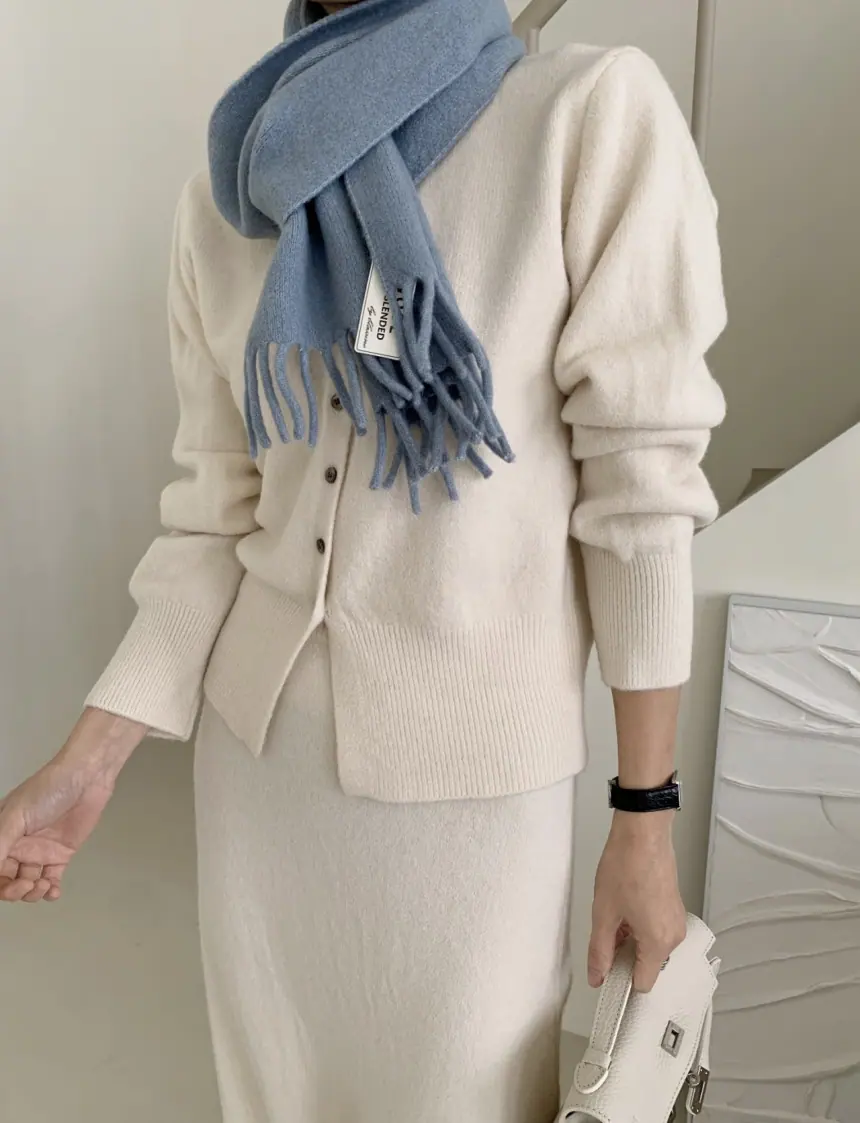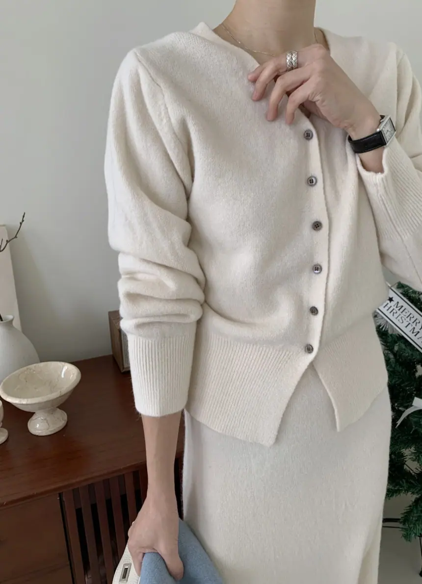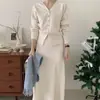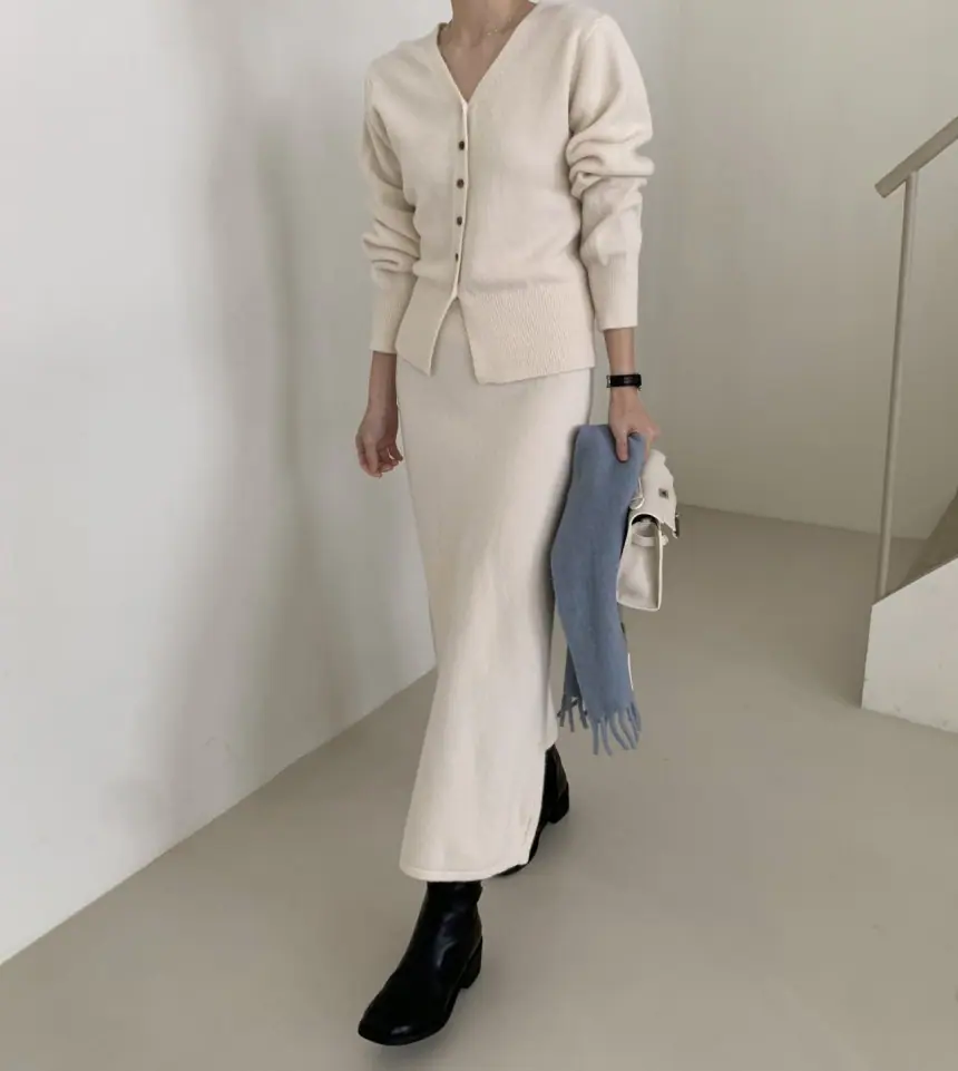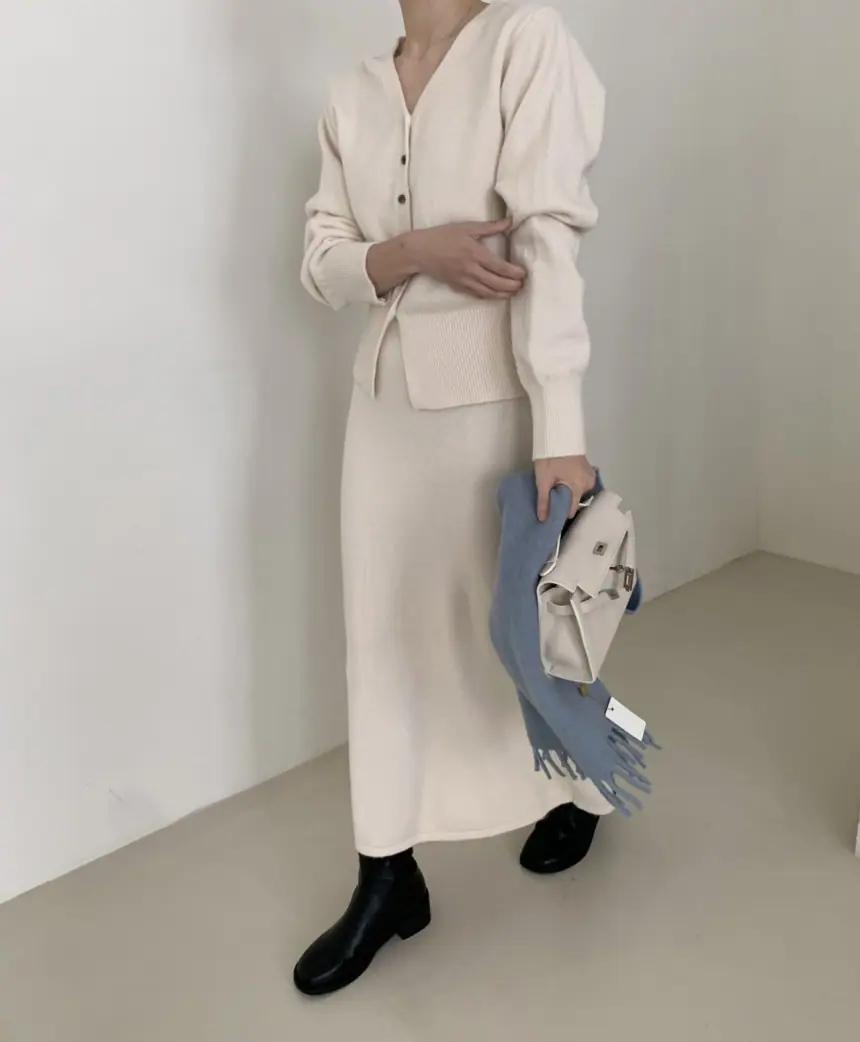 Cárdigan de Punto con Cuello en V de Moda Coreana + Conjunto de Suéter para Mujer con Falda Midi en A