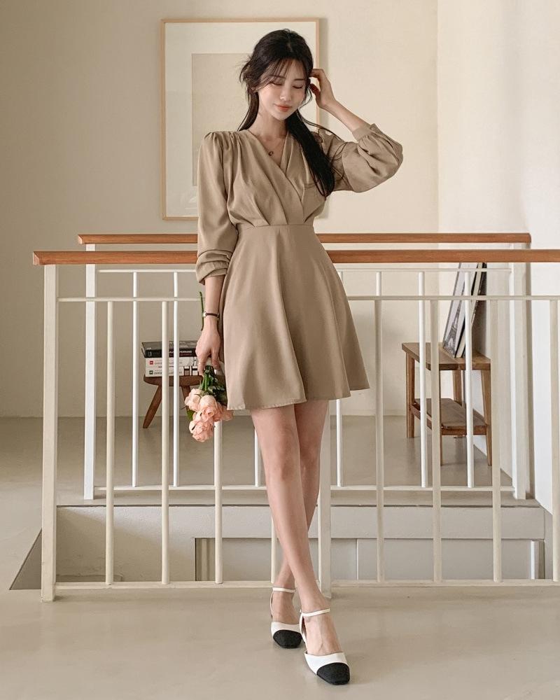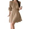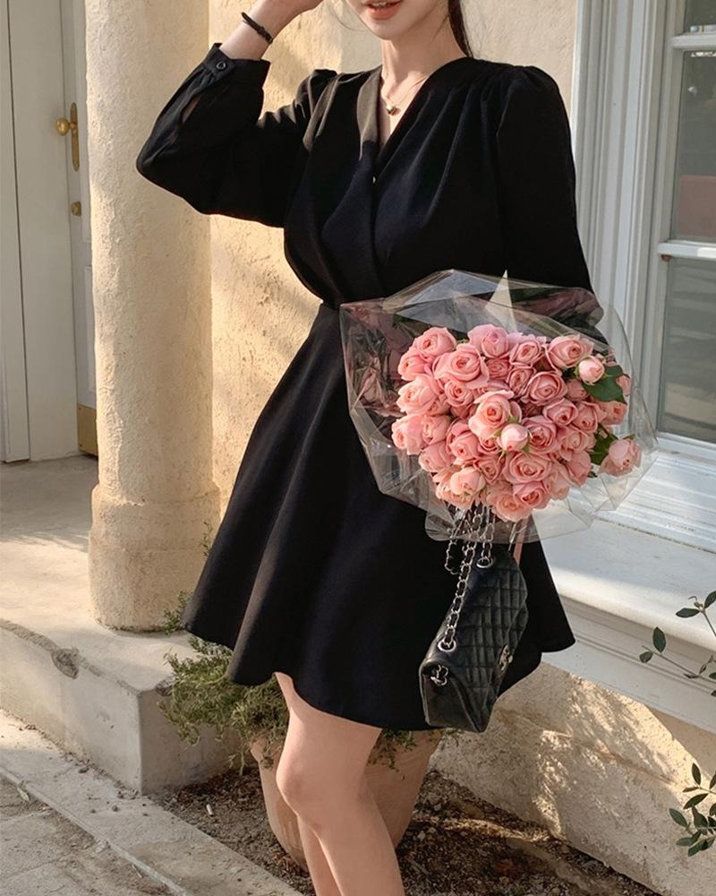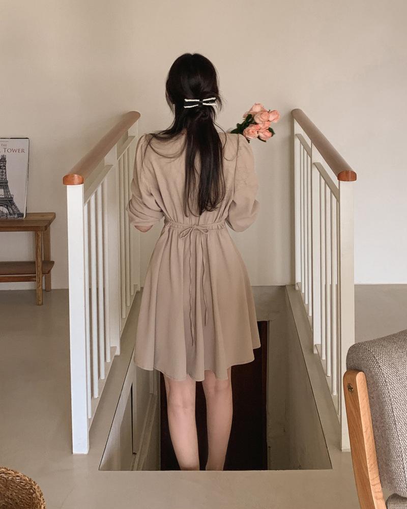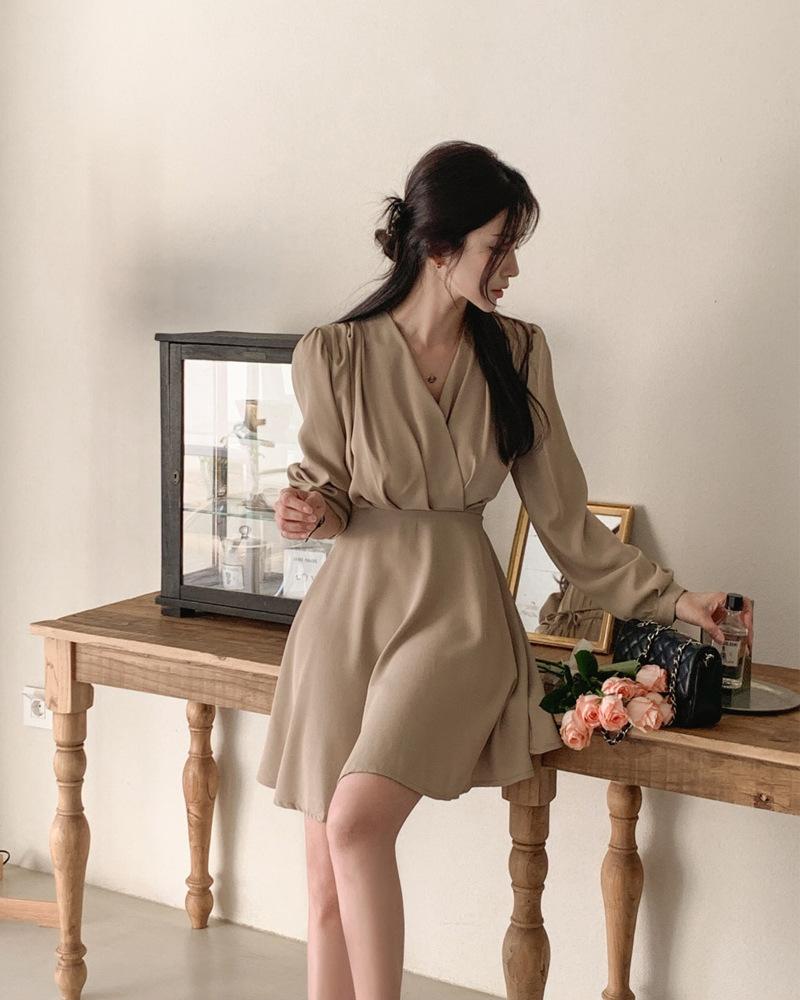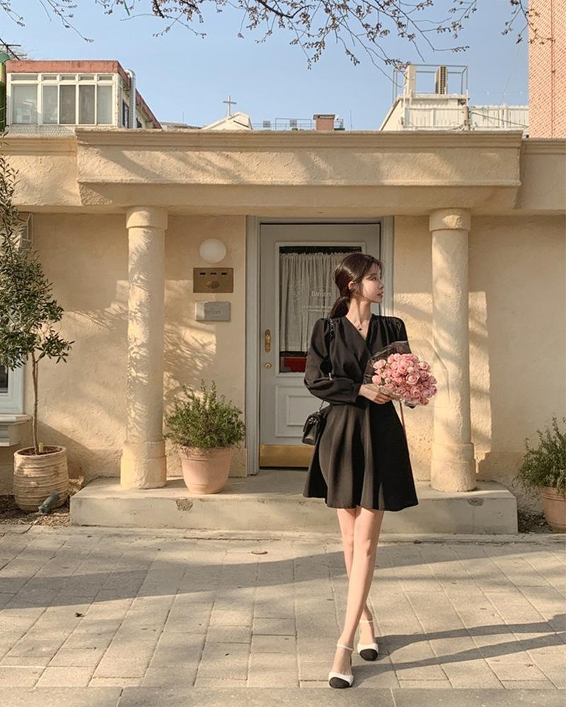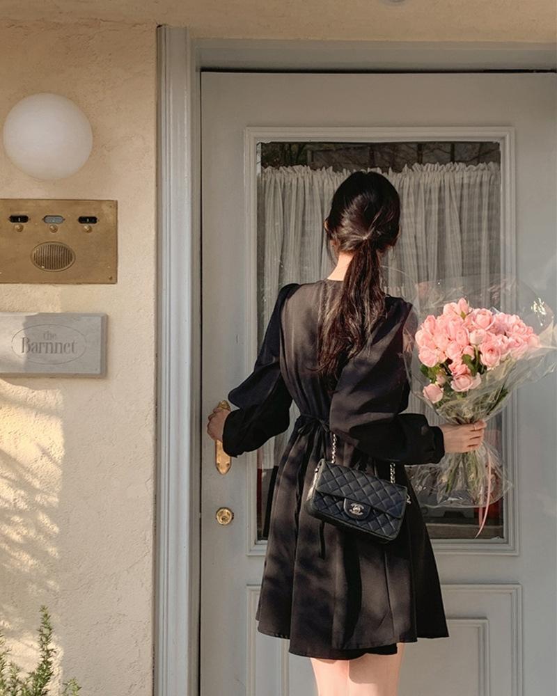 Vestido coreano chic con cuello en V francés y cinturón de temperamento
