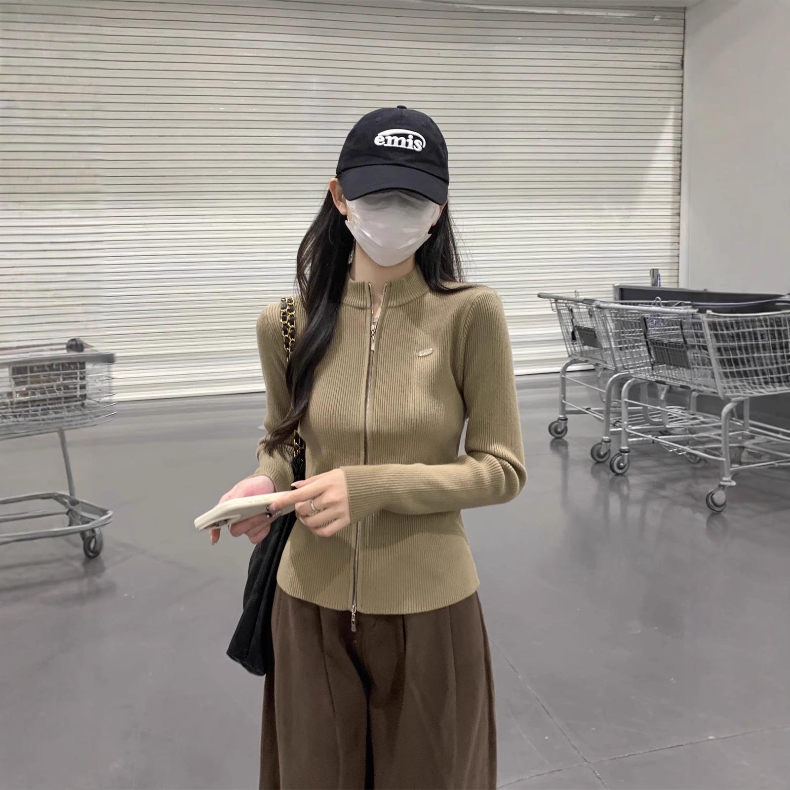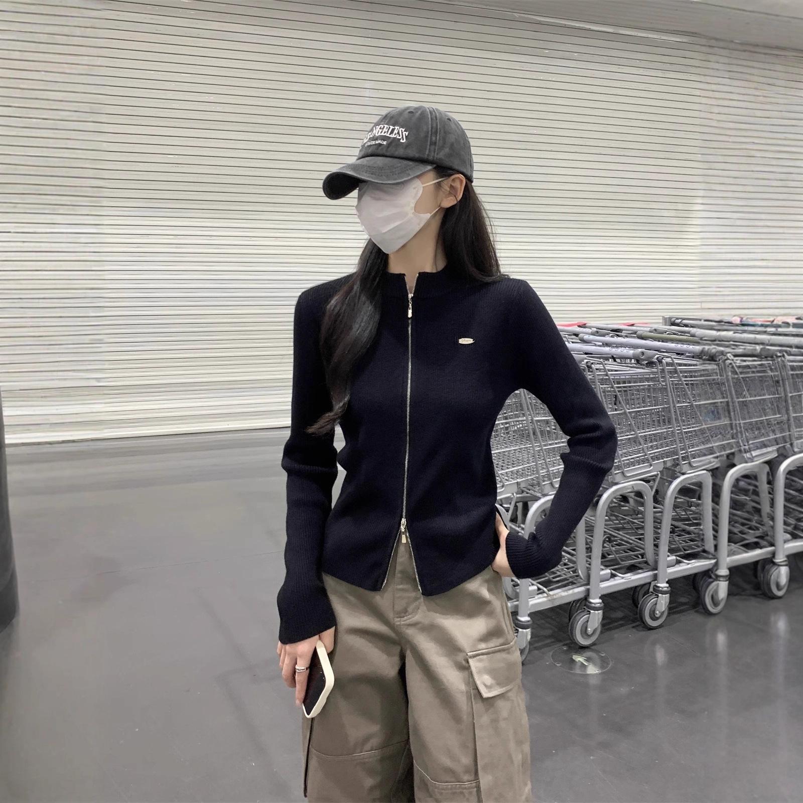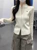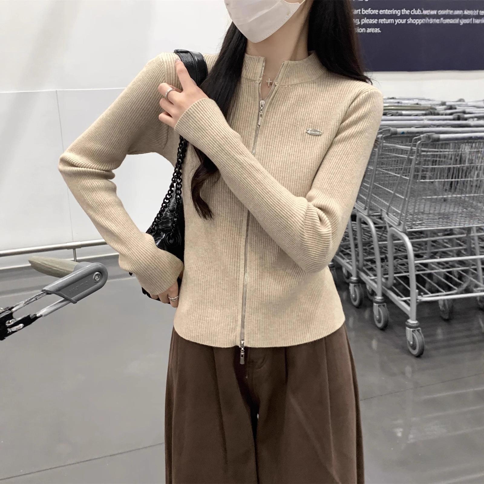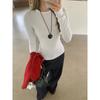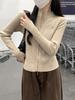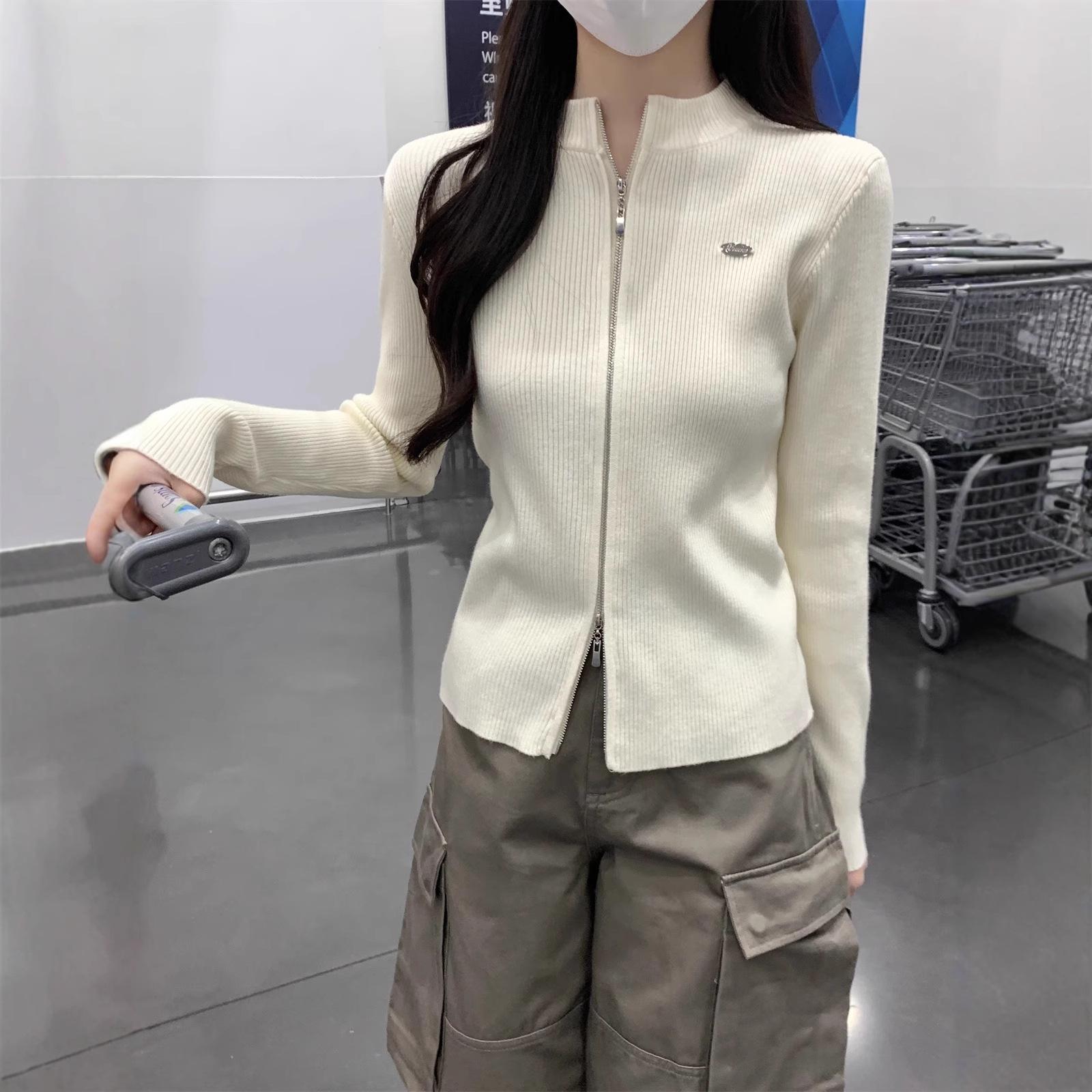 Top de Punto Blanco de Cuello Medio Alto con Doble Cremallera para Mujer Otoño Adelgazante Capa Base Suéter Corto de Cintura Alta