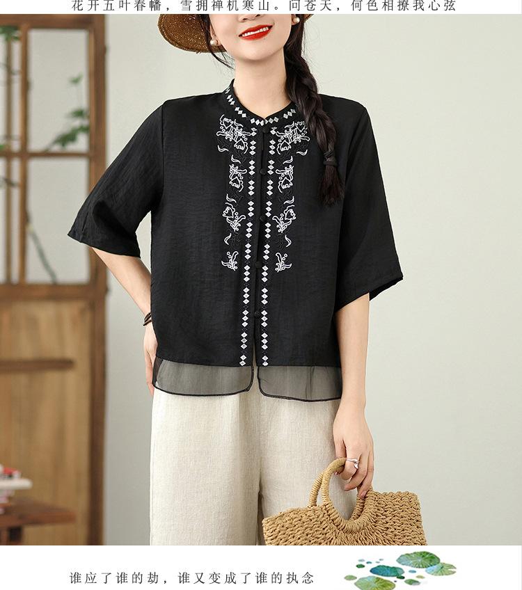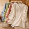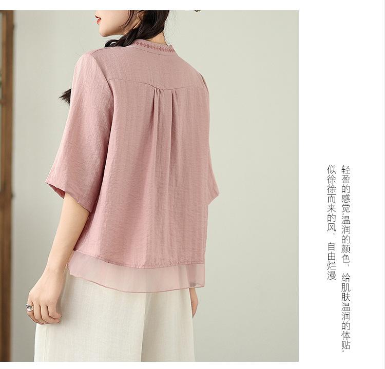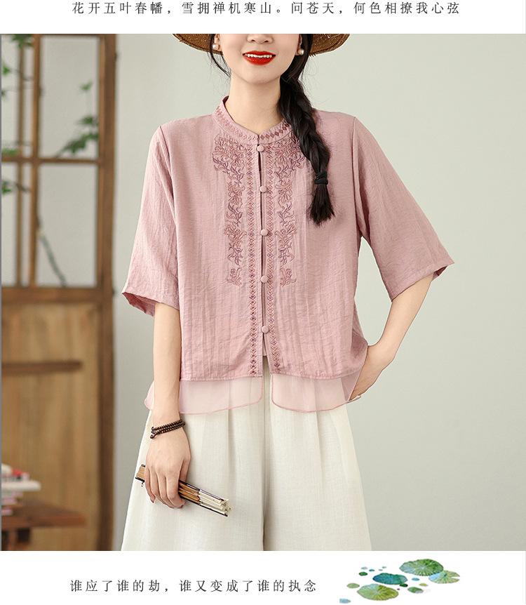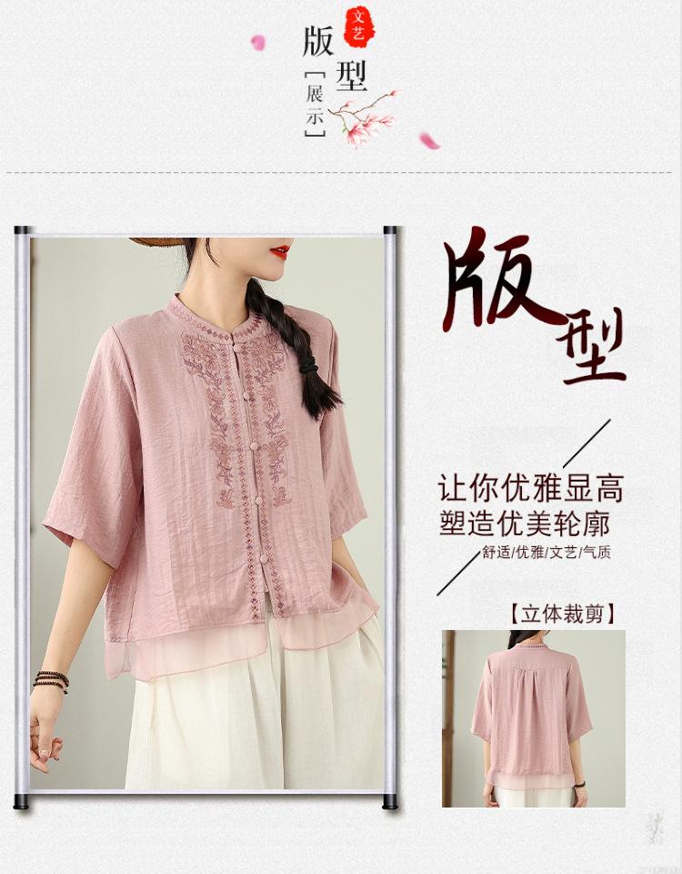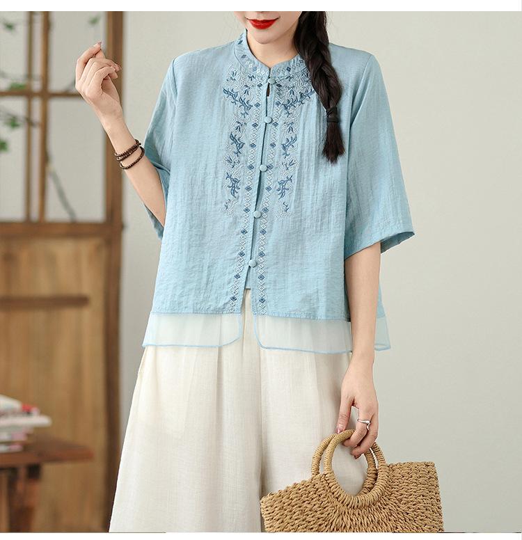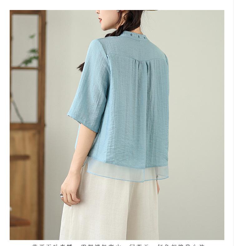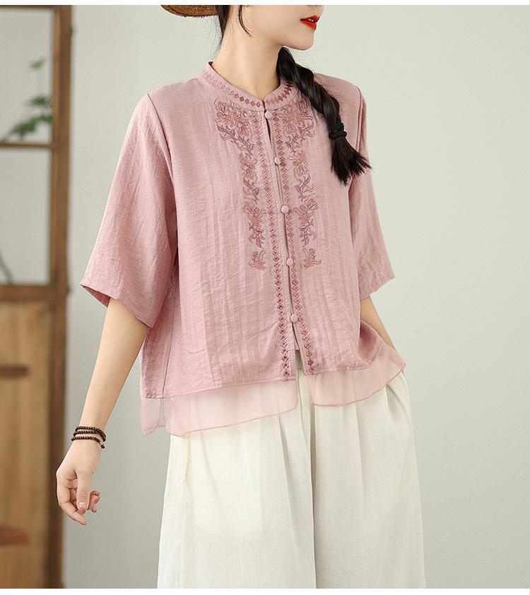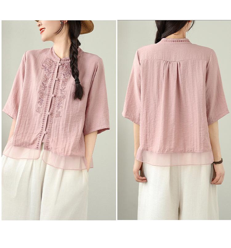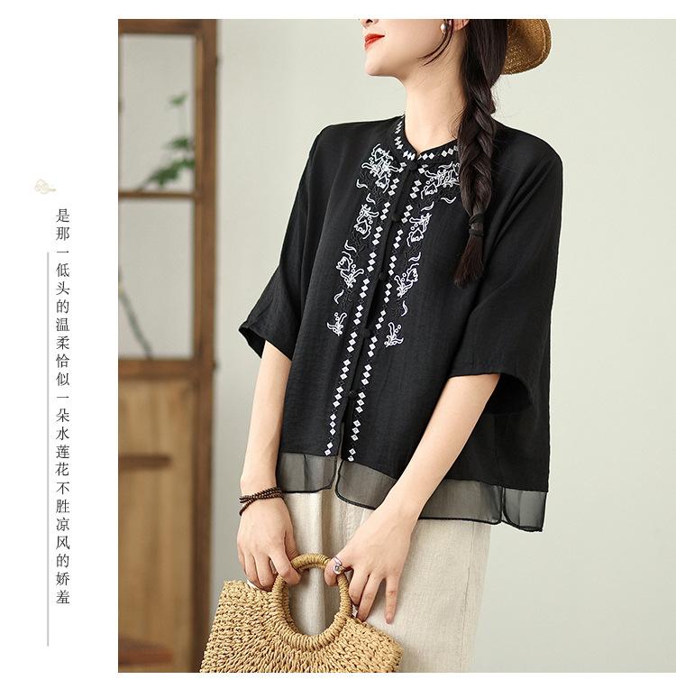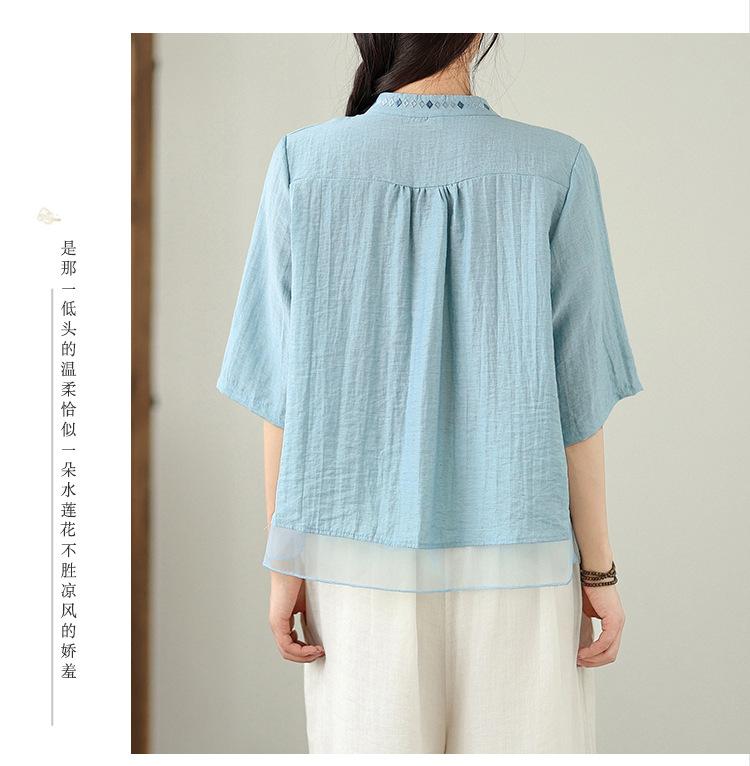 Foto Real Verano 2025 Color Sólido Nuevo Literario Bordado Patchwork Casual Simple Suelto Top Camisa Nuevo Estilo Chino