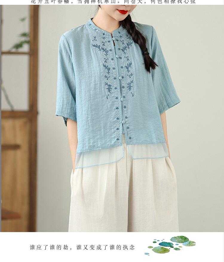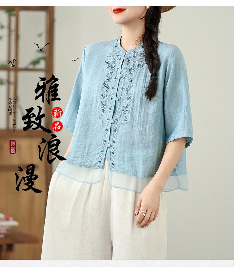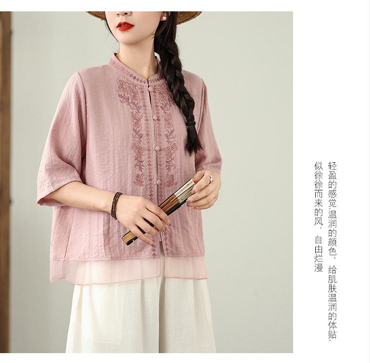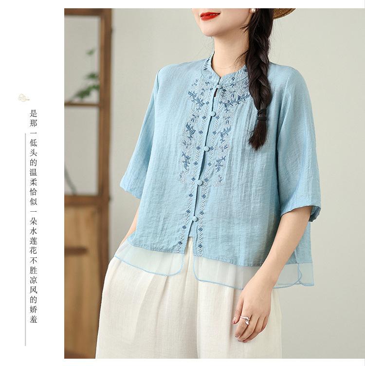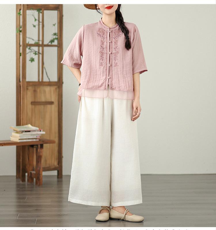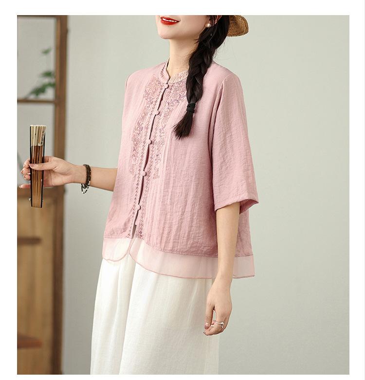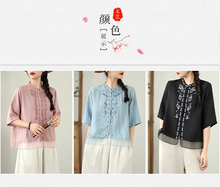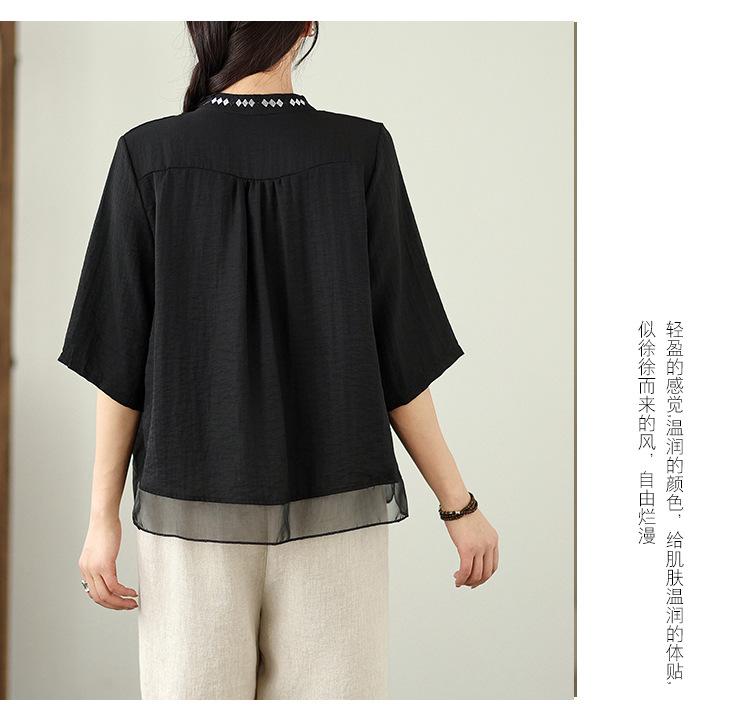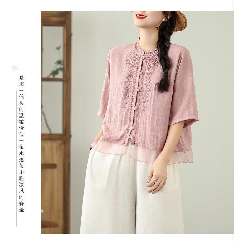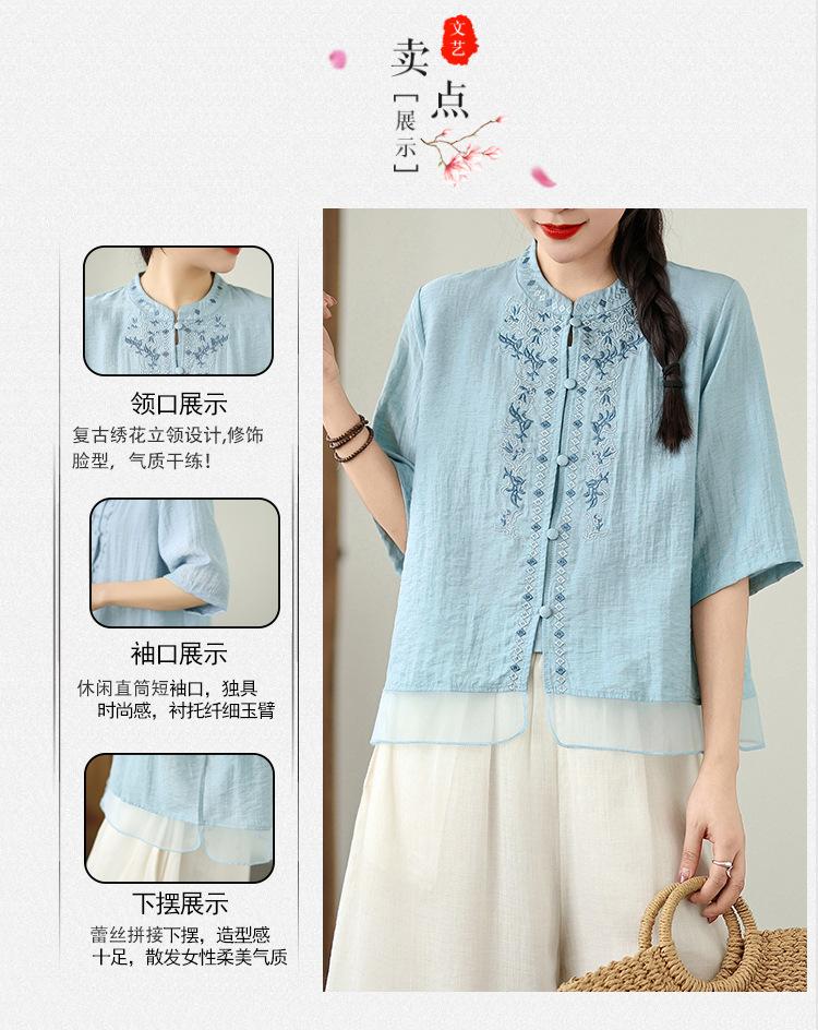 Foto Real Verano 2025 Color Sólido Nuevo Literario Bordado Patchwork Casual Simple Suelto Top Camisa Nuevo Estilo Chino