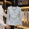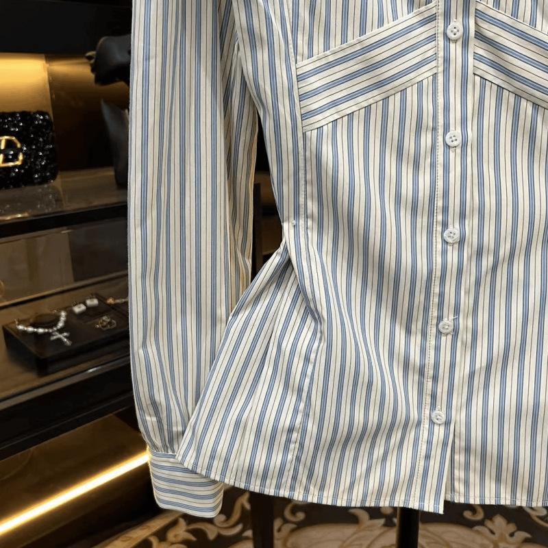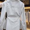 Compra Camisa de rayas de manga larga para mujer, Otoño 2025, Nueva, Sensación de nicho, Versátil, Adelgazante, Cuello redondo con cinta tejida al por mayor en Joom.pro
