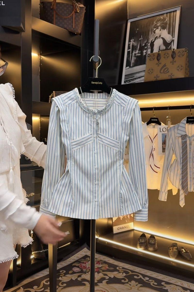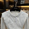 Camisa de rayas de manga larga para mujer, Otoño 2025, Nueva, Sensación de nicho, Versátil, Adelgazante, Cuello redondo con cinta tejida