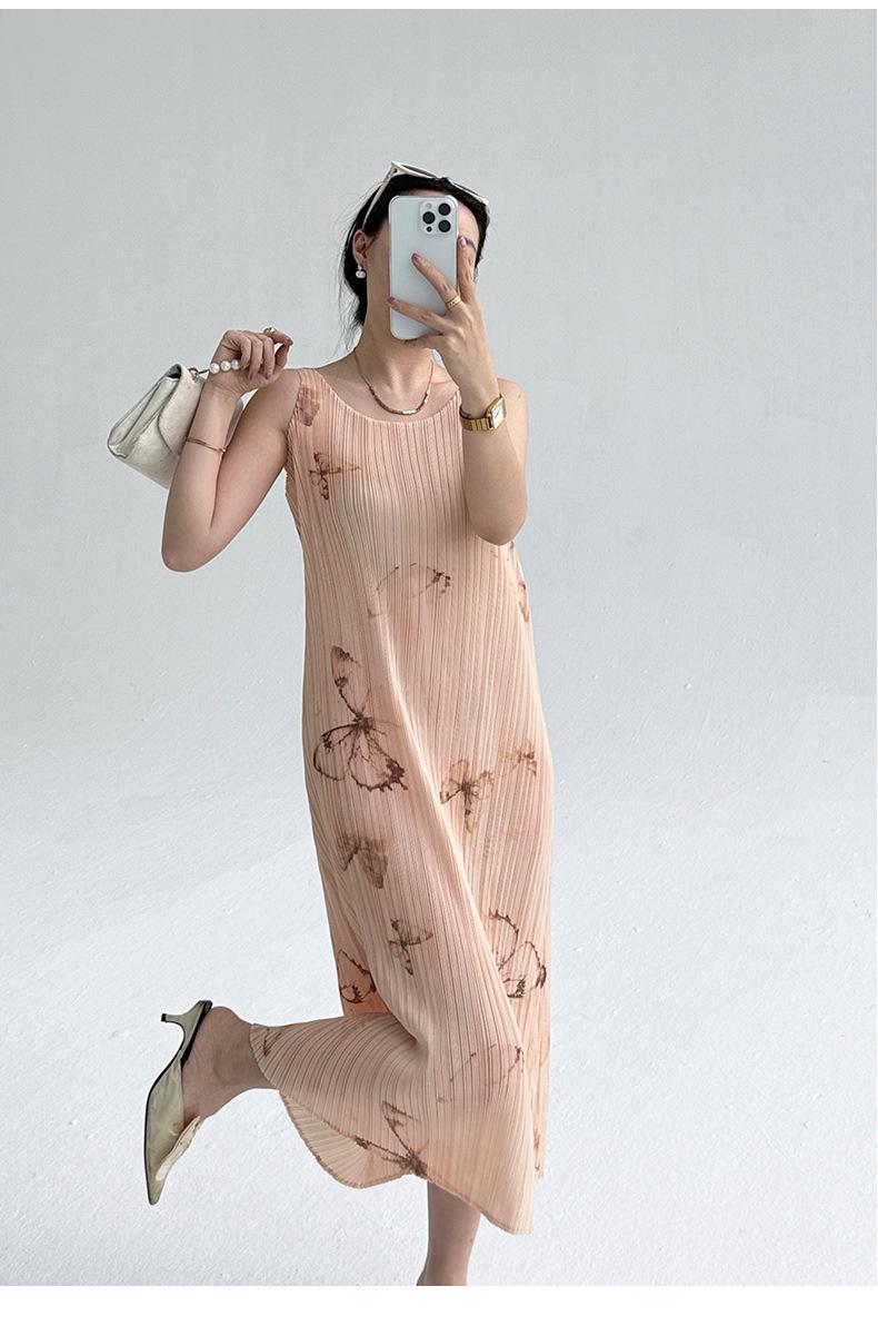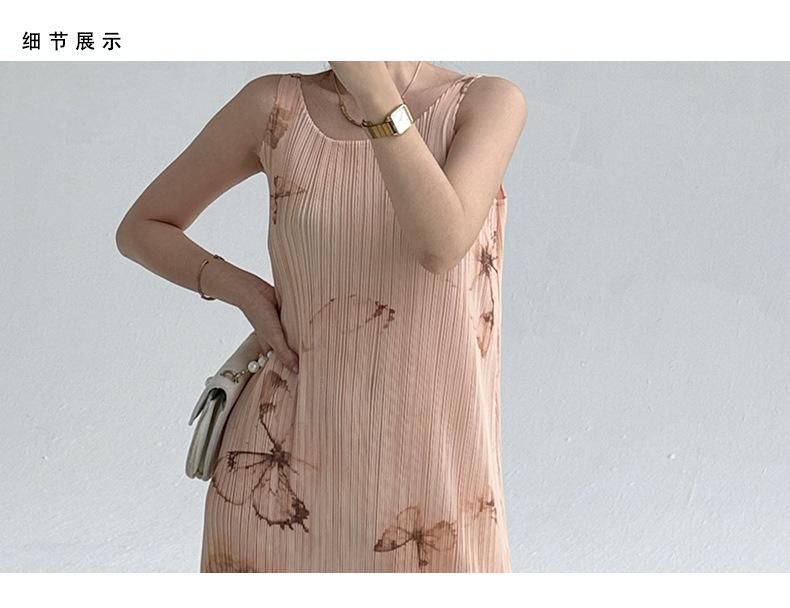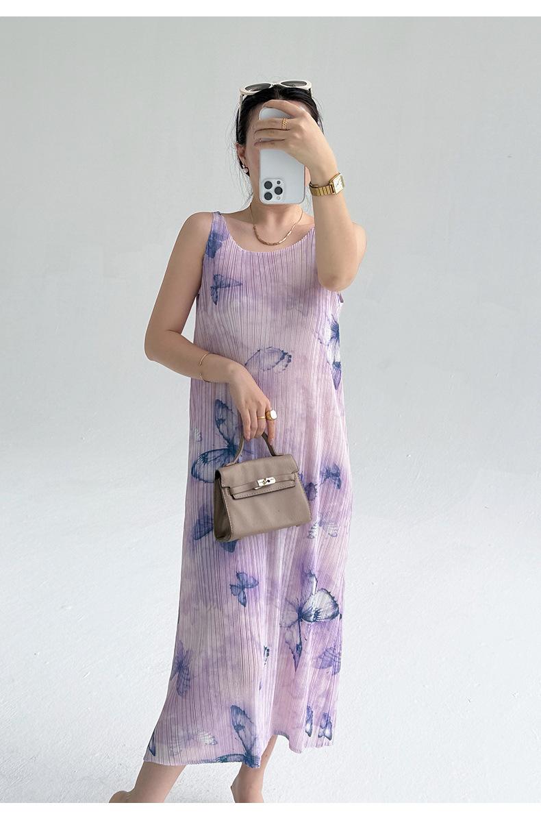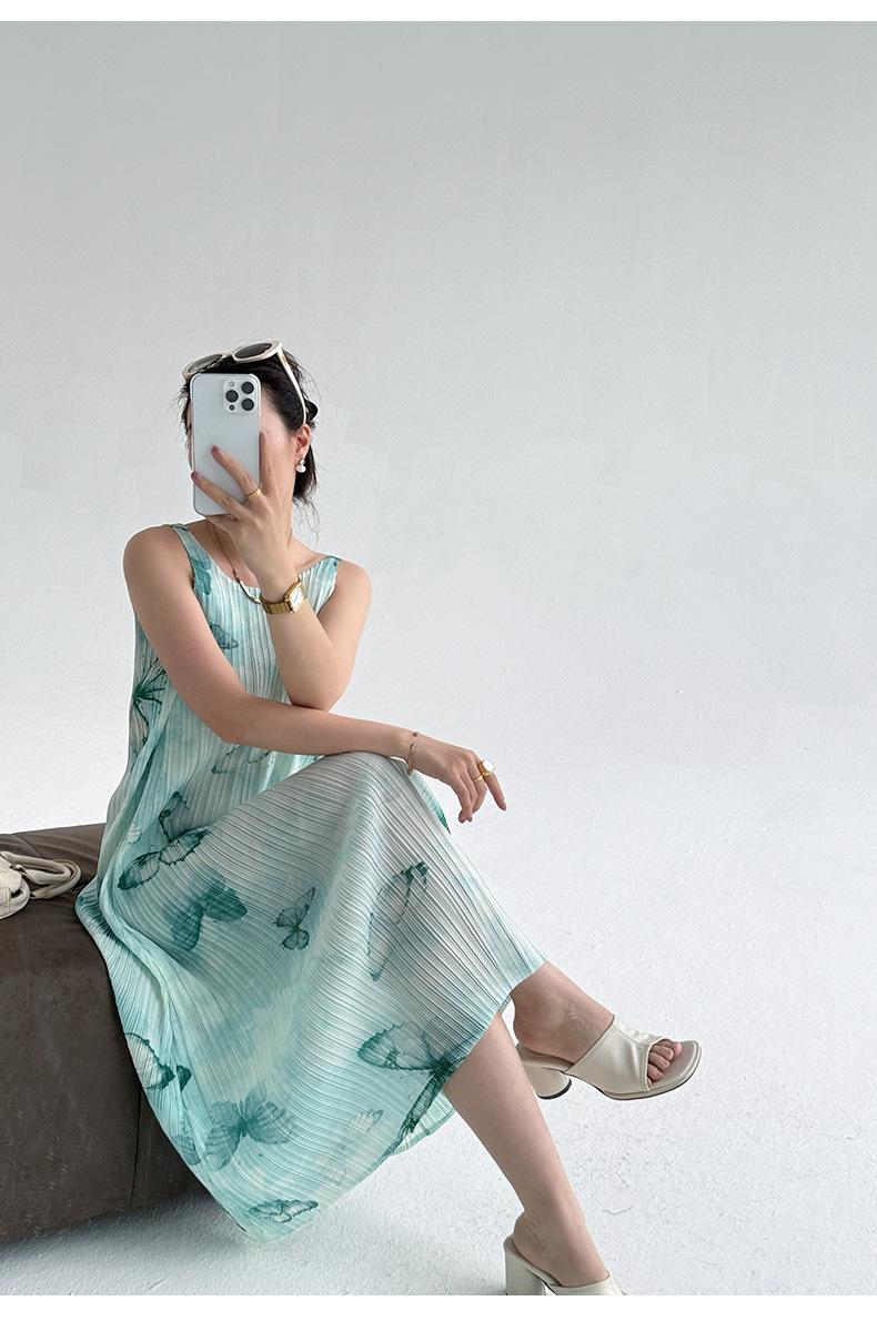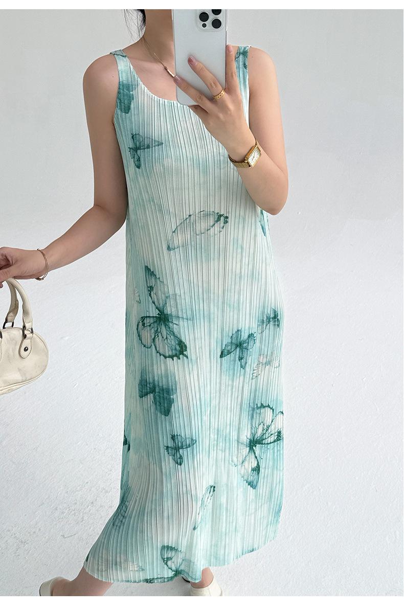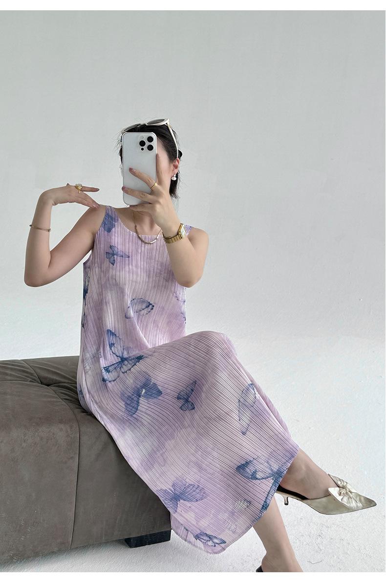 Verano 2025 Nuevo Miyake Vestido de Alta Gama Degradado Cuello Redondo Sin Mangas Nicho Francés Entallado con Pliegues Mujer