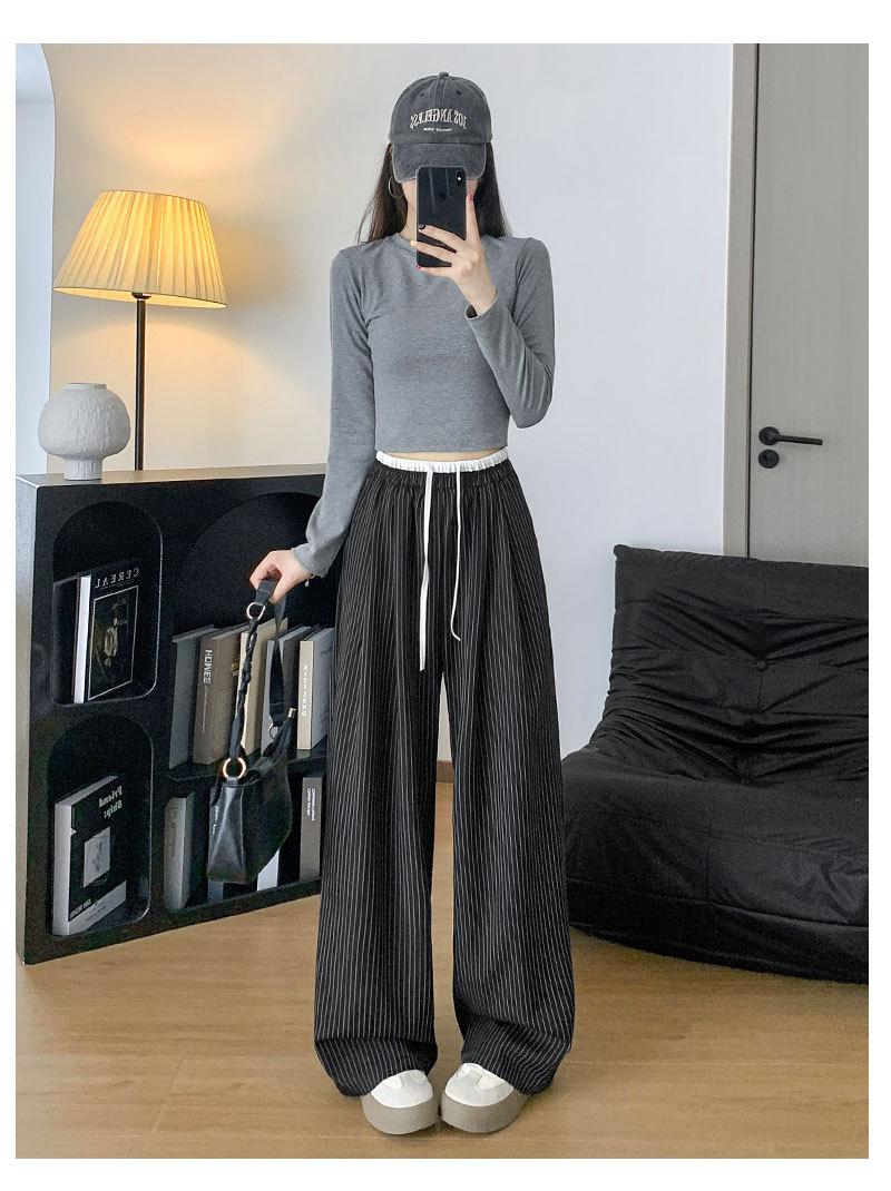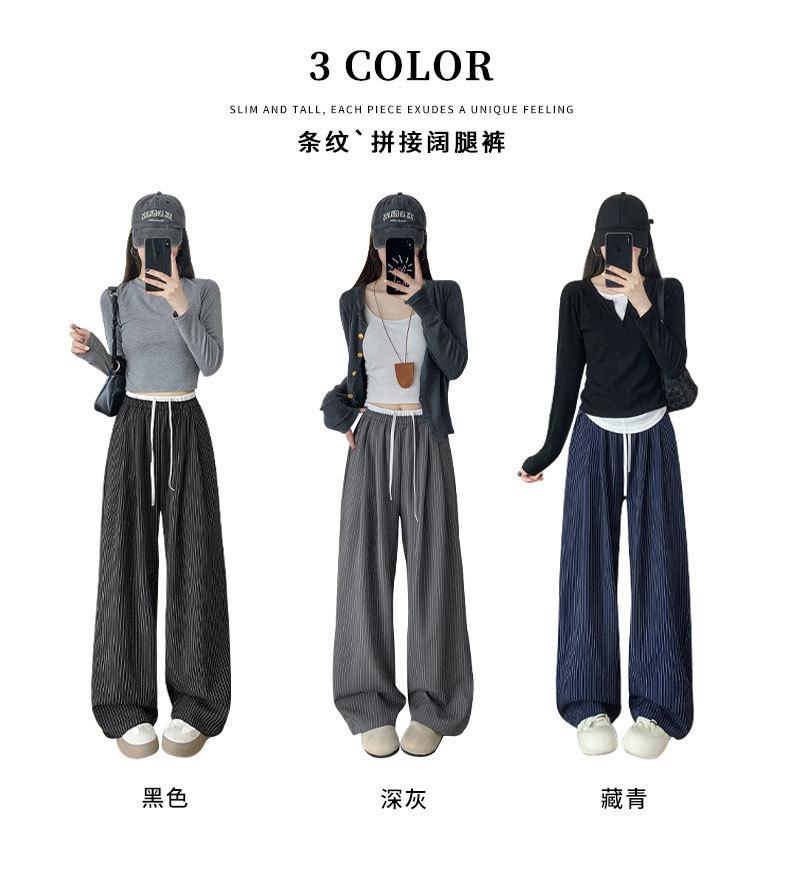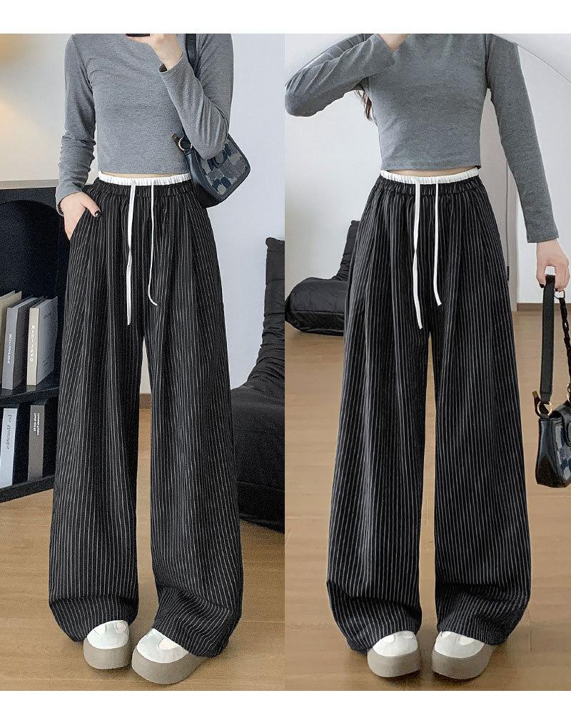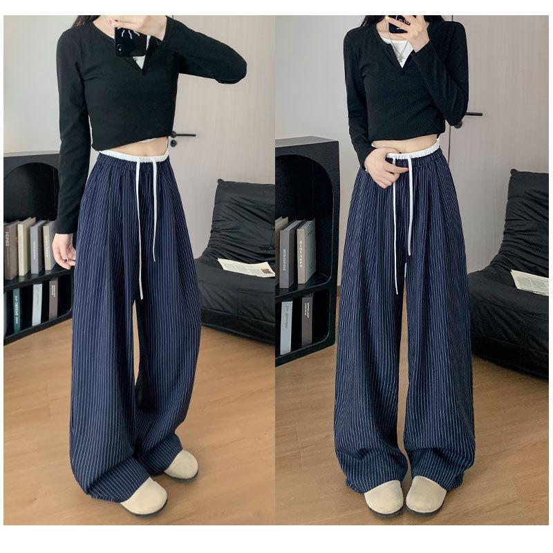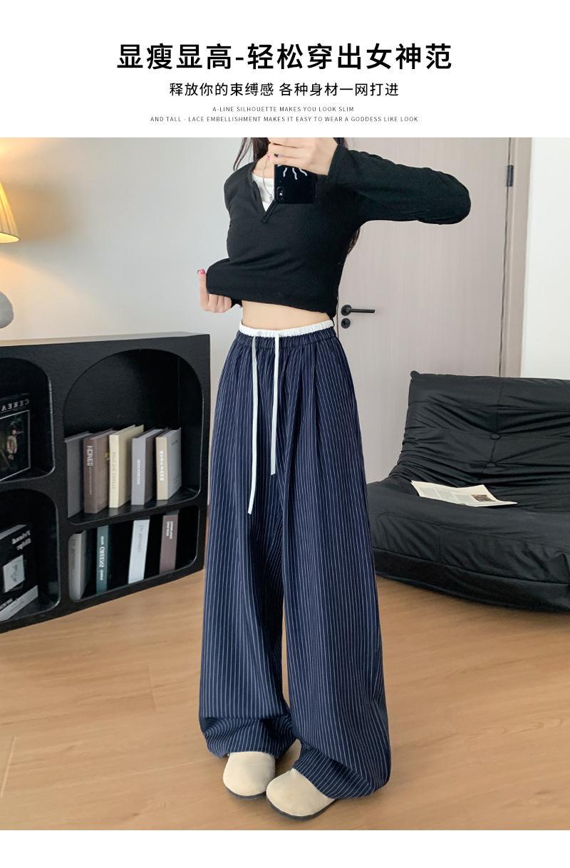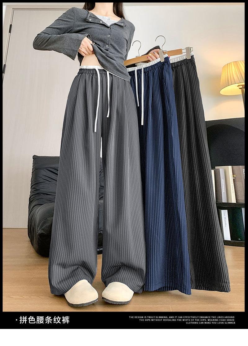 Pantalones Casuales de Pierna Ancha con Rayas y Cintura Color Block Retro Americano para Mujer Primavera Otoño Cintura Alta Drapeados Sueltos Adelgazantes Hasta el Piso