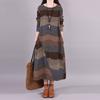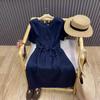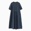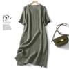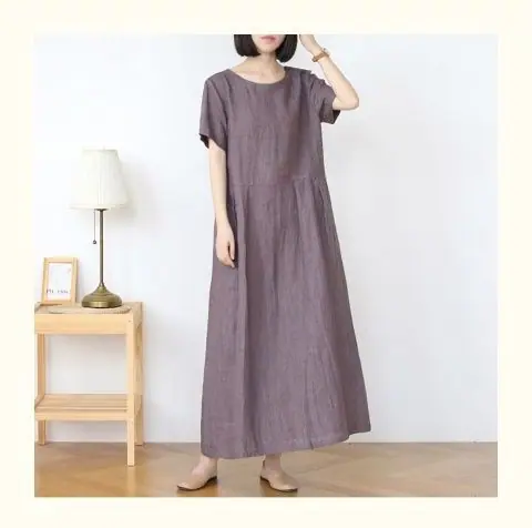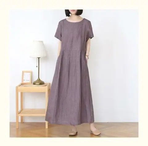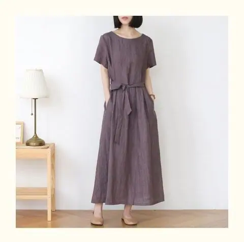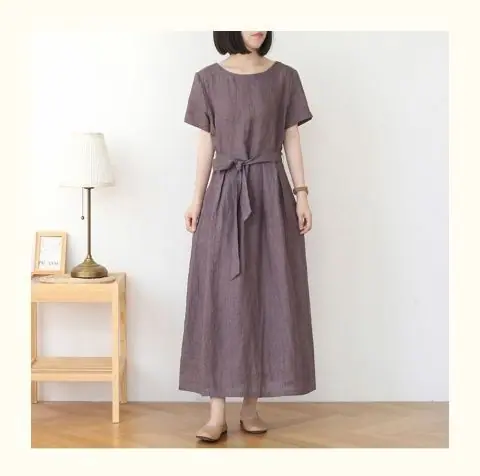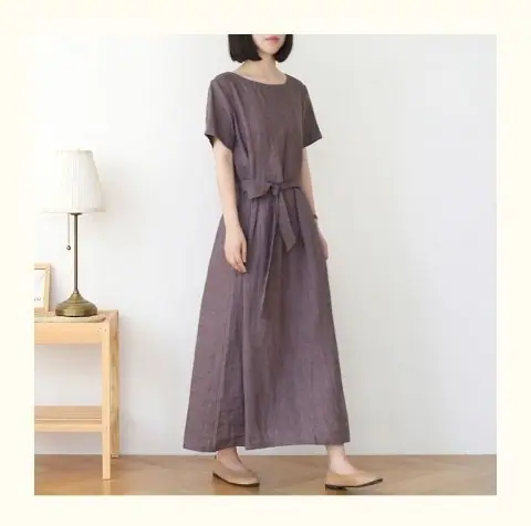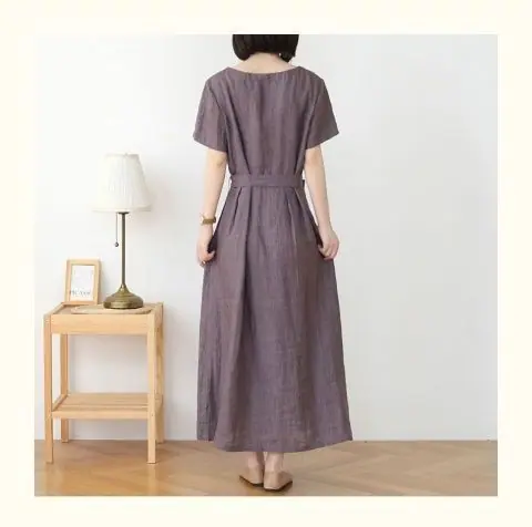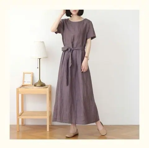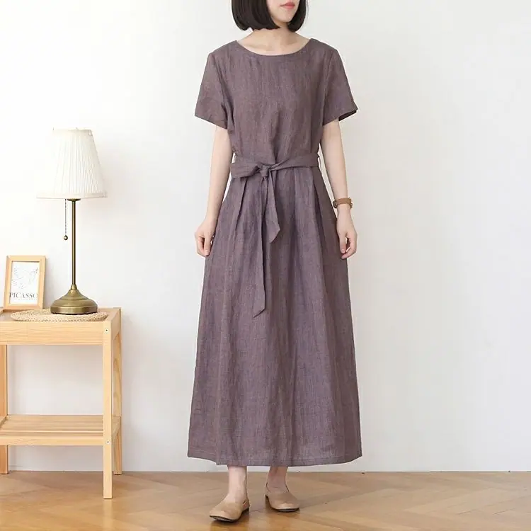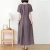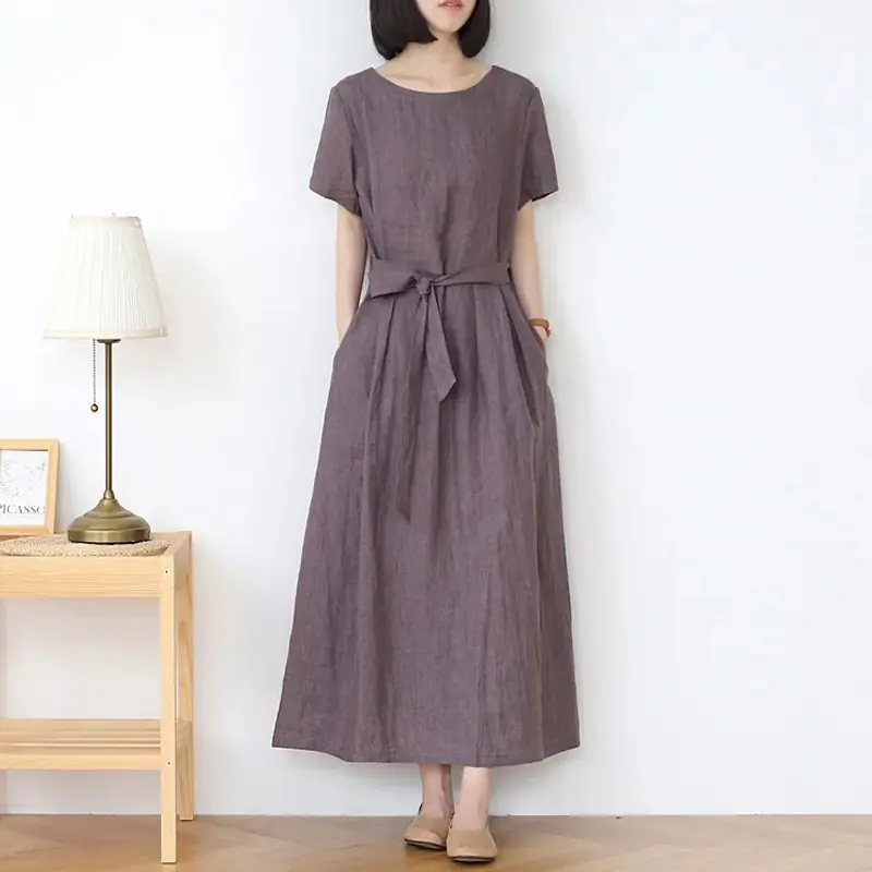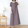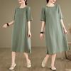 Vestido nuevo de verano de manga corta y cuello redondo de algodón y lino, vestido literario retro holgado de color sólido para mujer, moda de corbata