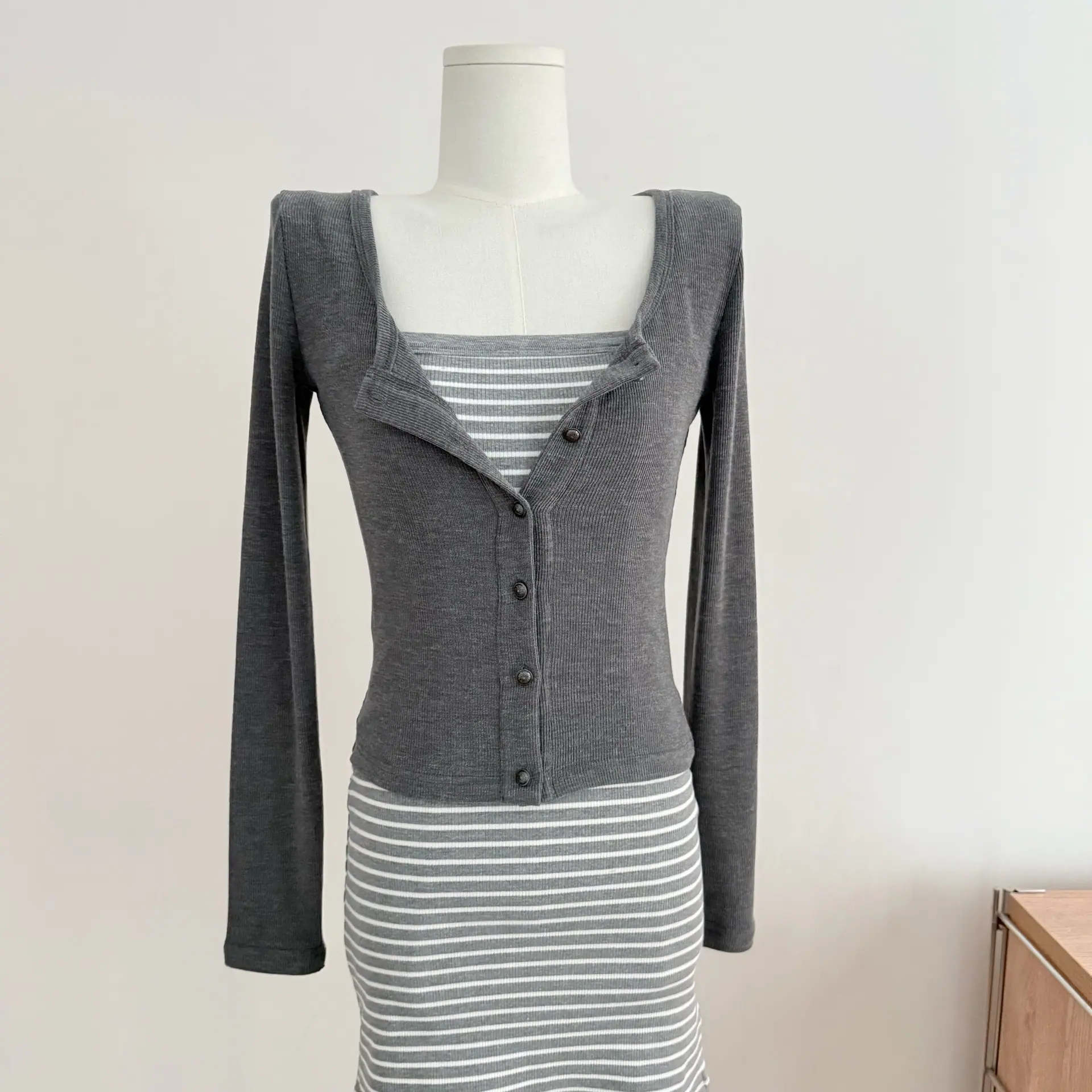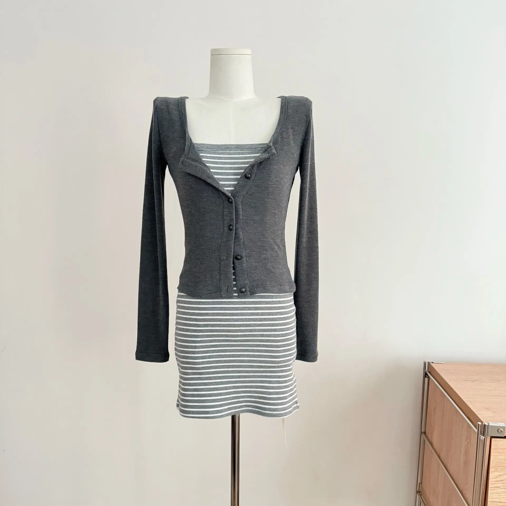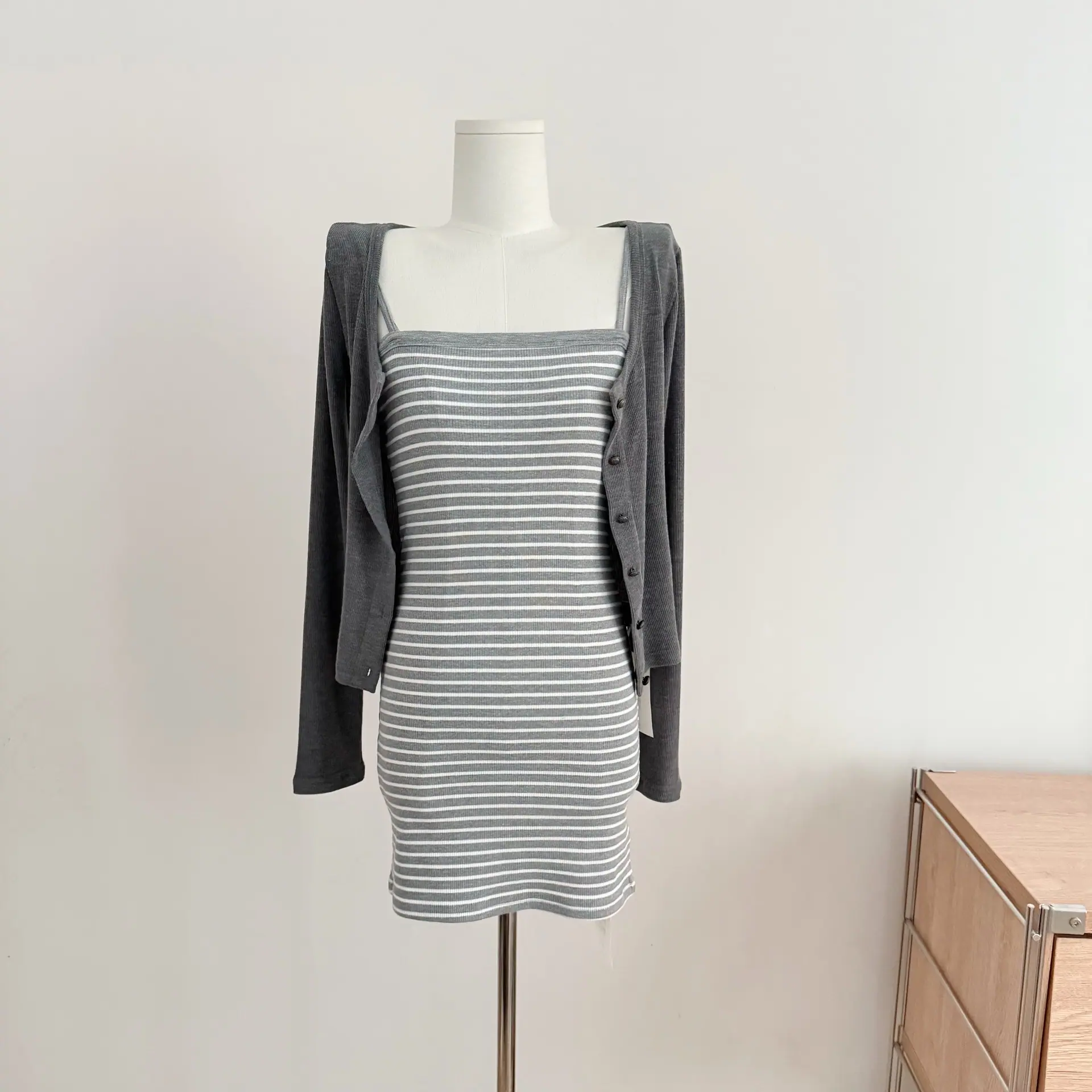 Un conjunto completo de outfits ootd conjunto de otoño cárdigan de punto simple y adelgazante vestido lencero a rayas