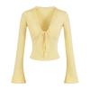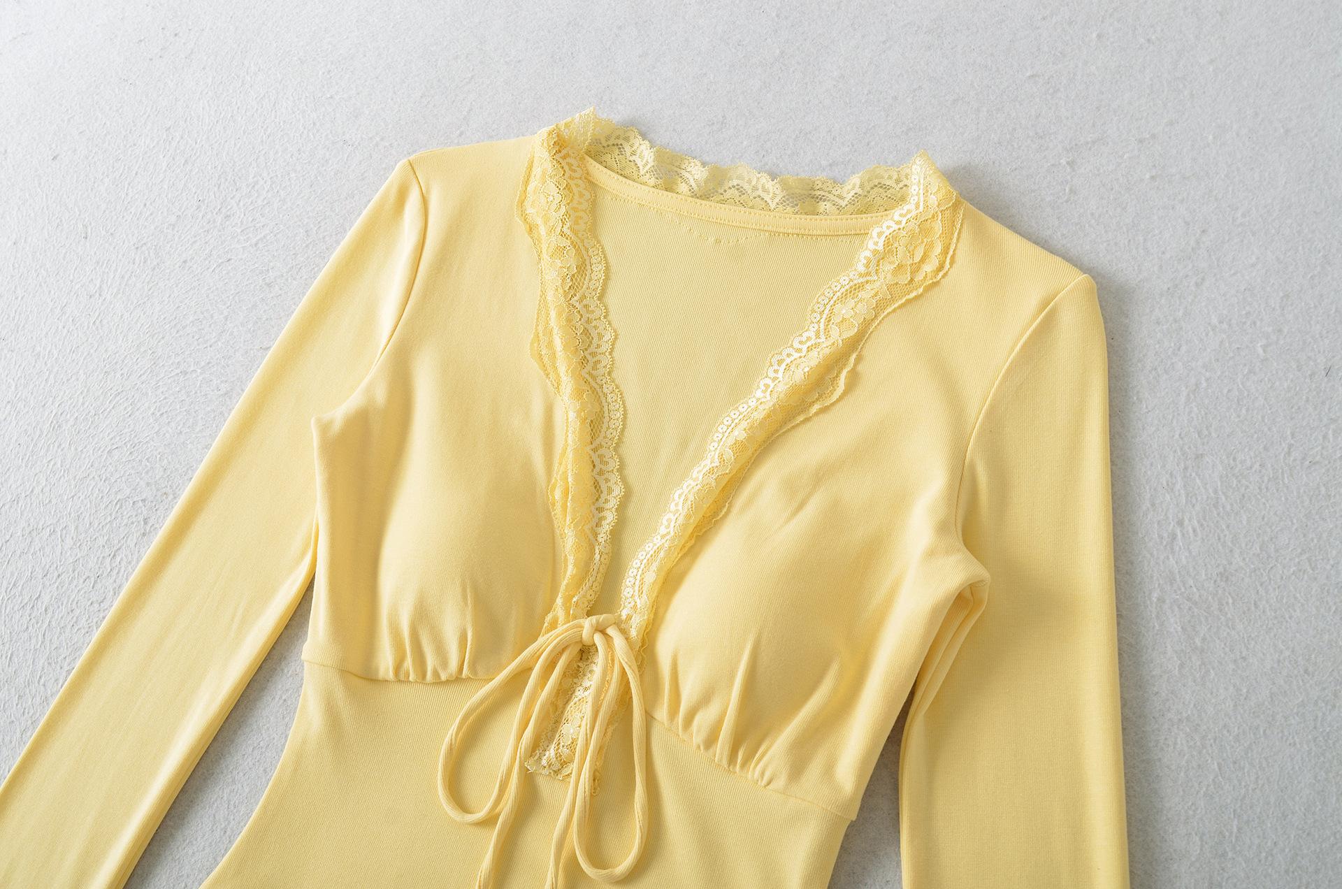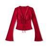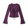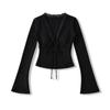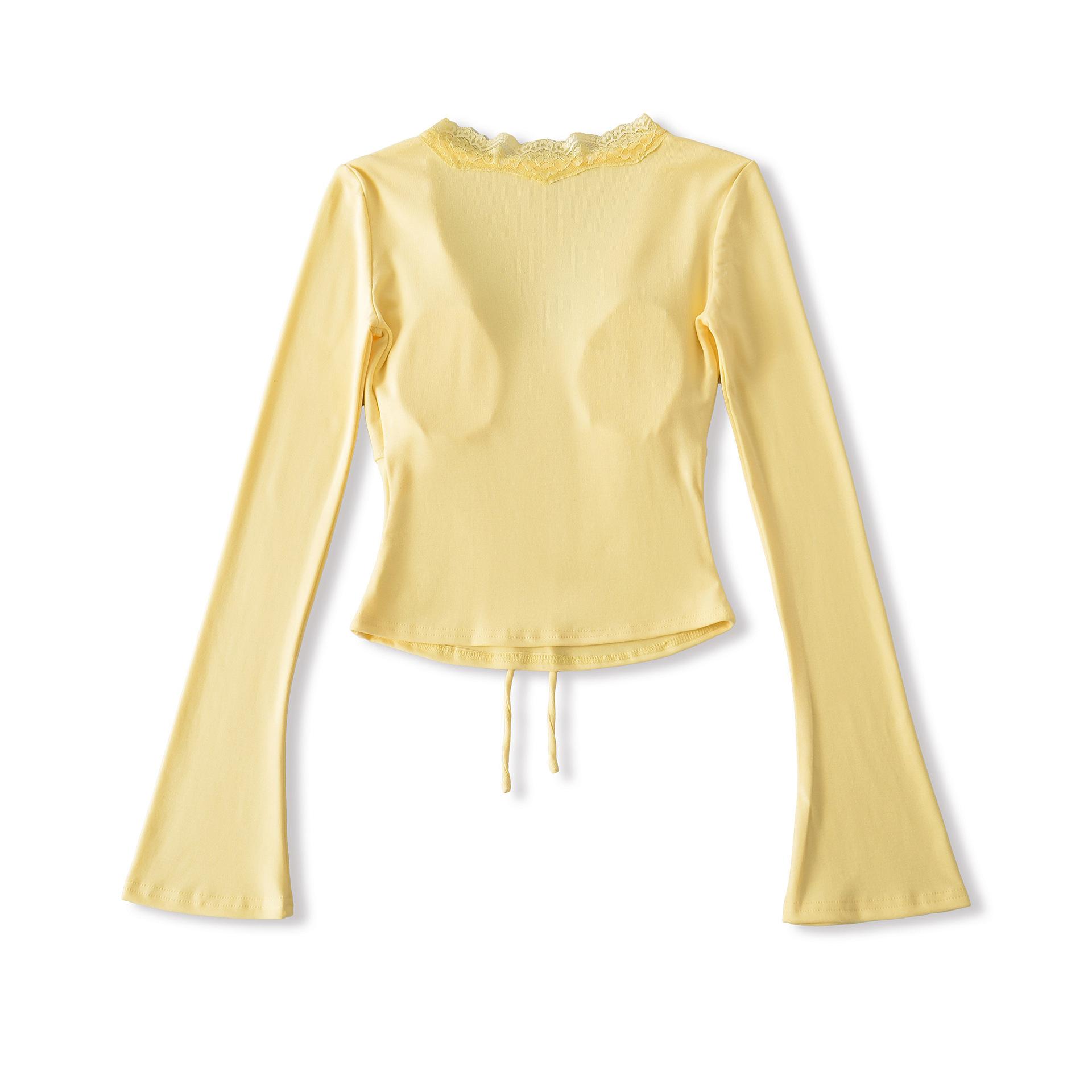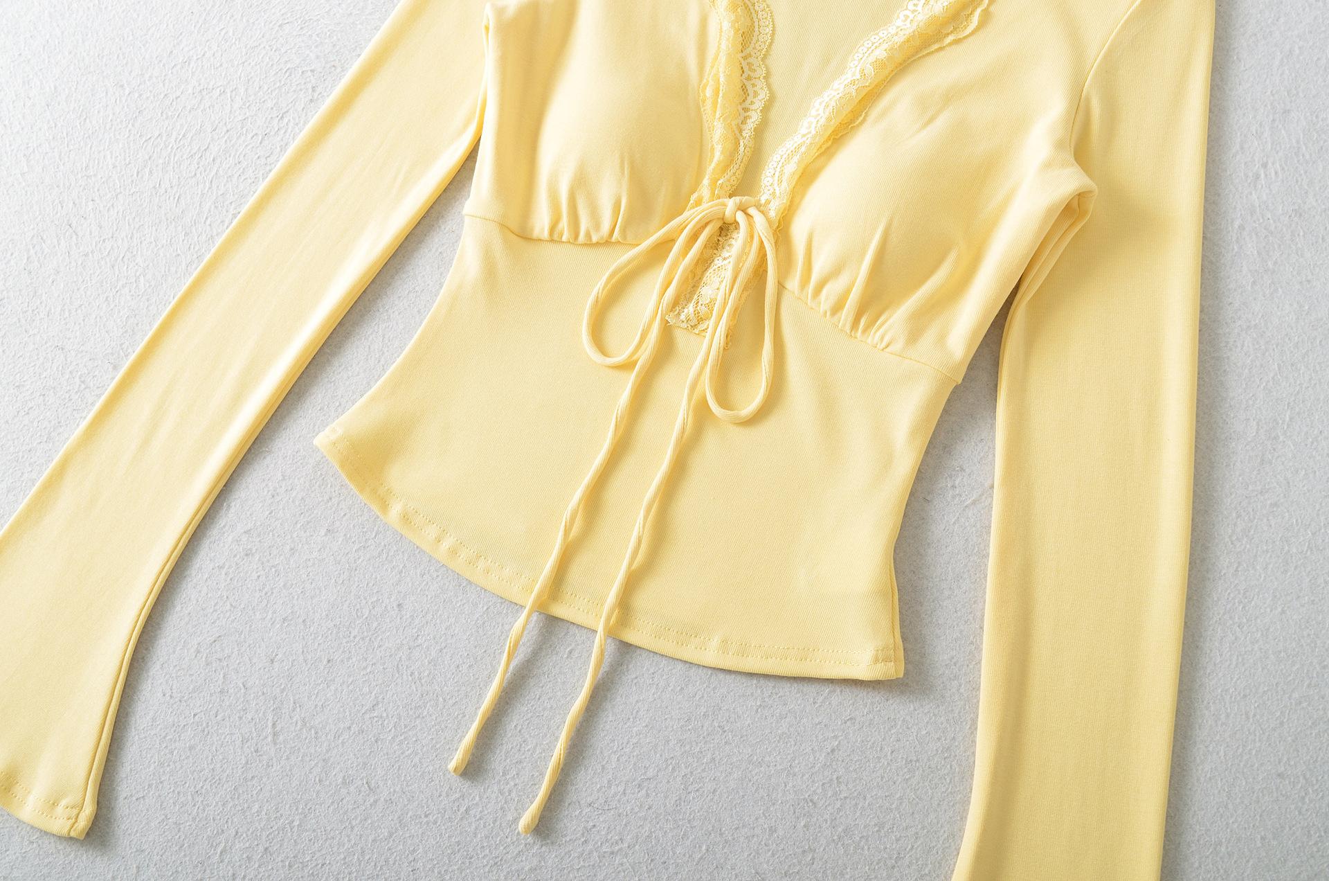 25 Otoño Nuevo Encaje Cuello en V Atado Manga Larga Acampanada Camiseta Corta Estilo Deseo Puro Americano Encaje