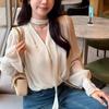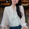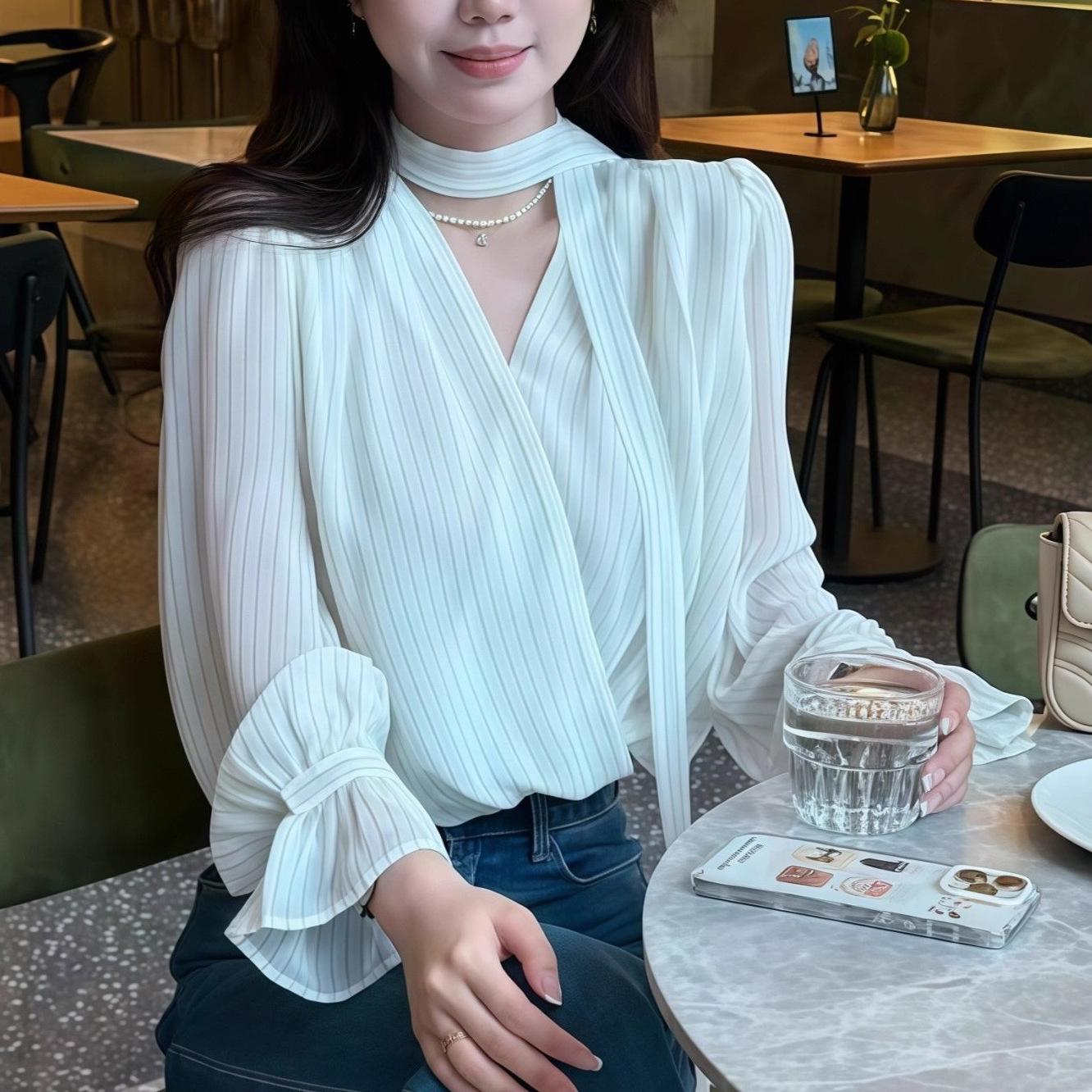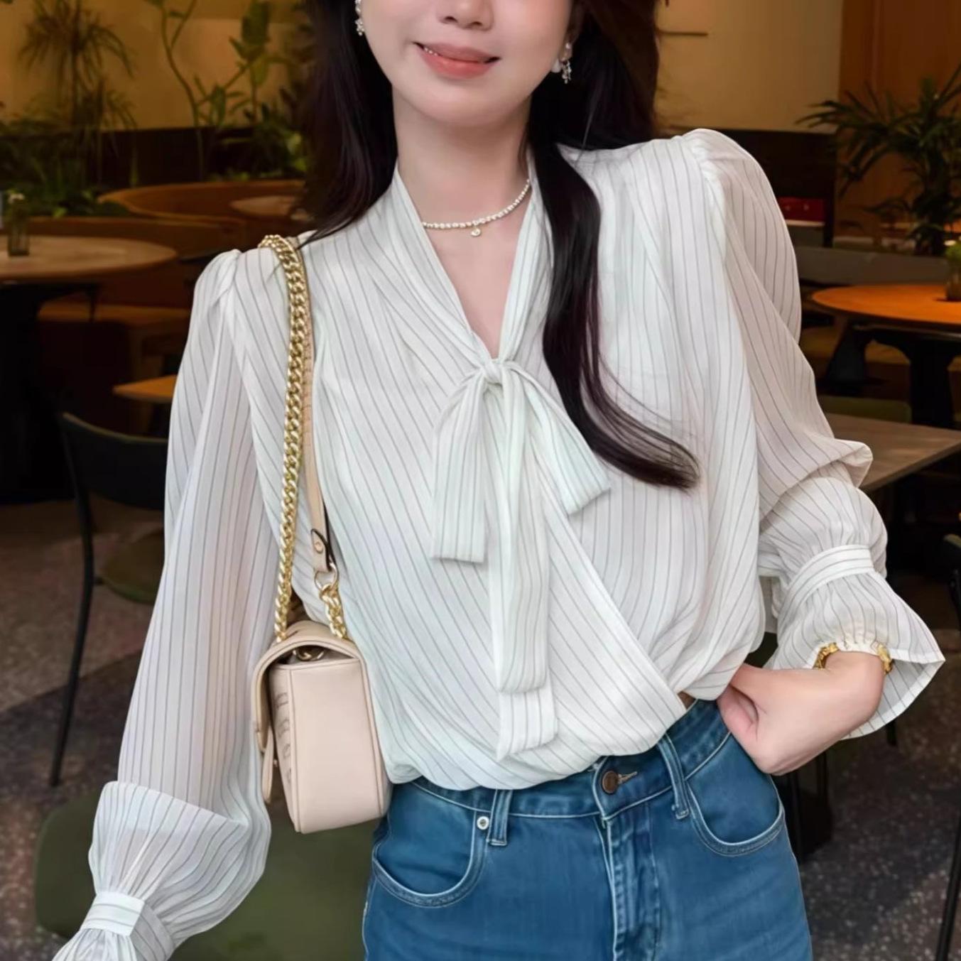 Camisa Francesa Suave Rayada con Cuello en V y Lazo de Manga Larga para Mujer 2025 Nuevo Otoño Lujo Ligero Versátil para Ir al Trabajo
