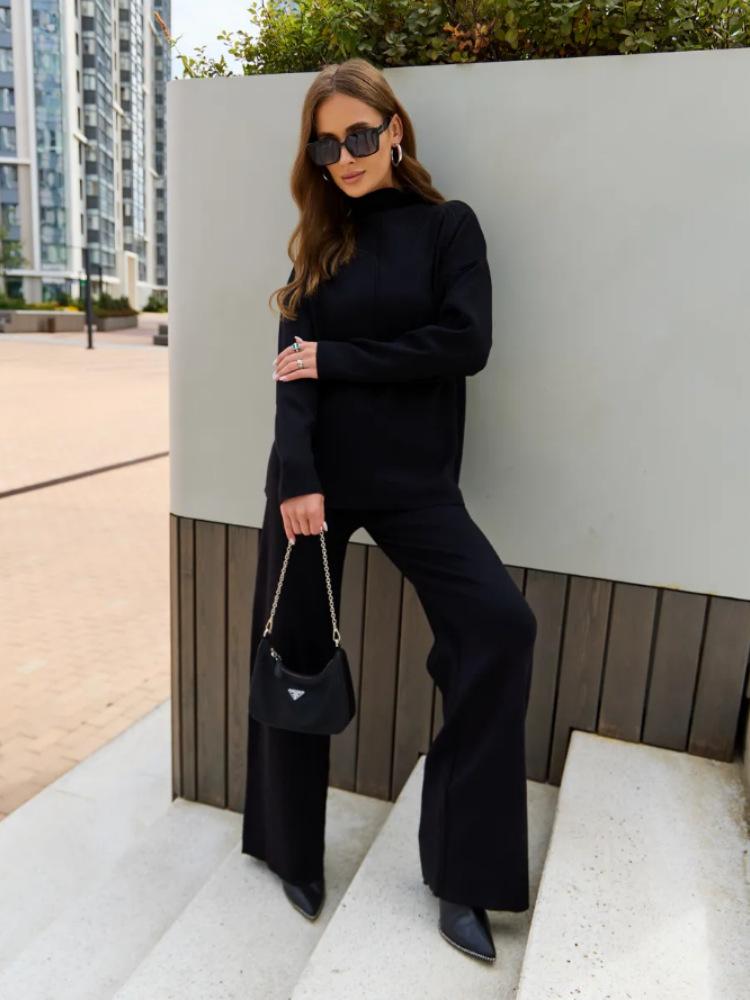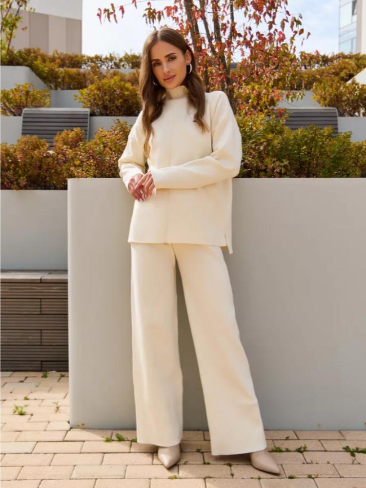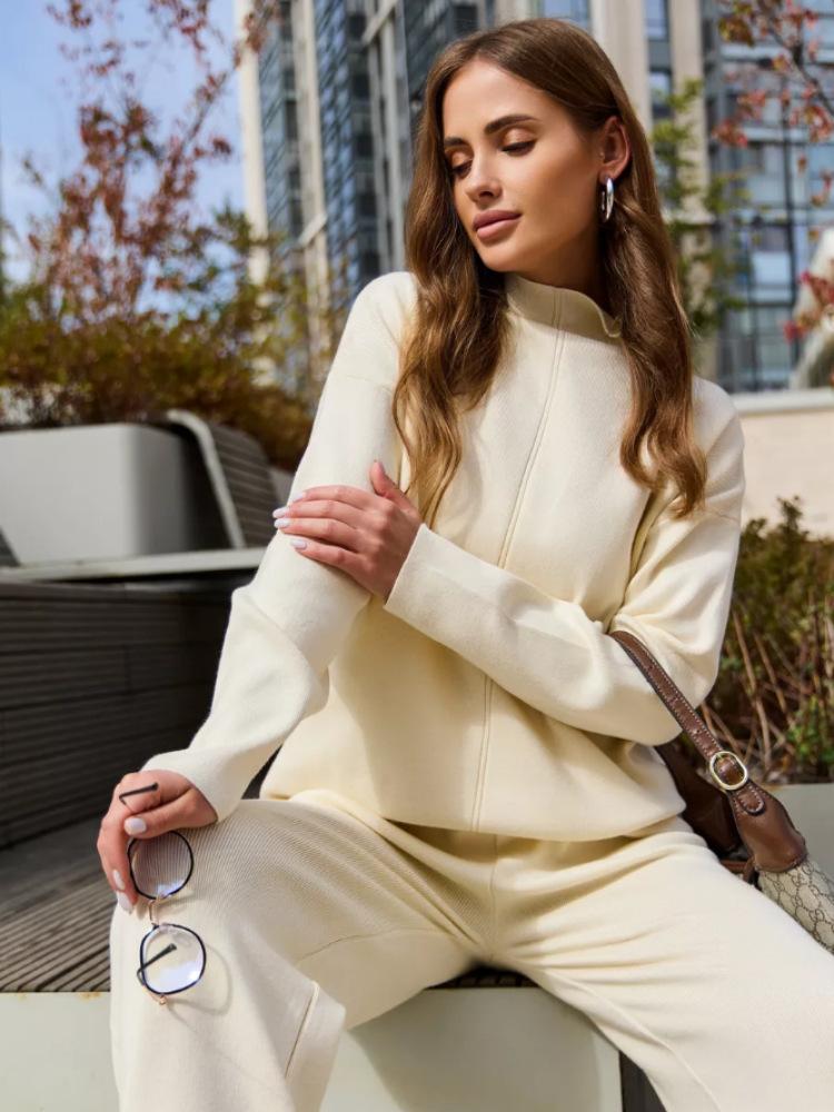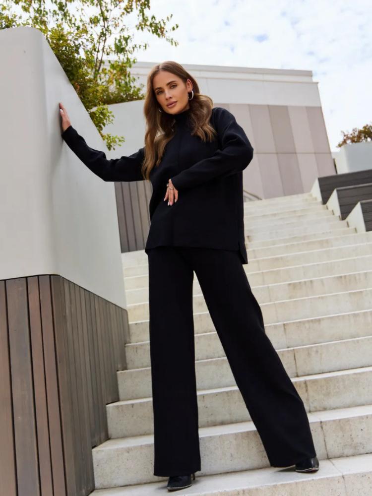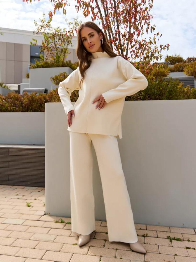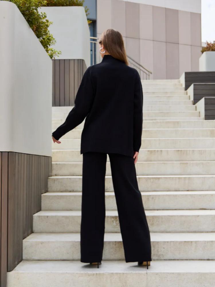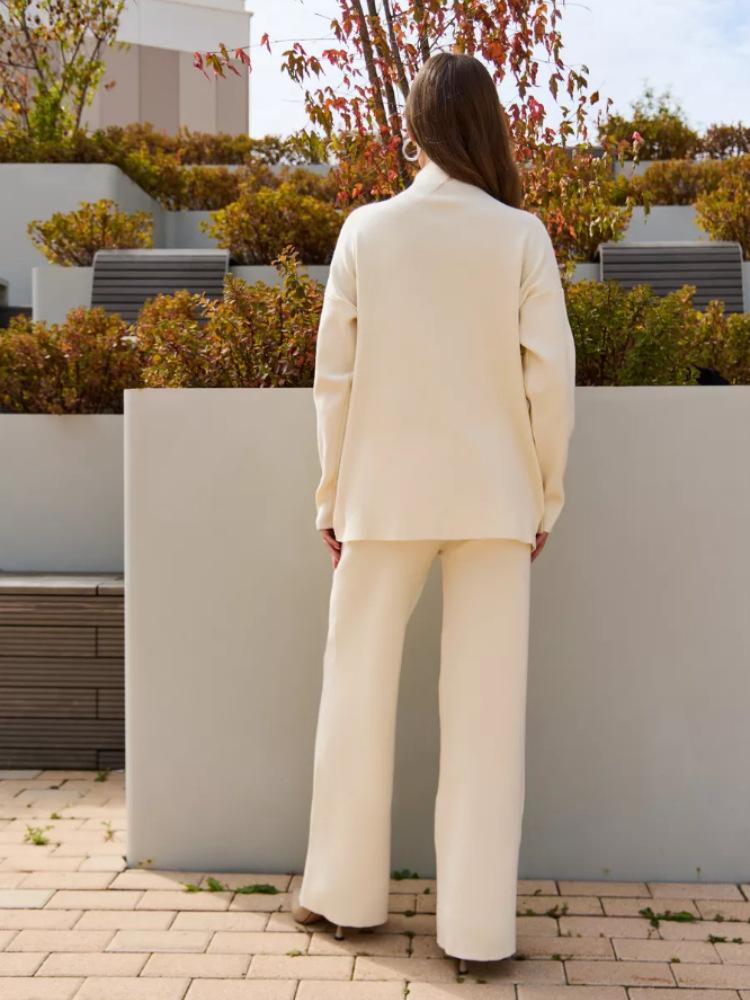 Nuevo Otoño/Invierno Comercio Exterior Transfronterizo Moda Sentido de Alta Gama Abrigo Suéter Pantalones Largos de Pierna Ancha Conjunto de Punto de Dos Piezas para Mujer