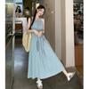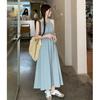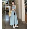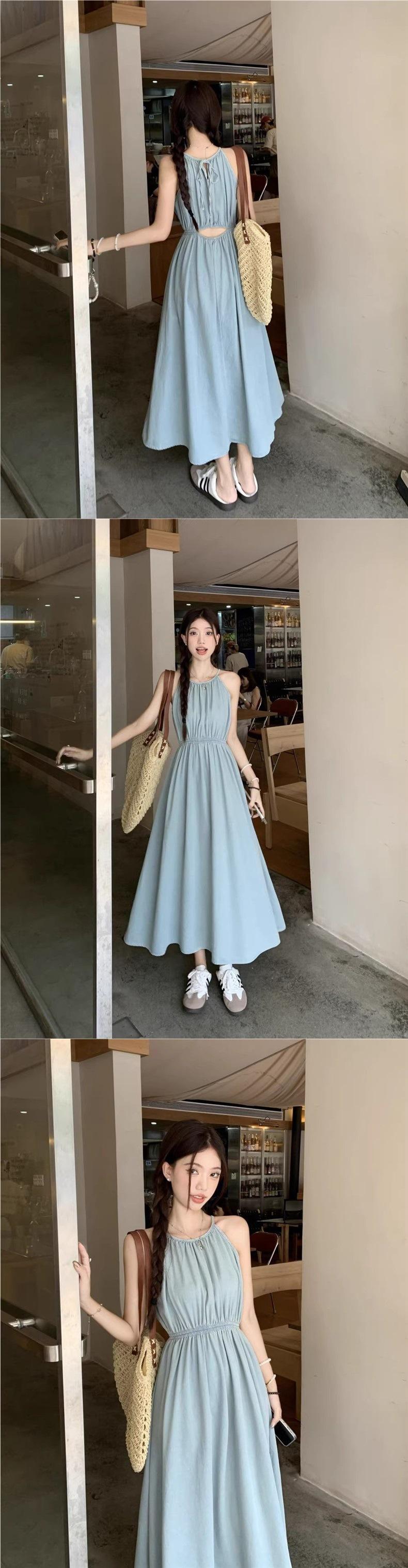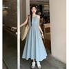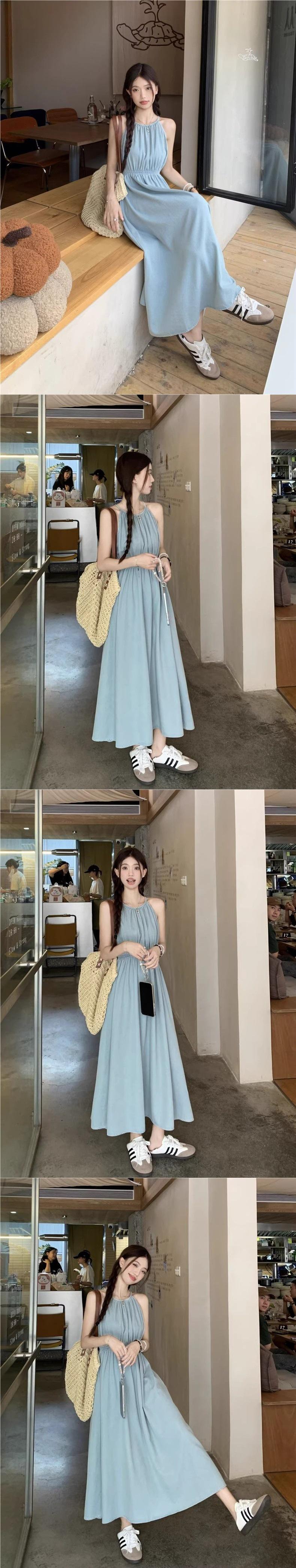 Vestido azul francés con cuello halter y tirantes para mujer, nuevo estilo de verano, estilo vacaciones playeras, vestido largo sin mangas para playa