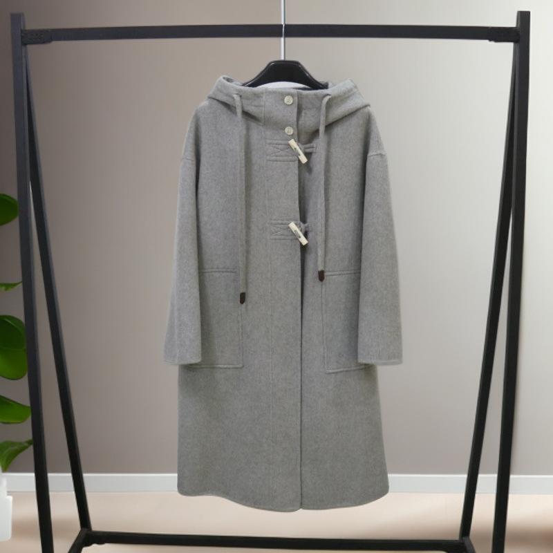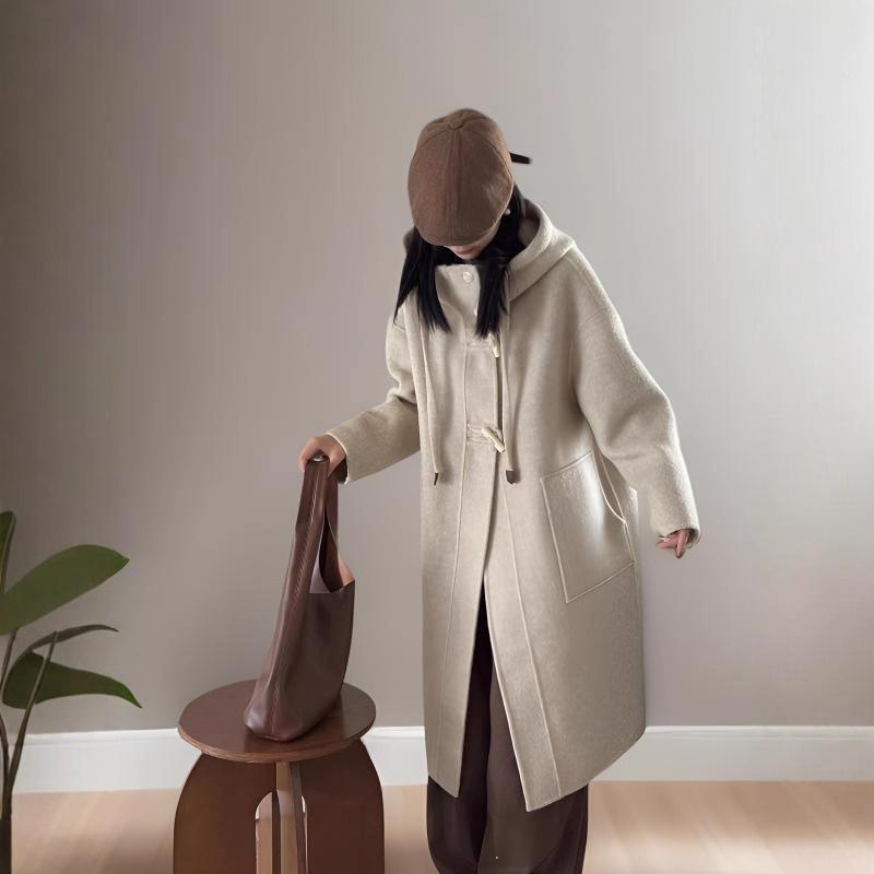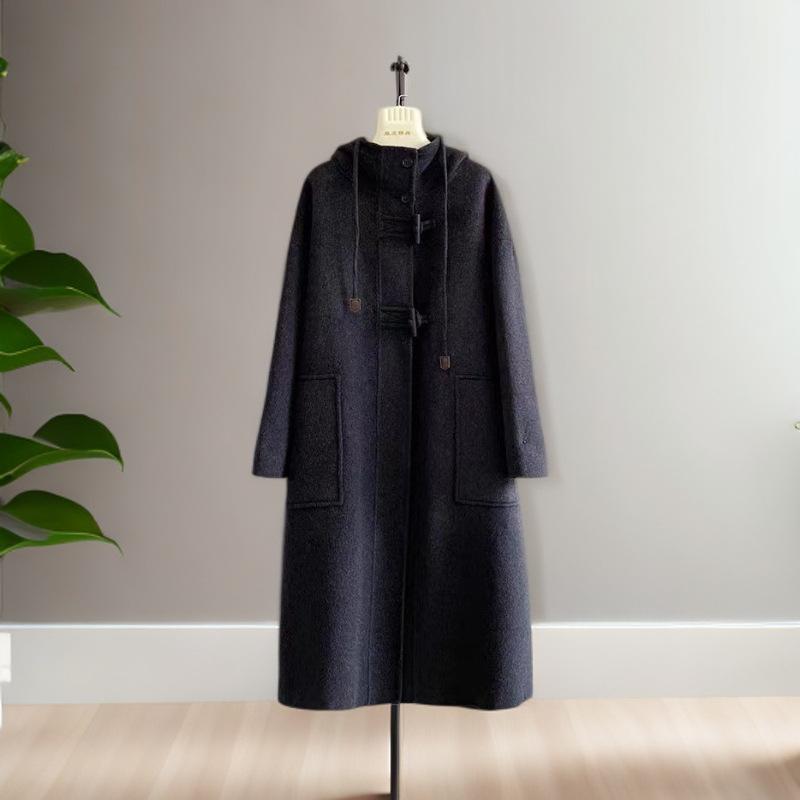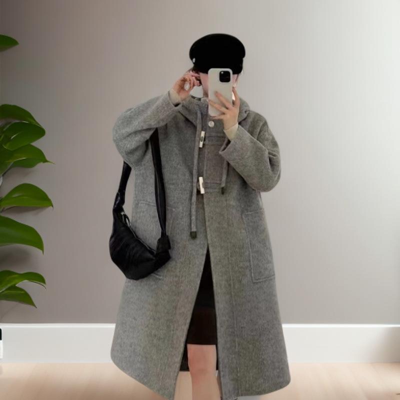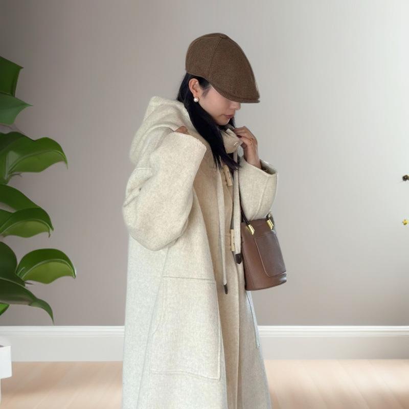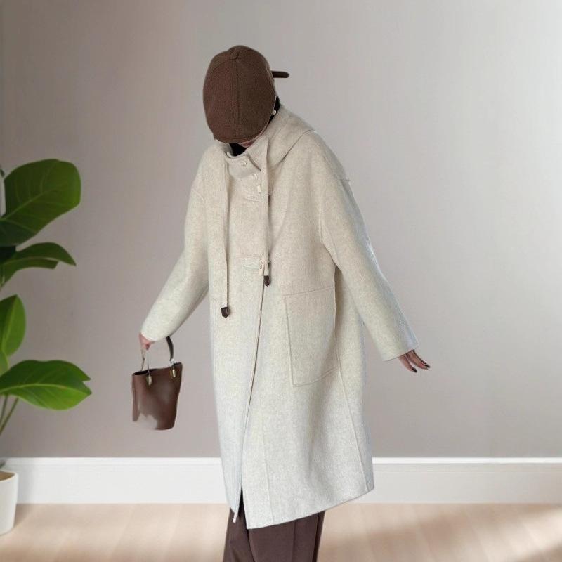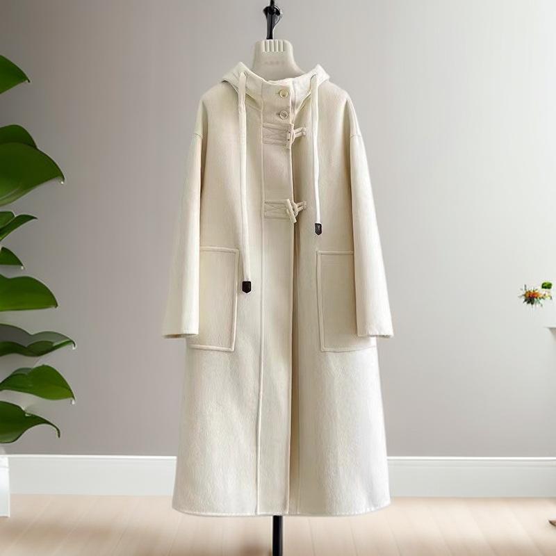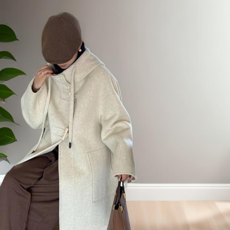 Abrigo de Invierno/Otoño 2025 para Mujer Estilo Coreano Cashmere Doble Faz con Capucha y Toggles Mezcla Gruesa de Lana Estilo Temperamental para Ir al Trabajo