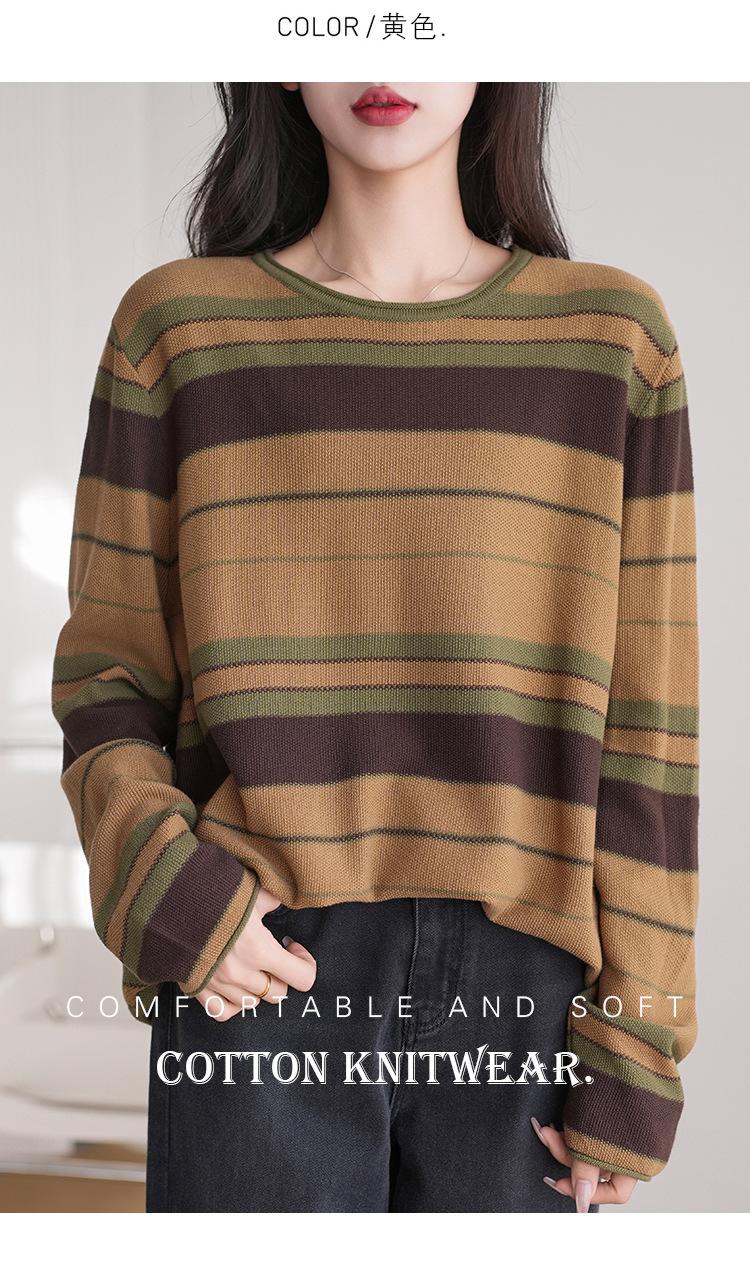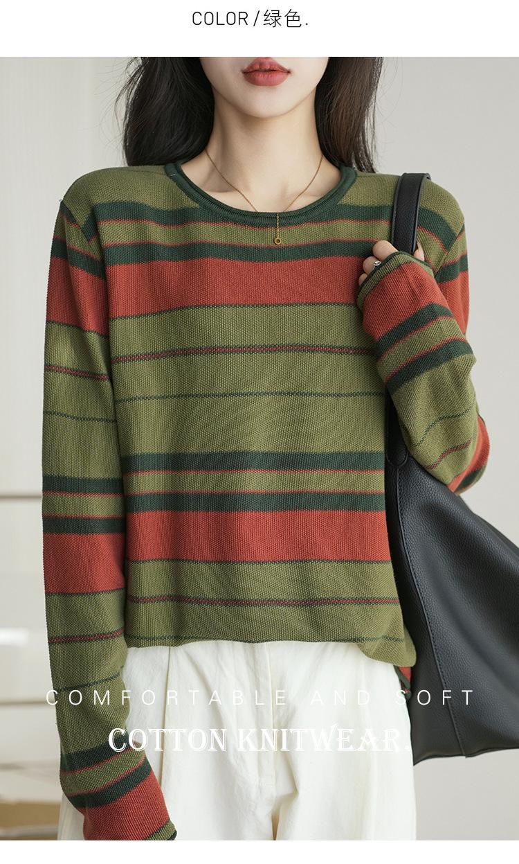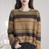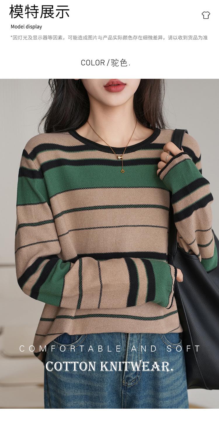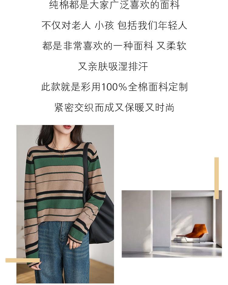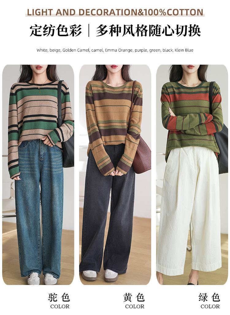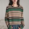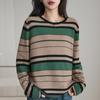 2025 primavera nuevo suéter de cuello redondo de algodón puro manga larga rayas a juego de color holgado versátil jersey camisa básica