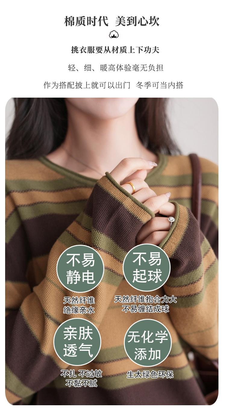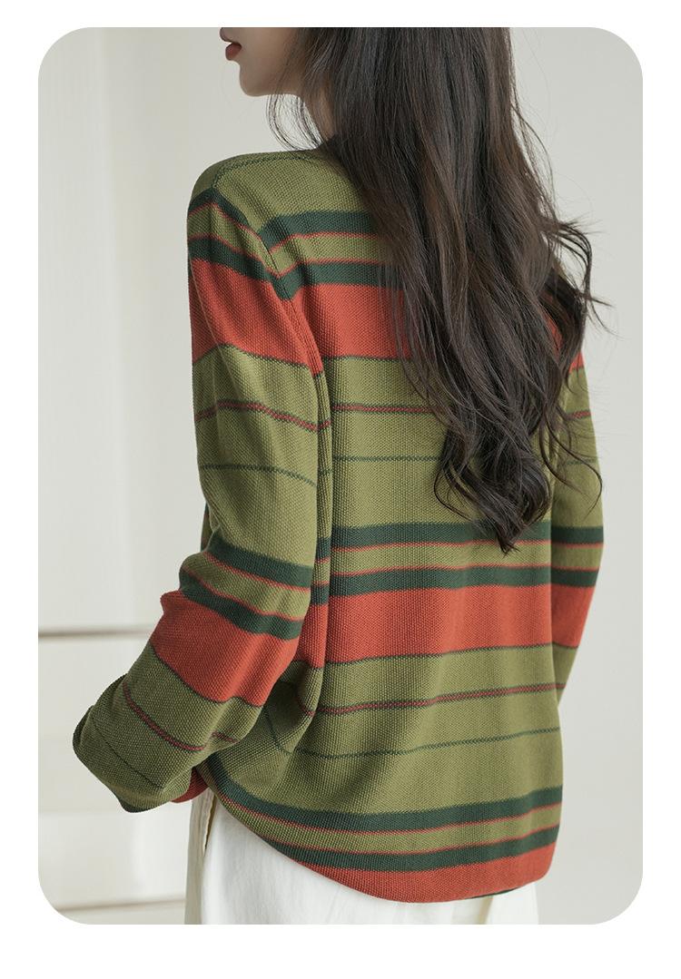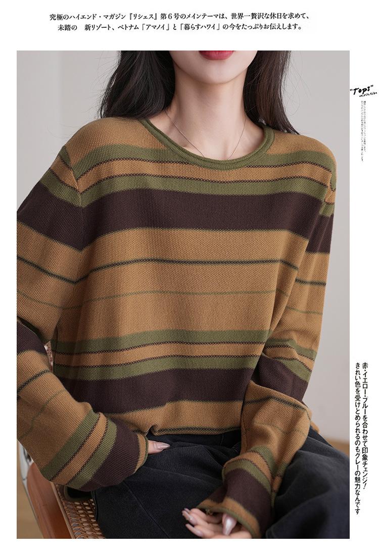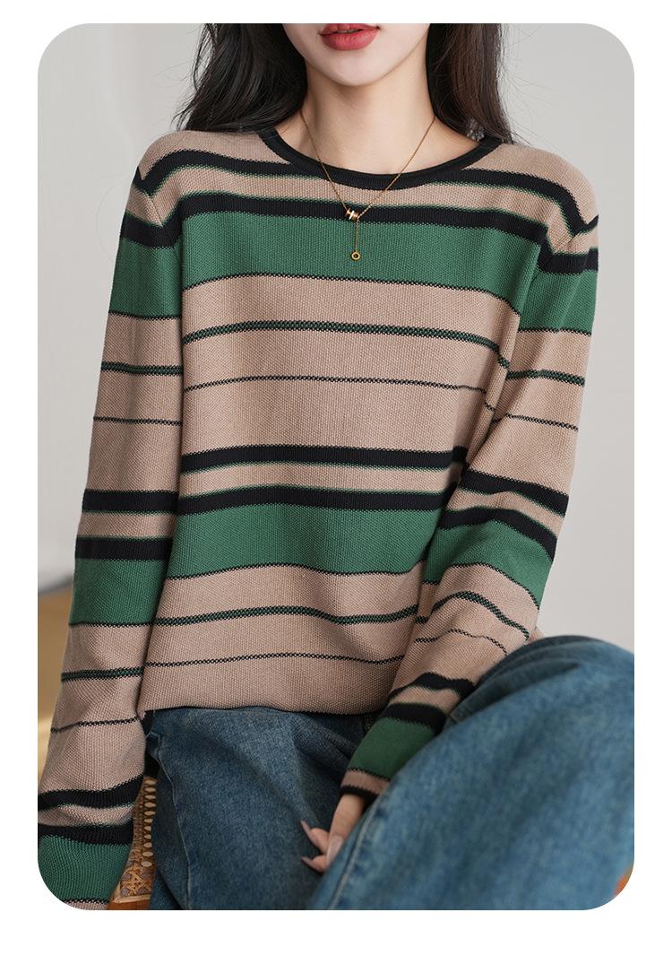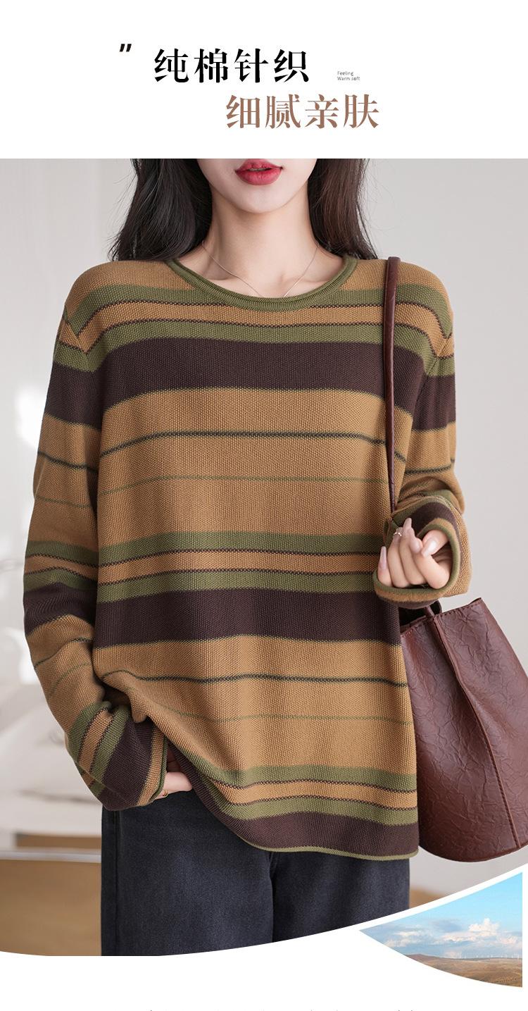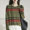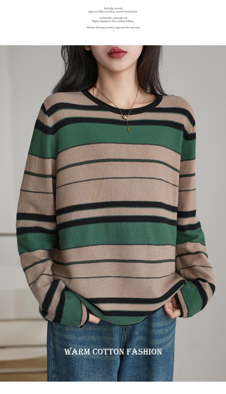 2025 primavera nuevo suéter de cuello redondo de algodón puro manga larga rayas a juego de color holgado versátil jersey camisa básica