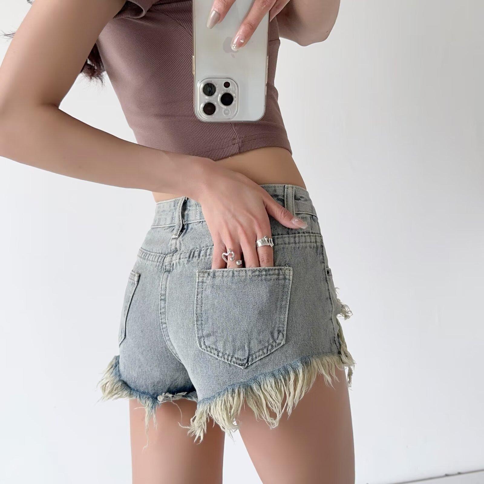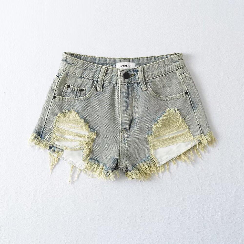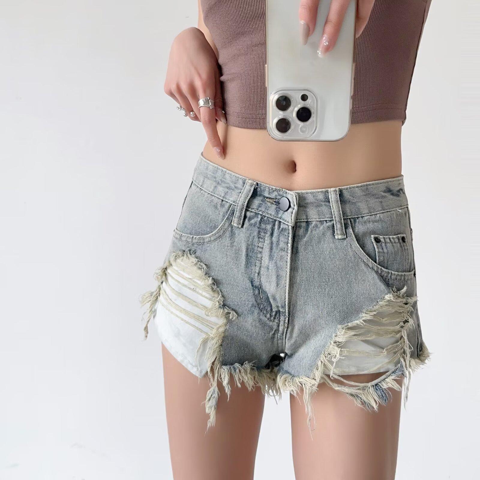 Shorts de mezclilla retro americanos para mujer 2024 nuevos de verano con agujeros rasgados sexy modernos pantalones cortos calientes jeans rasgados