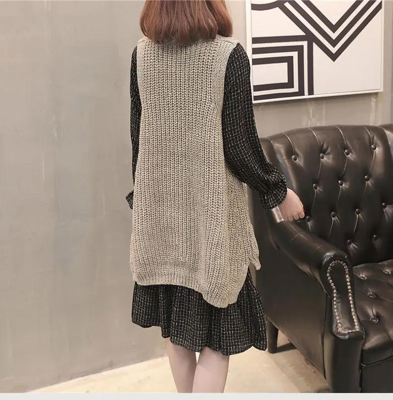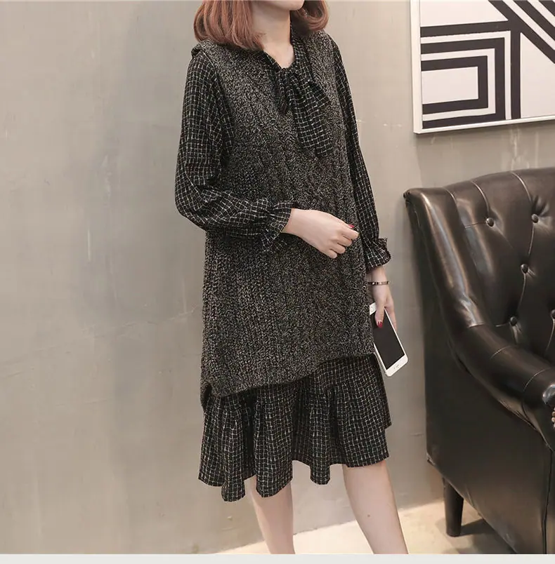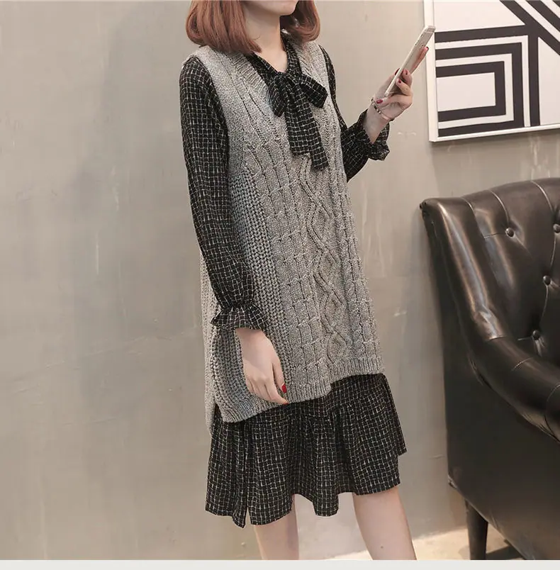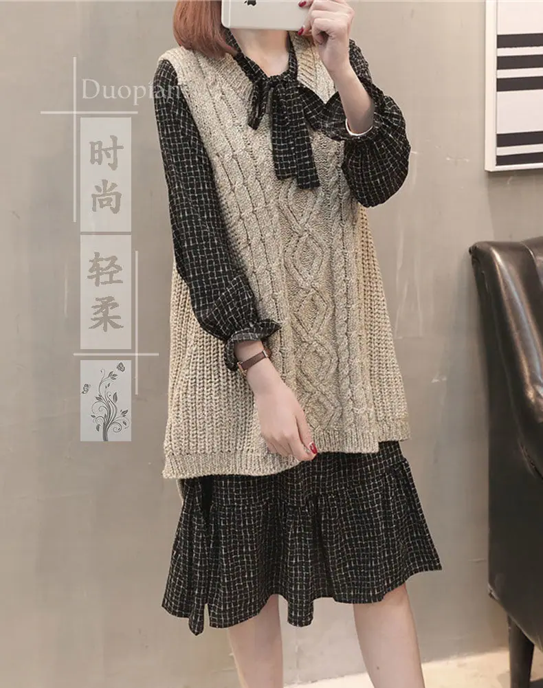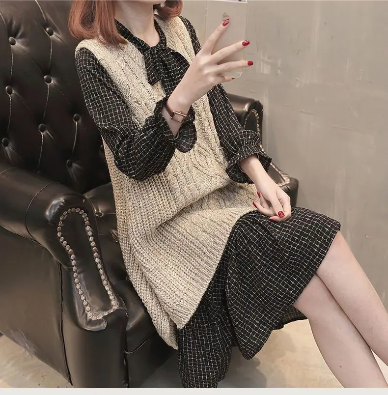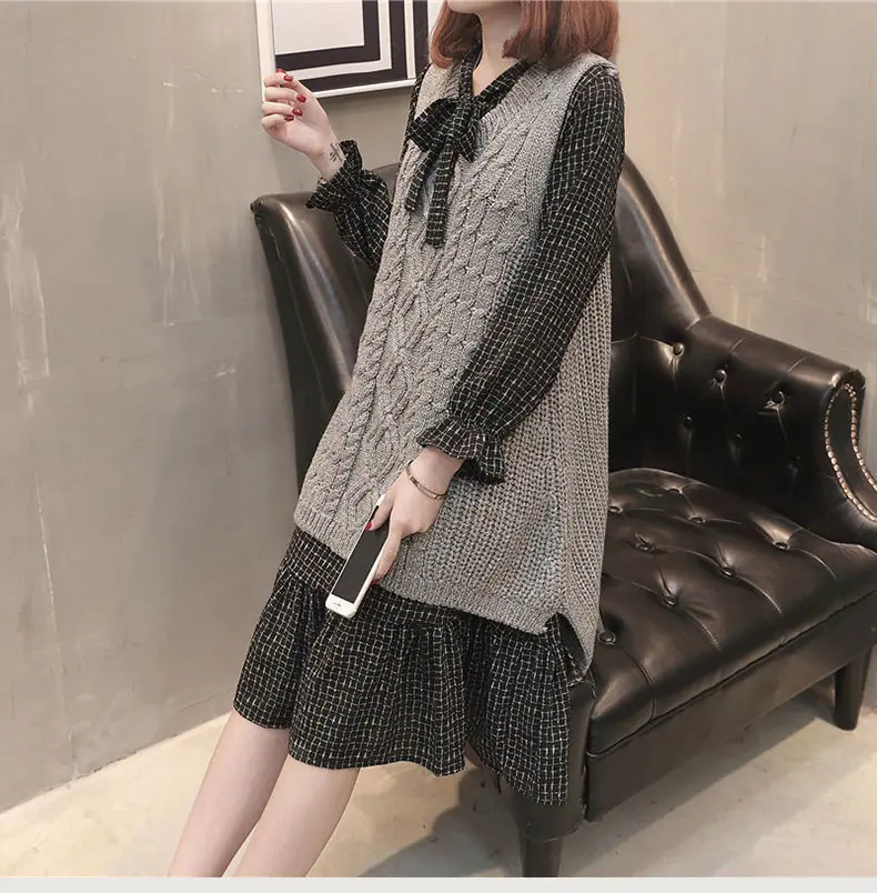 2025 Nuevo Otoño Primavera para Mujer Talla Grande Suéter Holgado Adelgazante Vestido Conjunto de Dos Piezas Vestido de Punto para Chica Gorda
