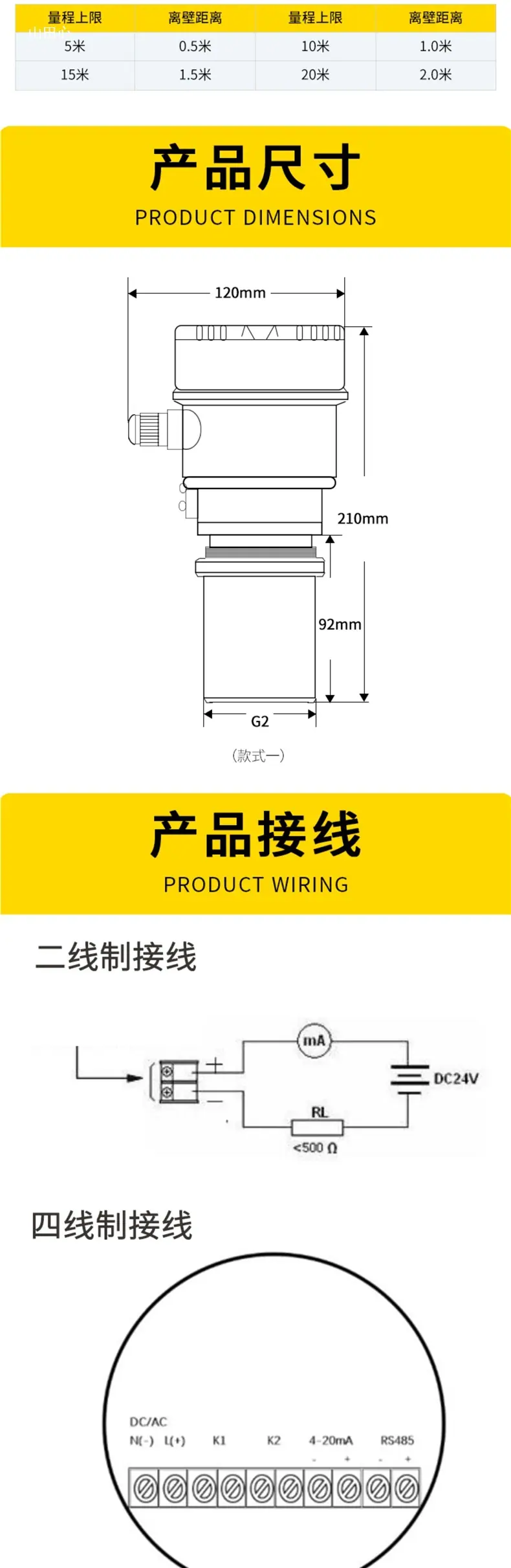 0~5 meters Two-wire 4~20mA DC24V High-volume model