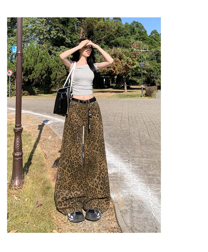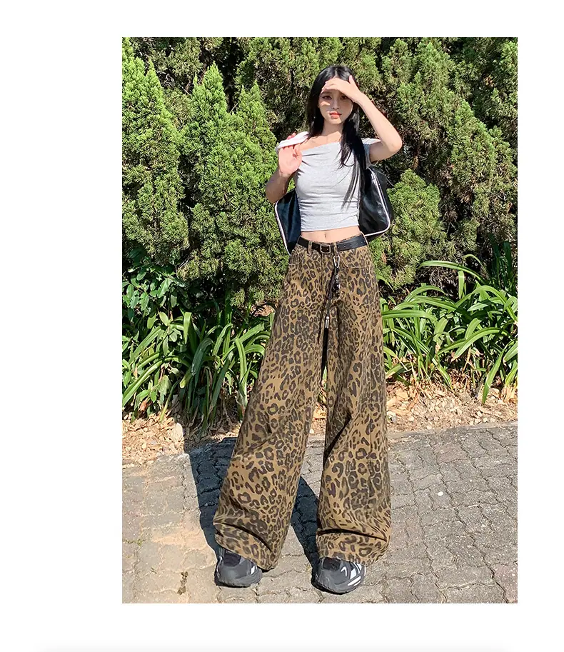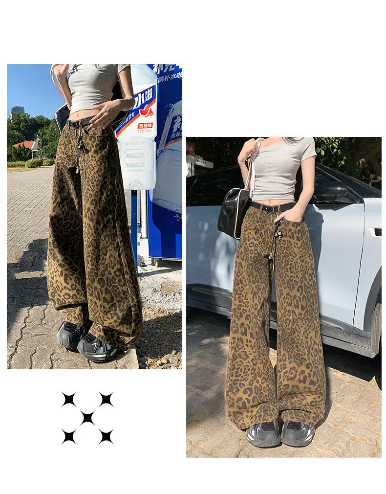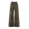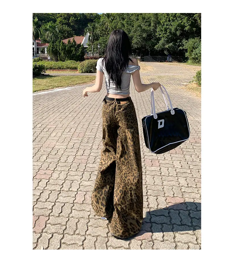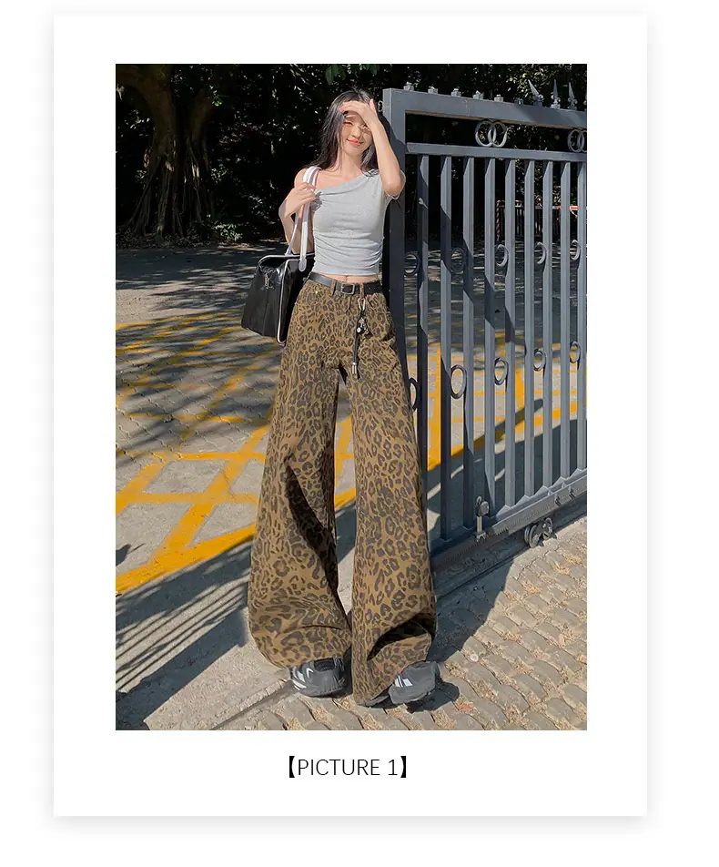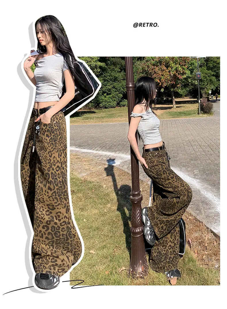 Primavera Nuevo Diseño de Moda Estampado Leopardo Suelto Combinable Pantalones de Pierna Ancha para Mujer Estilo Americano Retro Moderno Recto Casual