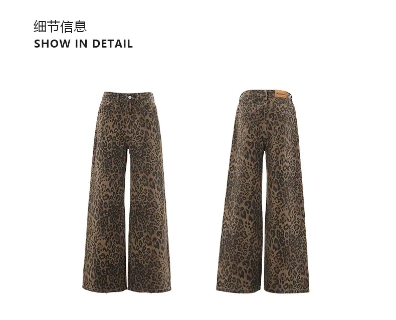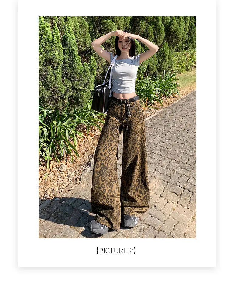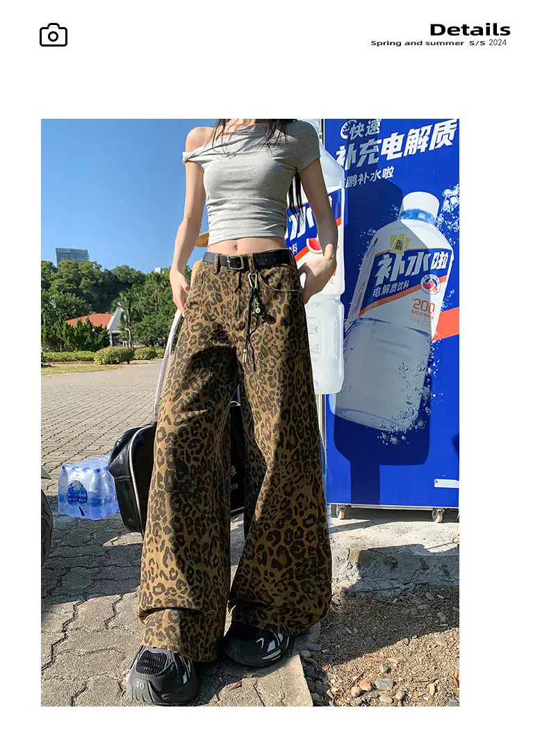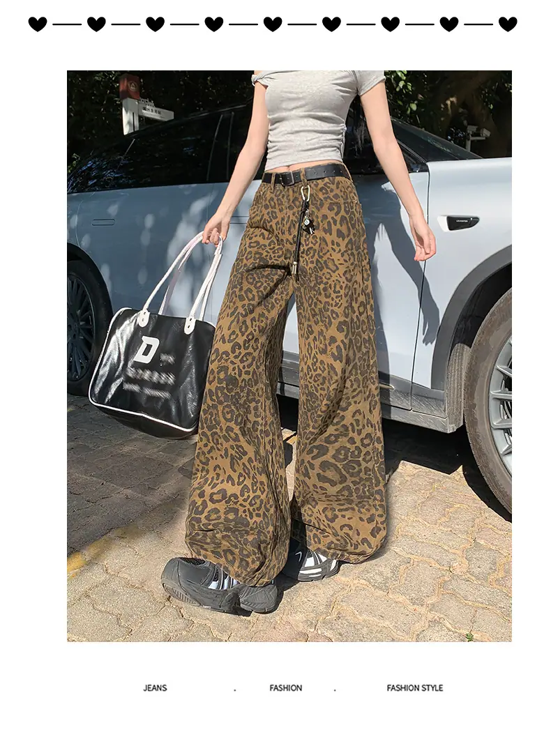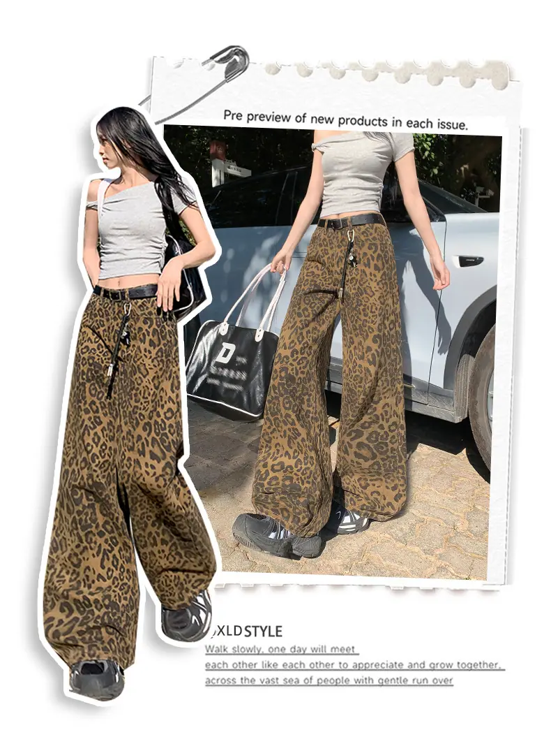 Primavera Nuevo Diseño de Moda Estampado Leopardo Suelto Combinable Pantalones de Pierna Ancha para Mujer Estilo Americano Retro Moderno Recto Casual