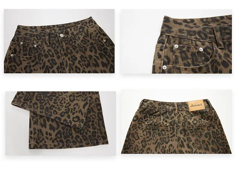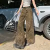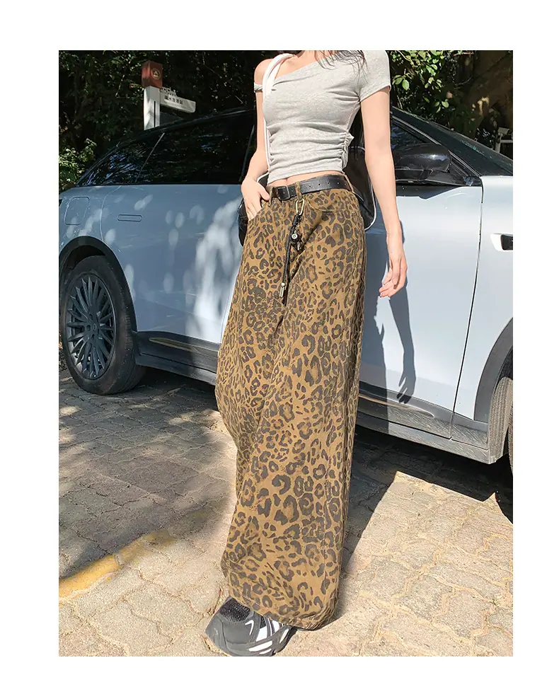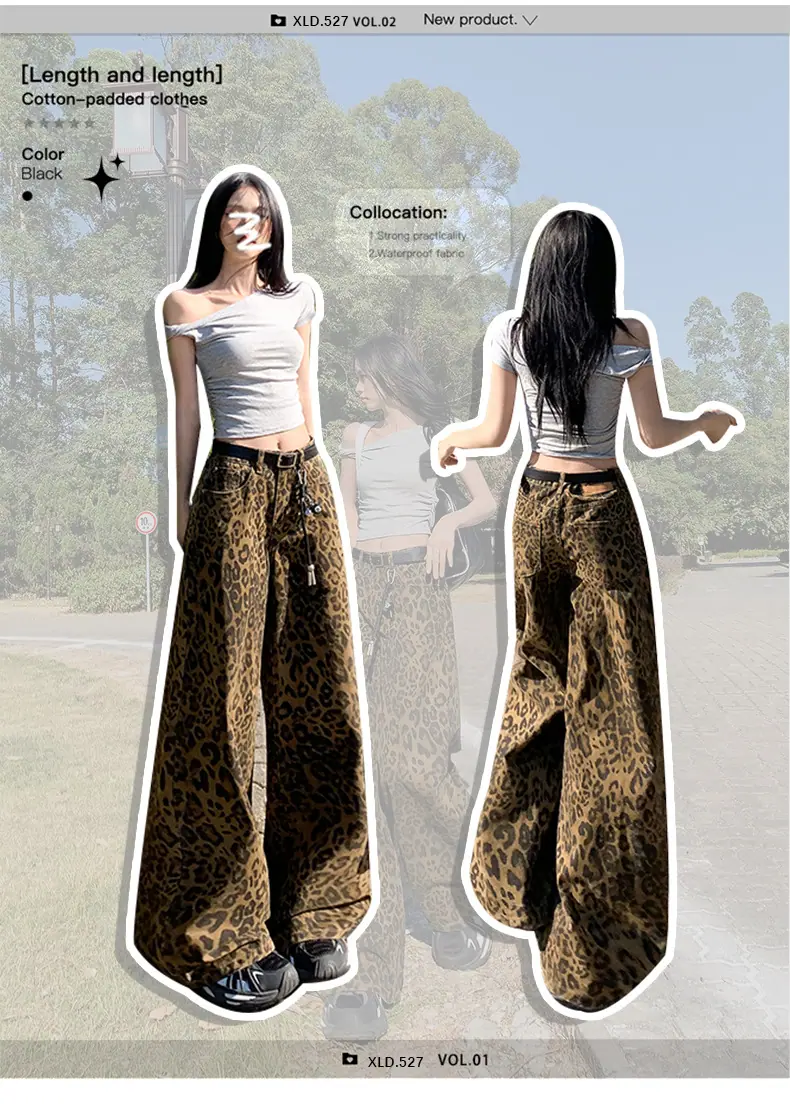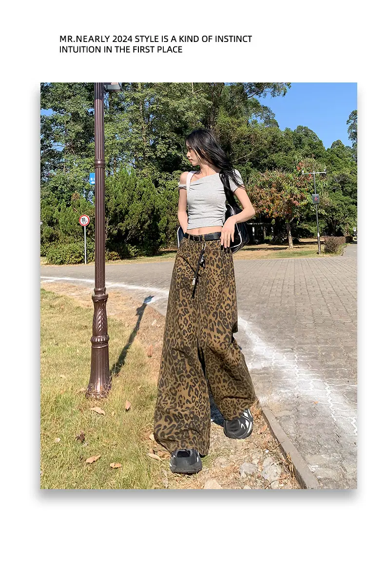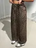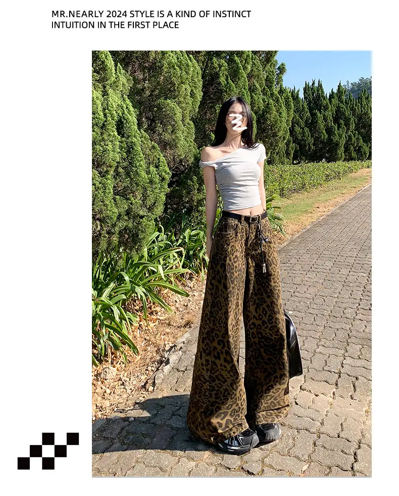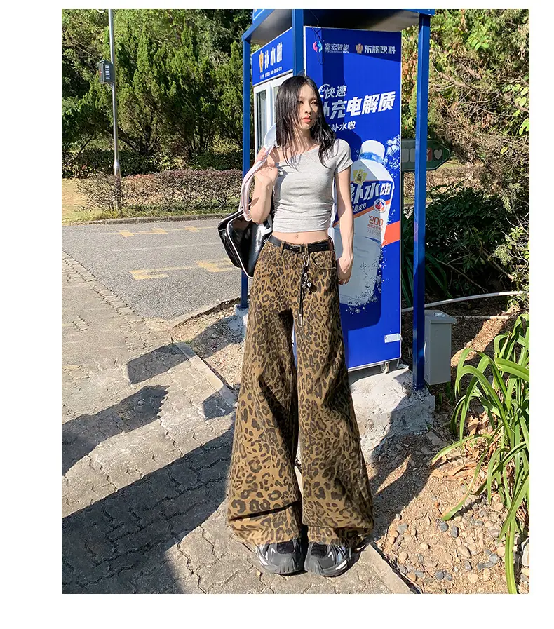 Primavera Nuevo Diseño de Moda Estampado Leopardo Suelto Combinable Pantalones de Pierna Ancha para Mujer Estilo Americano Retro Moderno Recto Casual