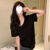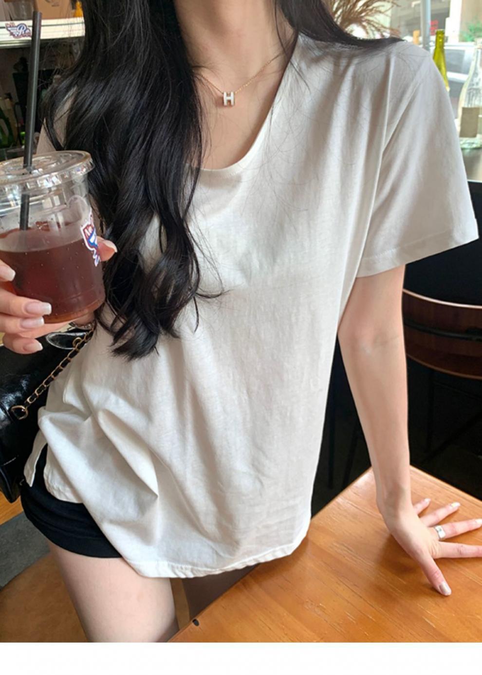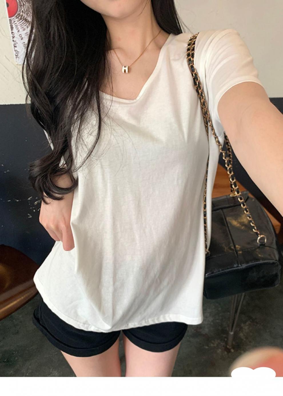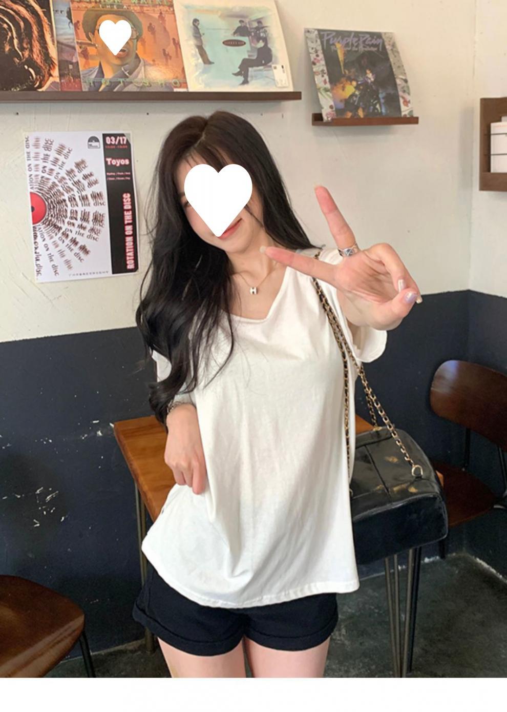Compra Playera básica suelta de manga corta con cuello en V y hombro ancho de color sólido simple para mujer, verano 2024, nueva al por mayor en Joom.pro