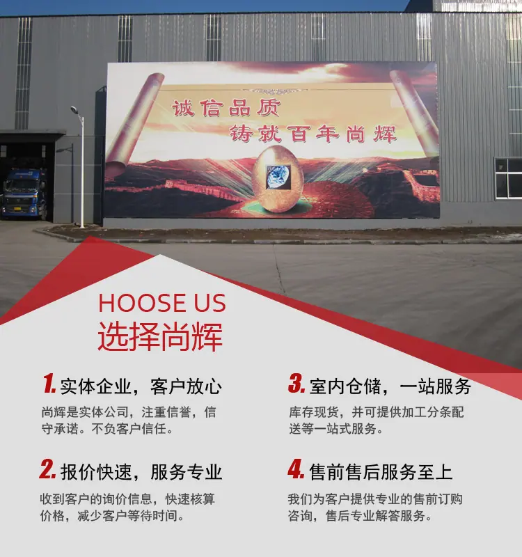 Shanghui (Tianjin) Metal Materials Co., Ltd. es una empresa de logística integral que integra comercio de importación y exportación, almacenamiento y distribución de productos de acero. Actualmente, Shanghui ha establecido oficinas en muchas acerías. Con una sólida red de marketing, Shanghui actualmente tiene una escala anual de almacenamiento y ventas de más de 500,000 toneladas de diversos materiales de acero, y se encuentra en una posición de liderazgo en el campo de la logística del acero.